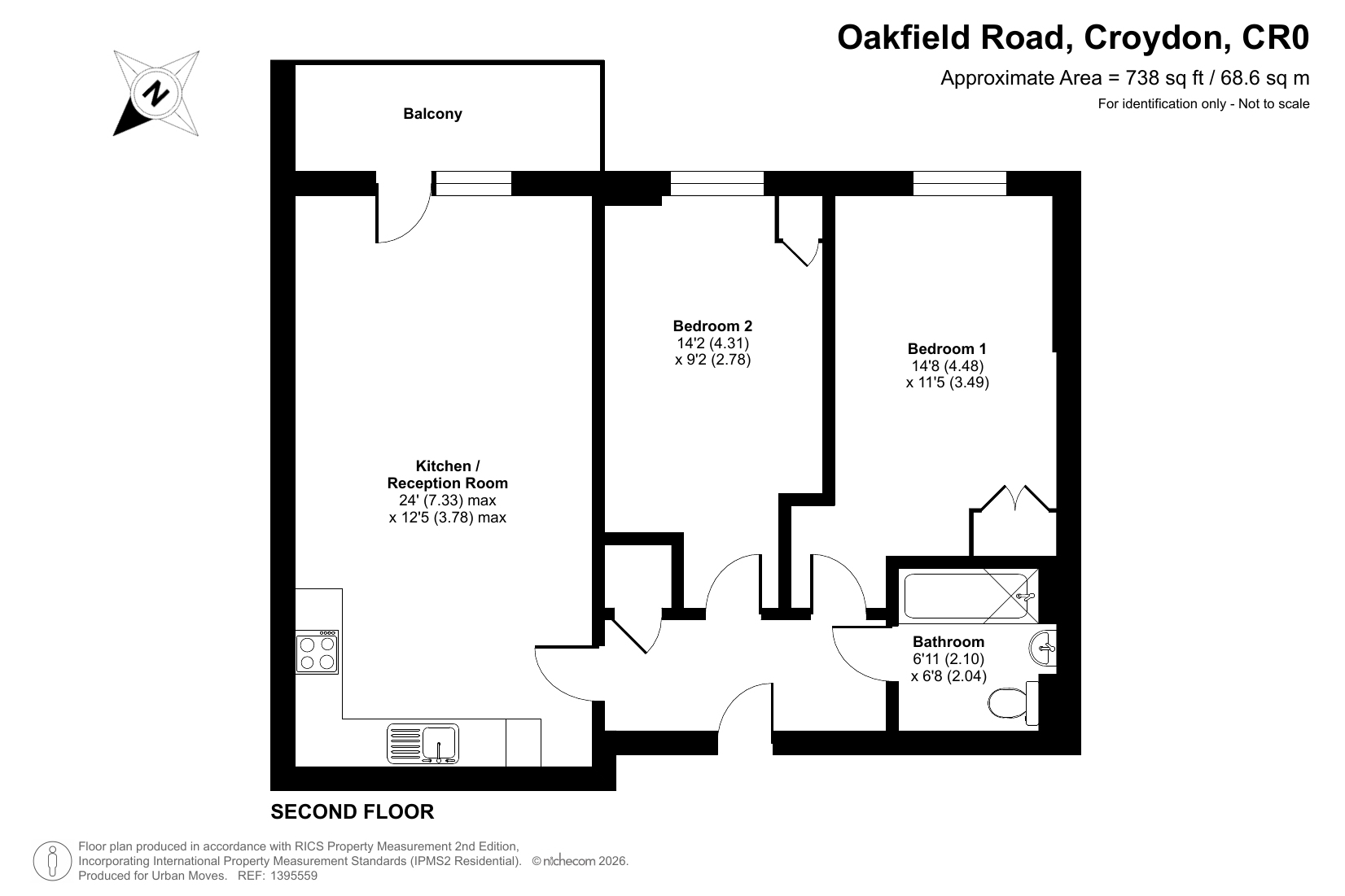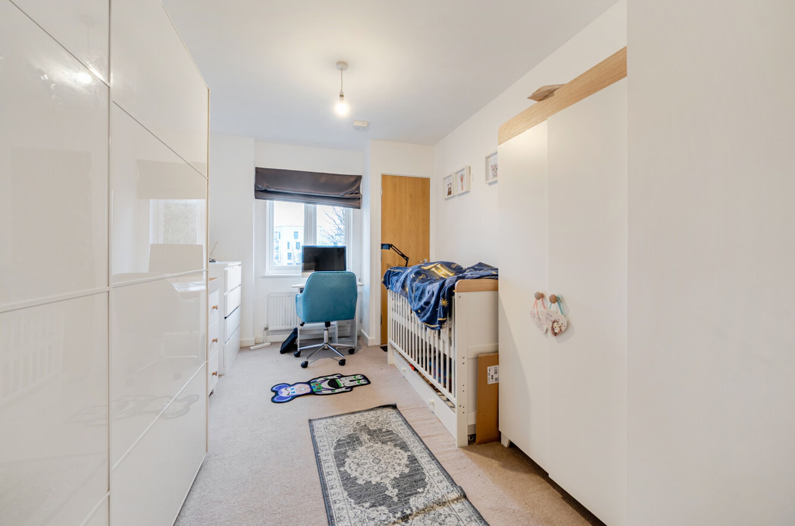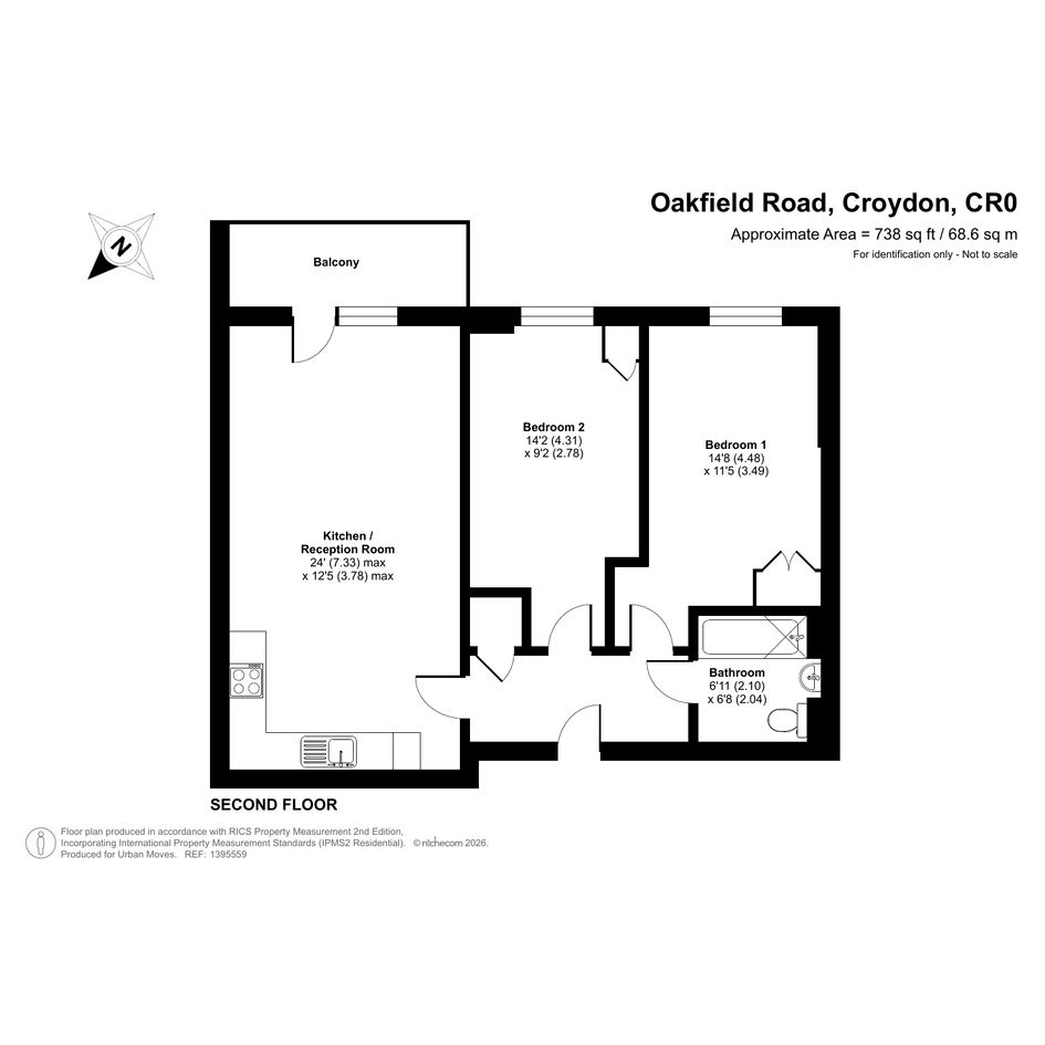 A spacious, second-floor apartment which features a twenty-four-foot, open-plan kitchen/reception room with rear (east/south-east) facing balcony. The two bedrooms are both comfortable doubles and the bathroom simple and modern. Well insulated walls, double glazing and gas central heating make for a good energy-efficiency rating. Bourchier House has a communal garden, a communal terrace at third floor level and a bike store. West Croydon Station is just minutes away and East Croydon is also within easy walking distance as is the nearest tram stop. The Whitgift and Centrale Shopping Centres are nearby, along with a wide range of other stores and amenities.