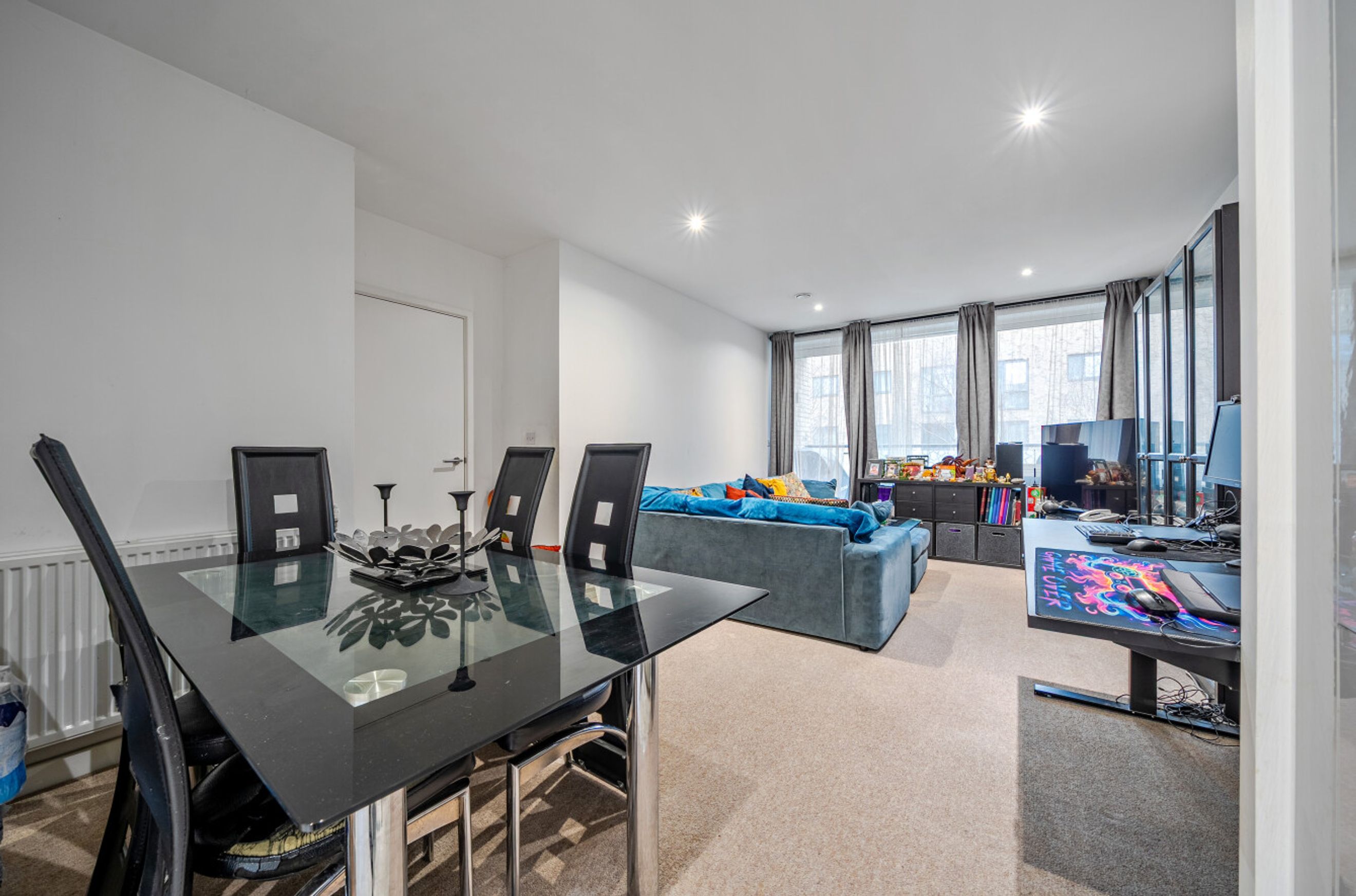 Inside, the property boasts approximately 800 sq ft of internal space, enhanced by double‑glazed floor‑to‑ceiling windows that flood the home with natural light. The spacious open‑plan living and dining area opens onto a south‑facing private balcony, ideal for relaxing or entertaining. The modern fitted kitchen includes integrated appliances such as a built‑in oven, electric hob, and fridge‑freezer. A contemporary three‑piece family bathroom offers a shower over bath and a heated towel rail.