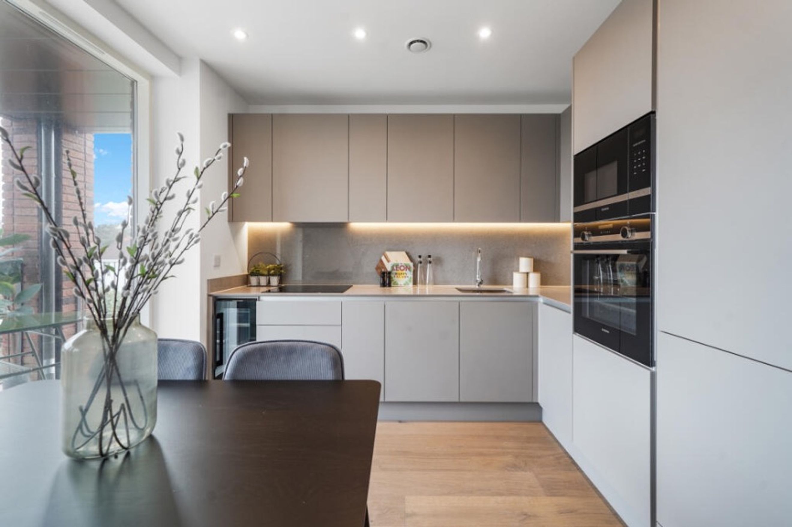- Contemporary designer kitchen units with handle-less soft close doors