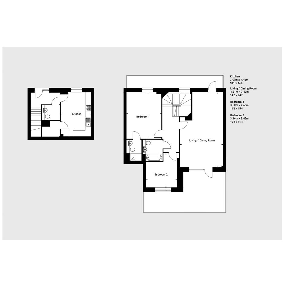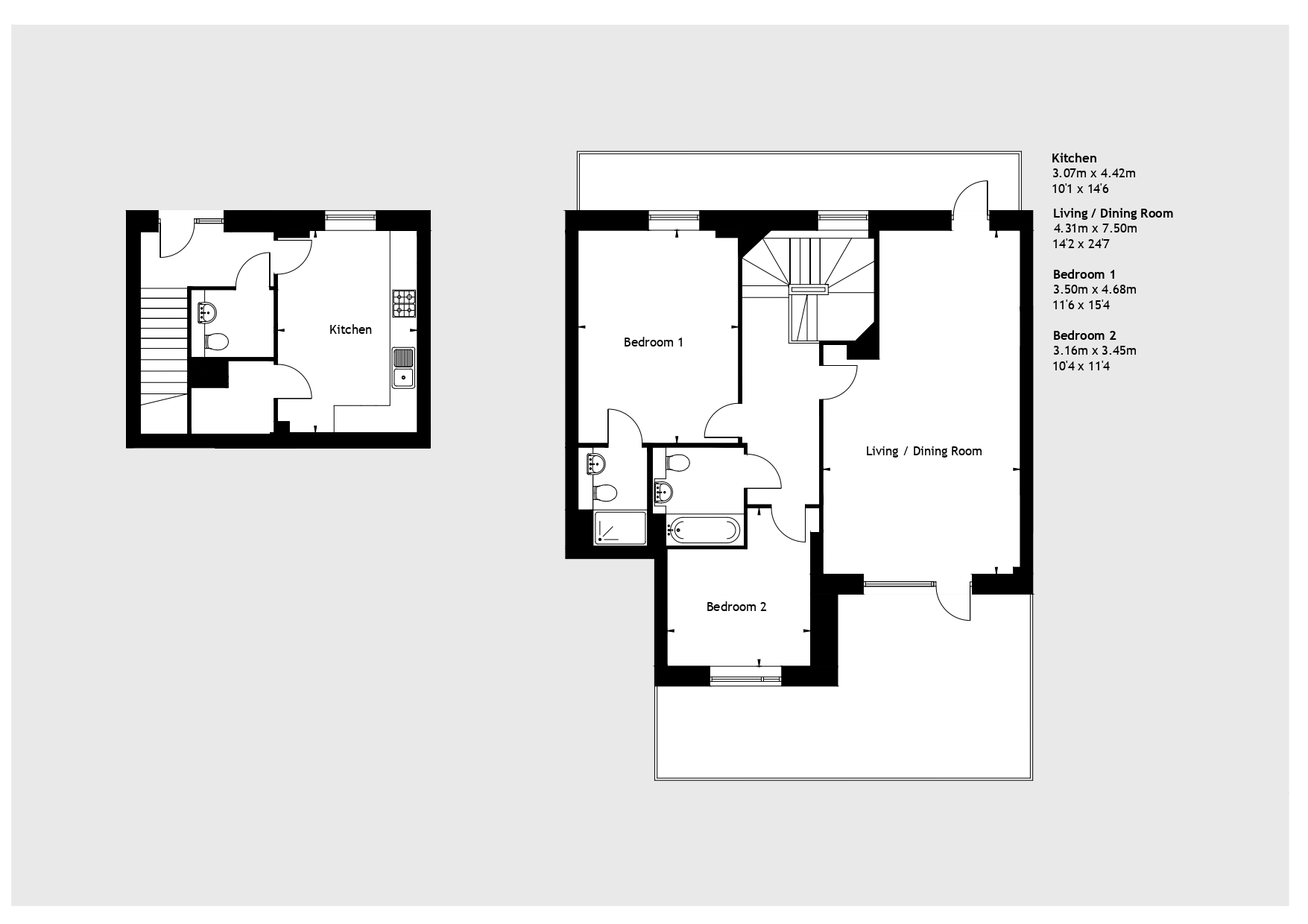 Upstairs, you'll find a spacious dual aspect living / dining room with doors out to your balconies, plus two comfortable bedrooms and a bathroom. The master bedroom features an ensuite and fitted wardrobe. The bathroom has a modern, white suite.