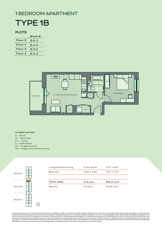 - Total area: 51.6 sq.m. / 555.41 sq.ft (excluding balcony)