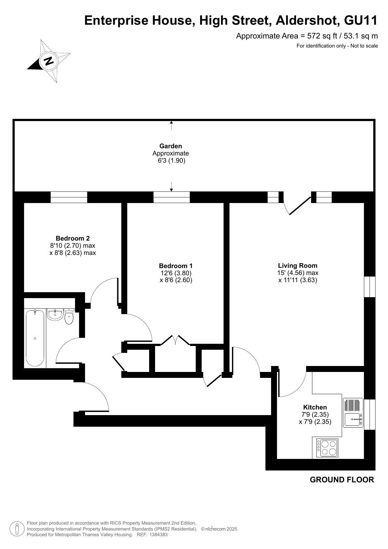 The ground-floor property comprises an entrance hall with storage cupboards, a large living room, a separate fitted kitchen, two bedrooms, and a bathroom.