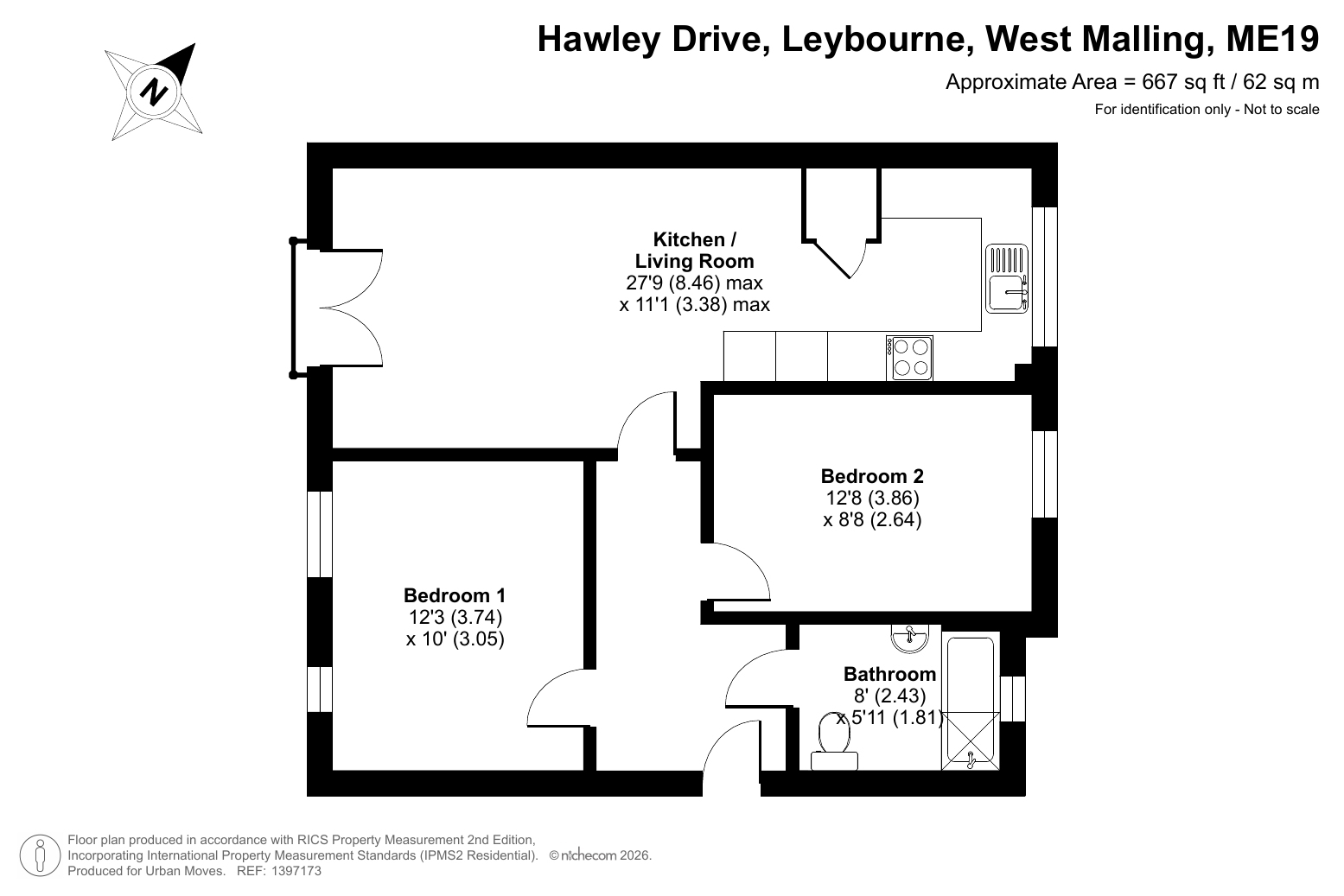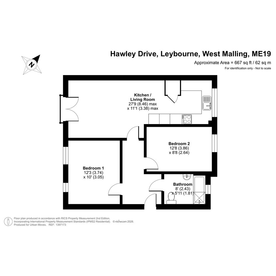 This first-floor flat features a twenty-seven-foot reception room with south-west-facing Juliette balcony and semi-open-plan kitchen area. There are two bedrooms, both of which are comfortable doubles, plus a naturally-lit bathroom. Well insulated walls, modern double glazing and gas central heating make for a good energy-efficiency rating. A parking area to the rear of the building includes a space allocated to this flat and the nearby A228 allows for easy north/south travel along with access to the M20 motorway. Alternatively, West Malling Railway Station, for services between Maidstone/Ashford and London Bridge/Waterloo East/Charing Cross/Victoria, can be reached via short bike ride. Valley Invicta Primary School, which is just minutes away, is Ofsted-rated 'Outstanding'.