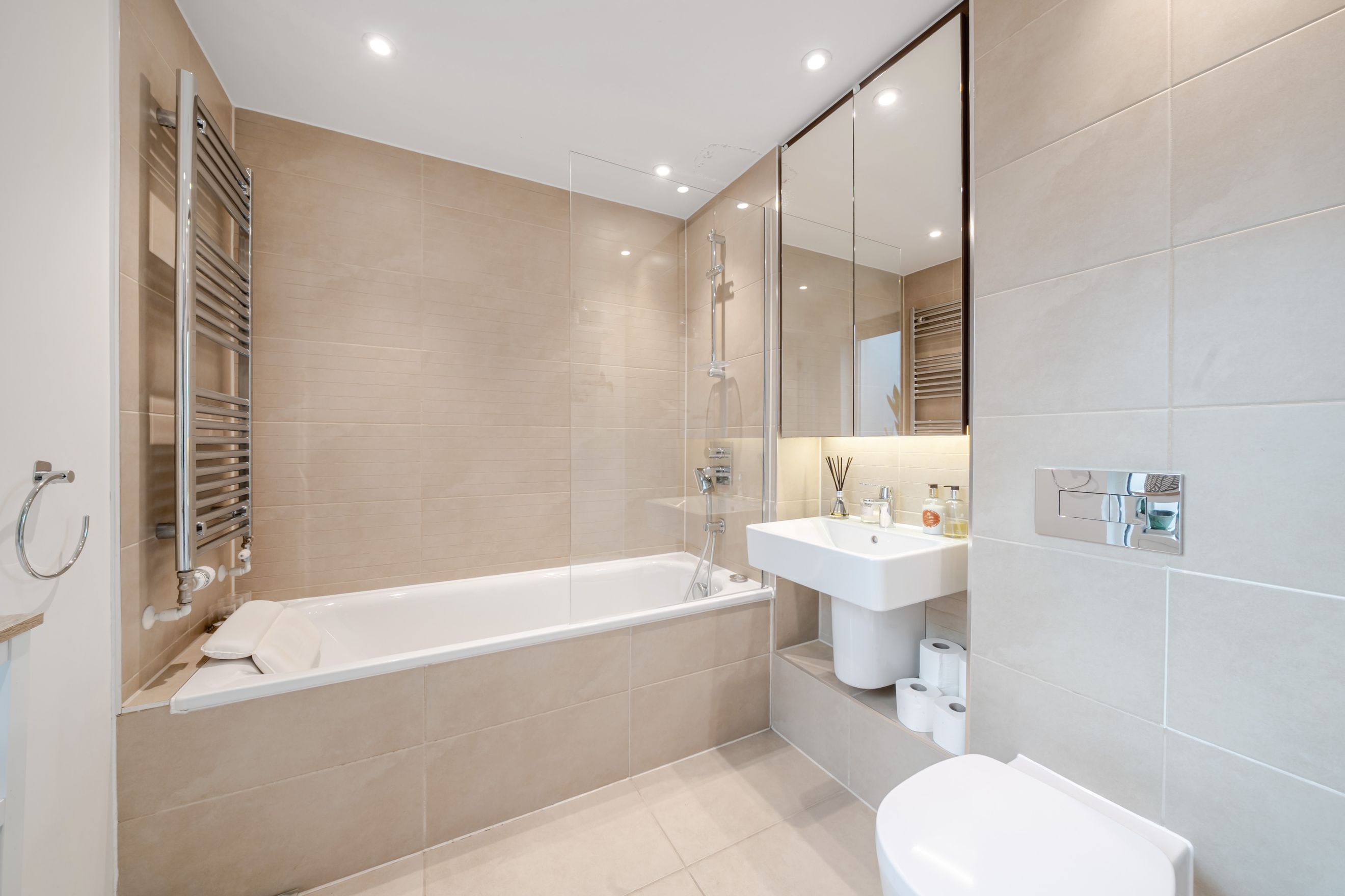 There are two well proportioned bedrooms, including a principal bedroom with an en suite and direct access to the private balcony. The apartment further benefits from a contemporary bathroom suite.