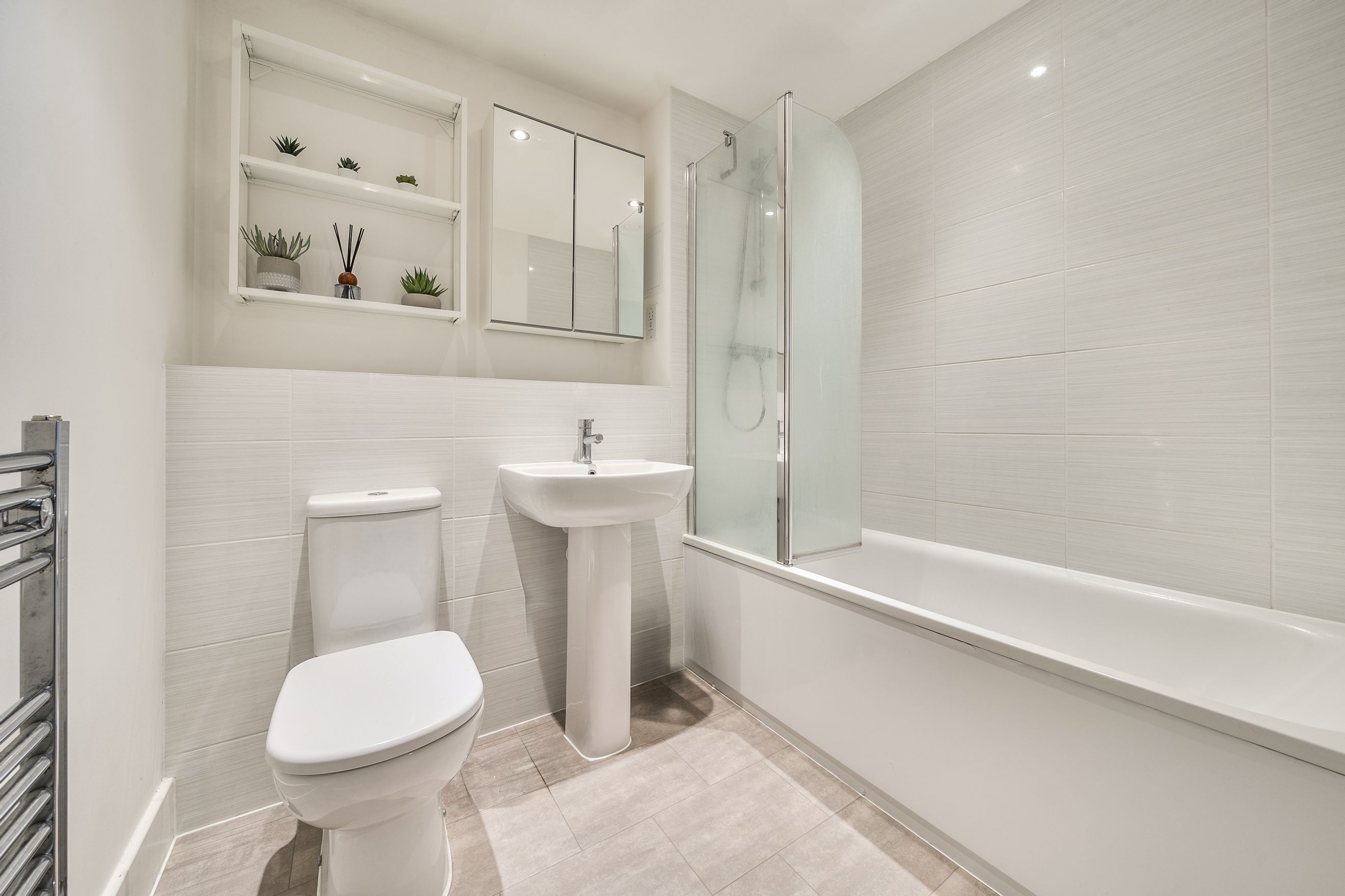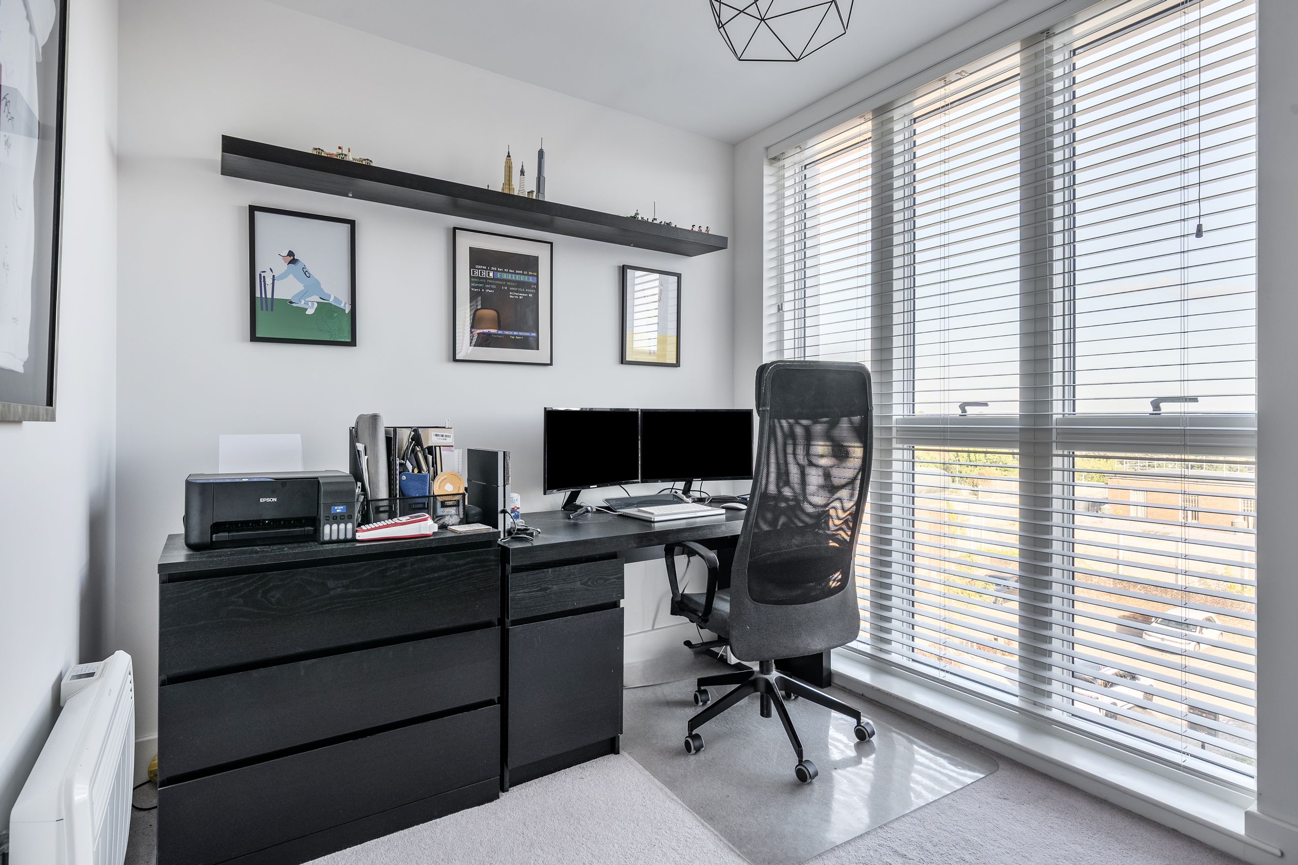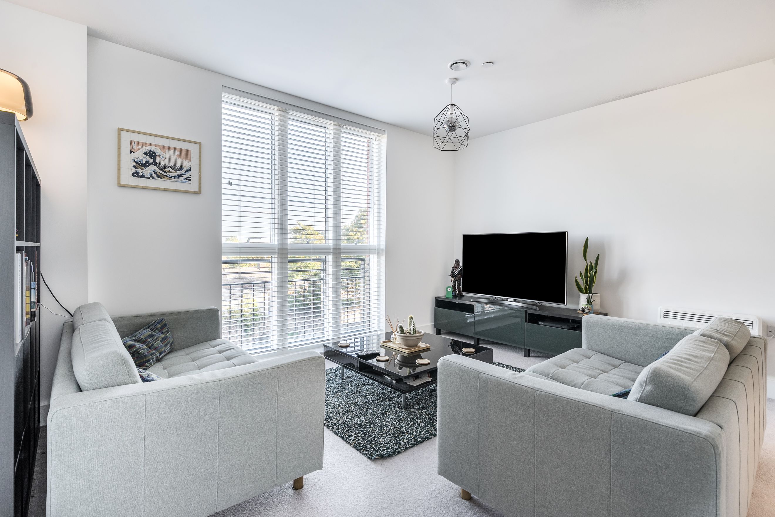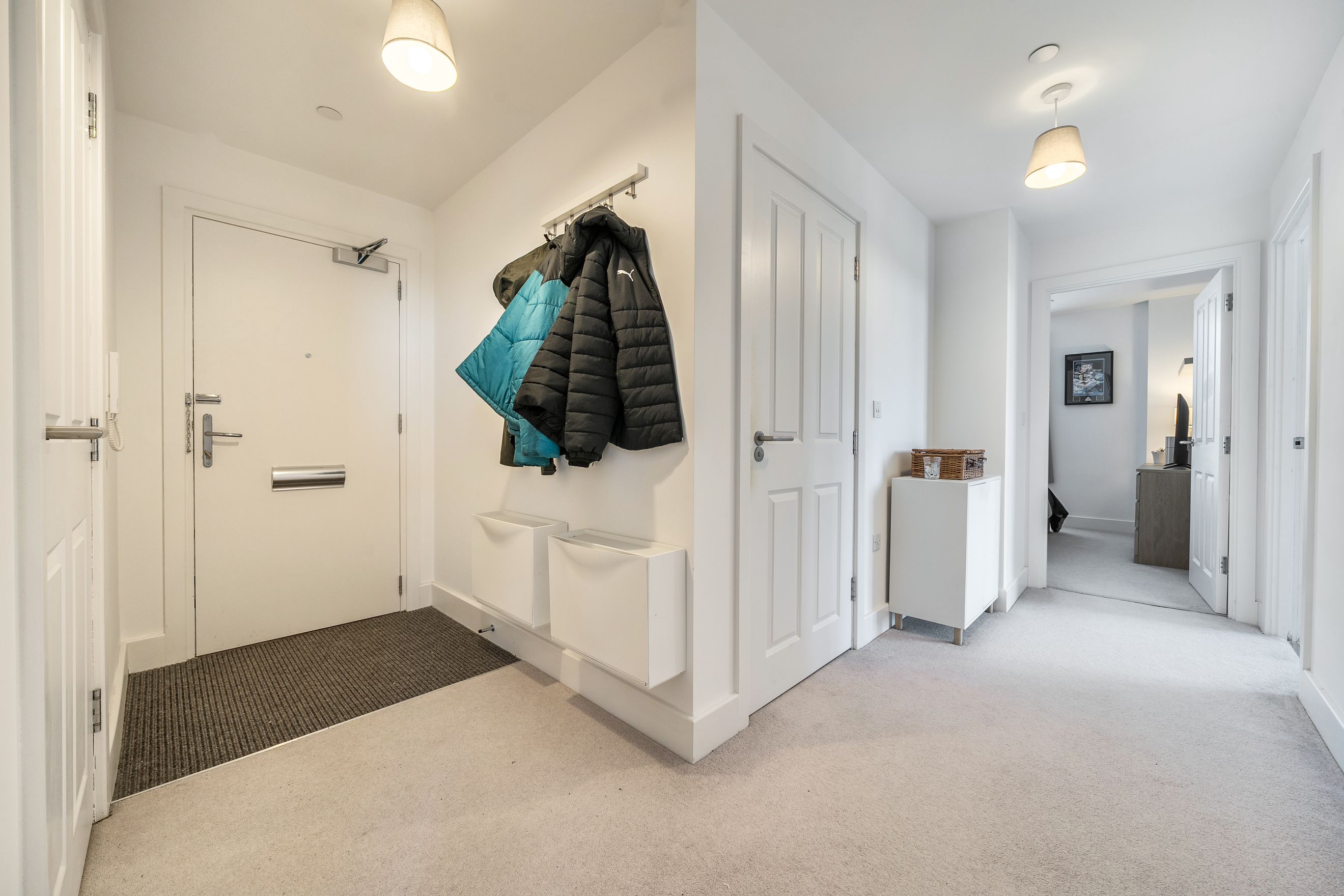 There are two well-proportioned bedrooms, both benefiting from natural light and suitable for a range of uses, including a comfortable main bedroom and a versatile second bedroom that could also serve as a home office or guest room. The accommodation is complemented by a modern bathroom finished in a clean, neutral style.
