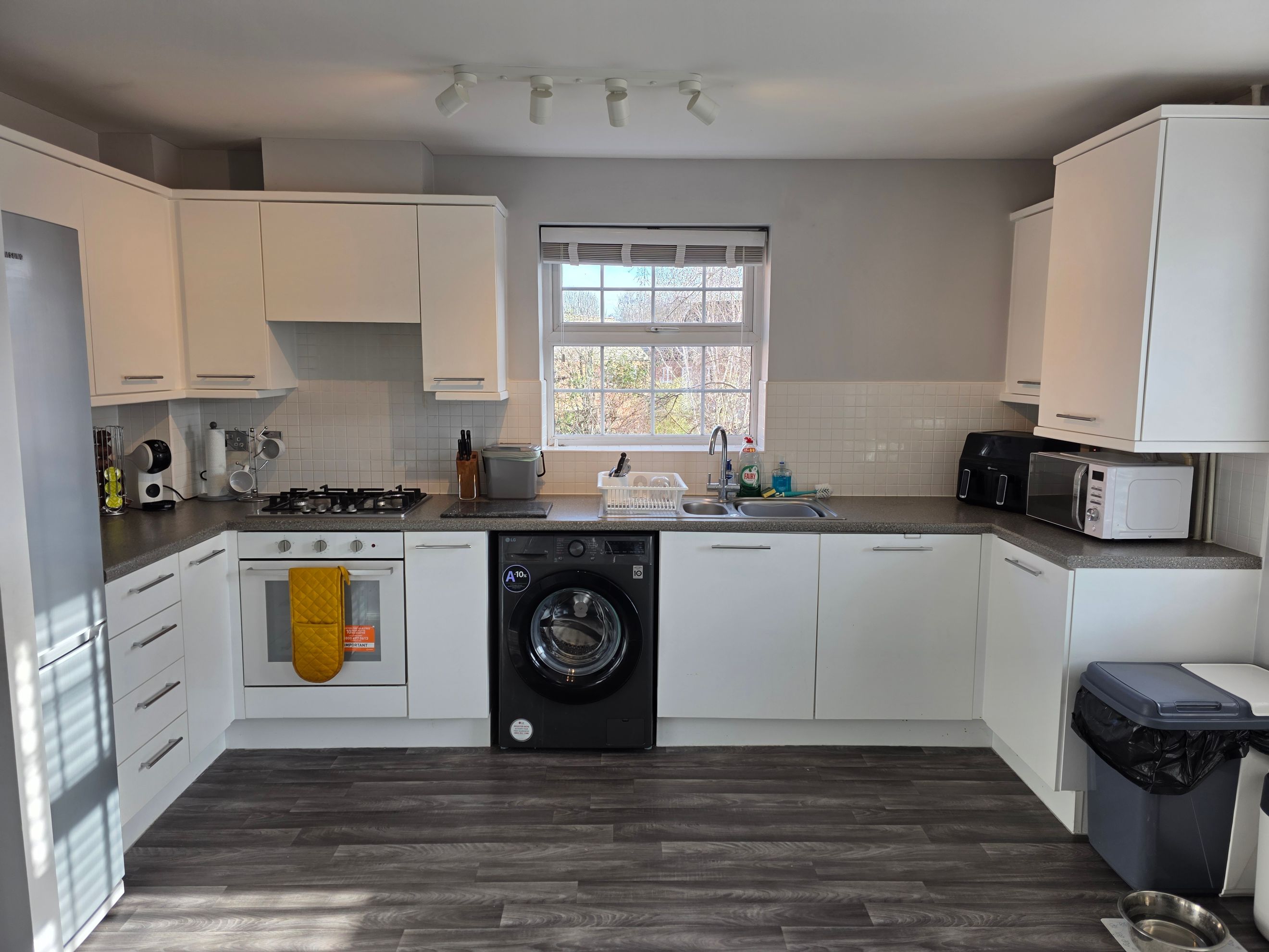 The apartment features a generous open-plan living area incorporating the kitchen, creating a sociable and versatile space ideal for both everyday living and entertaining. Large windows allow plenty of natural light to flow through, enhancing the sense of openness and providing an attractive outlook. The kitchen is neatly arranged with ample worktop and storage space, well suited to modern living.