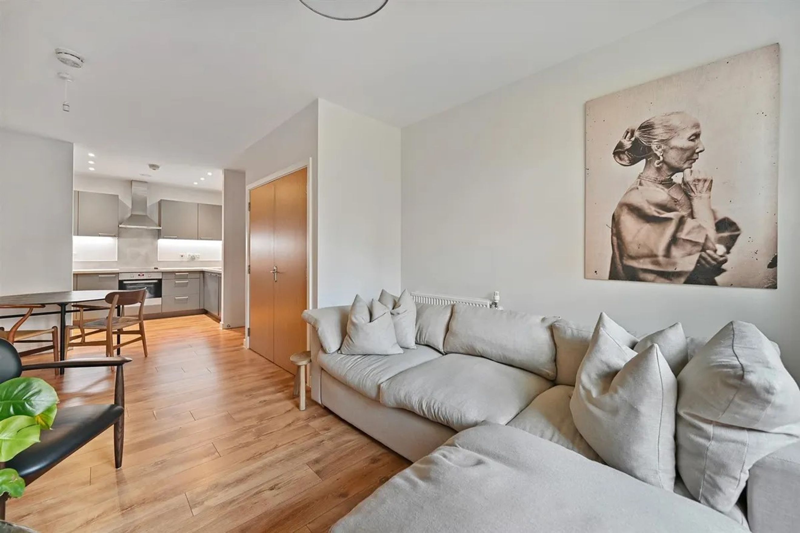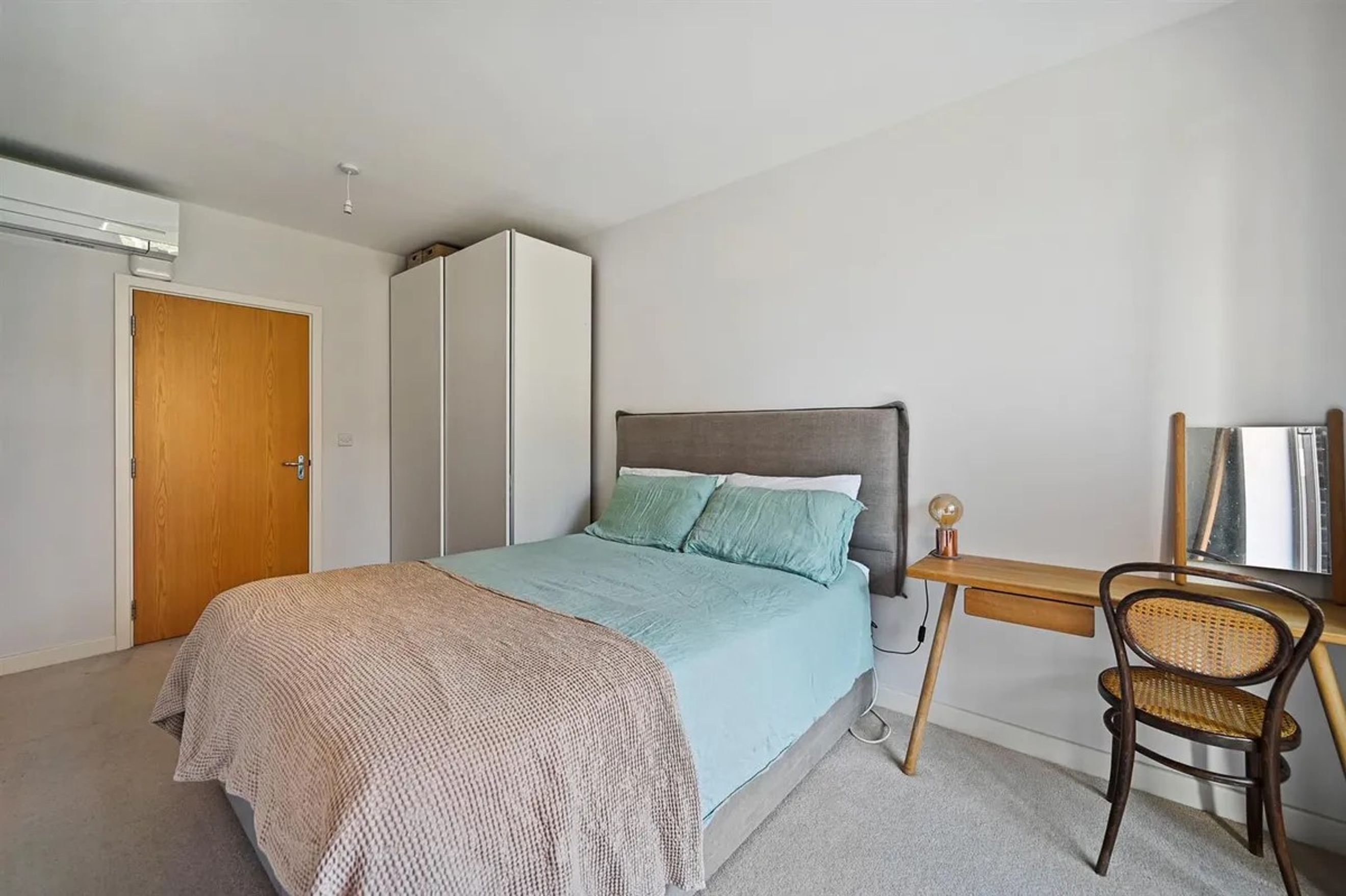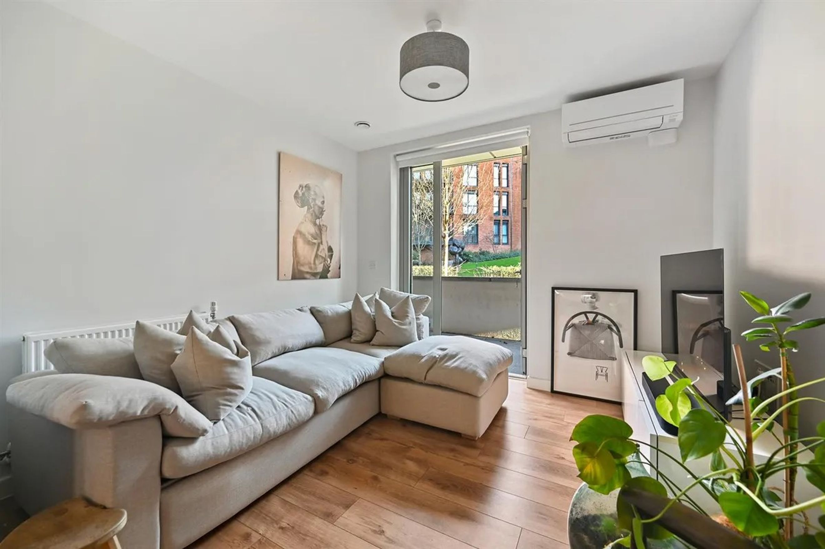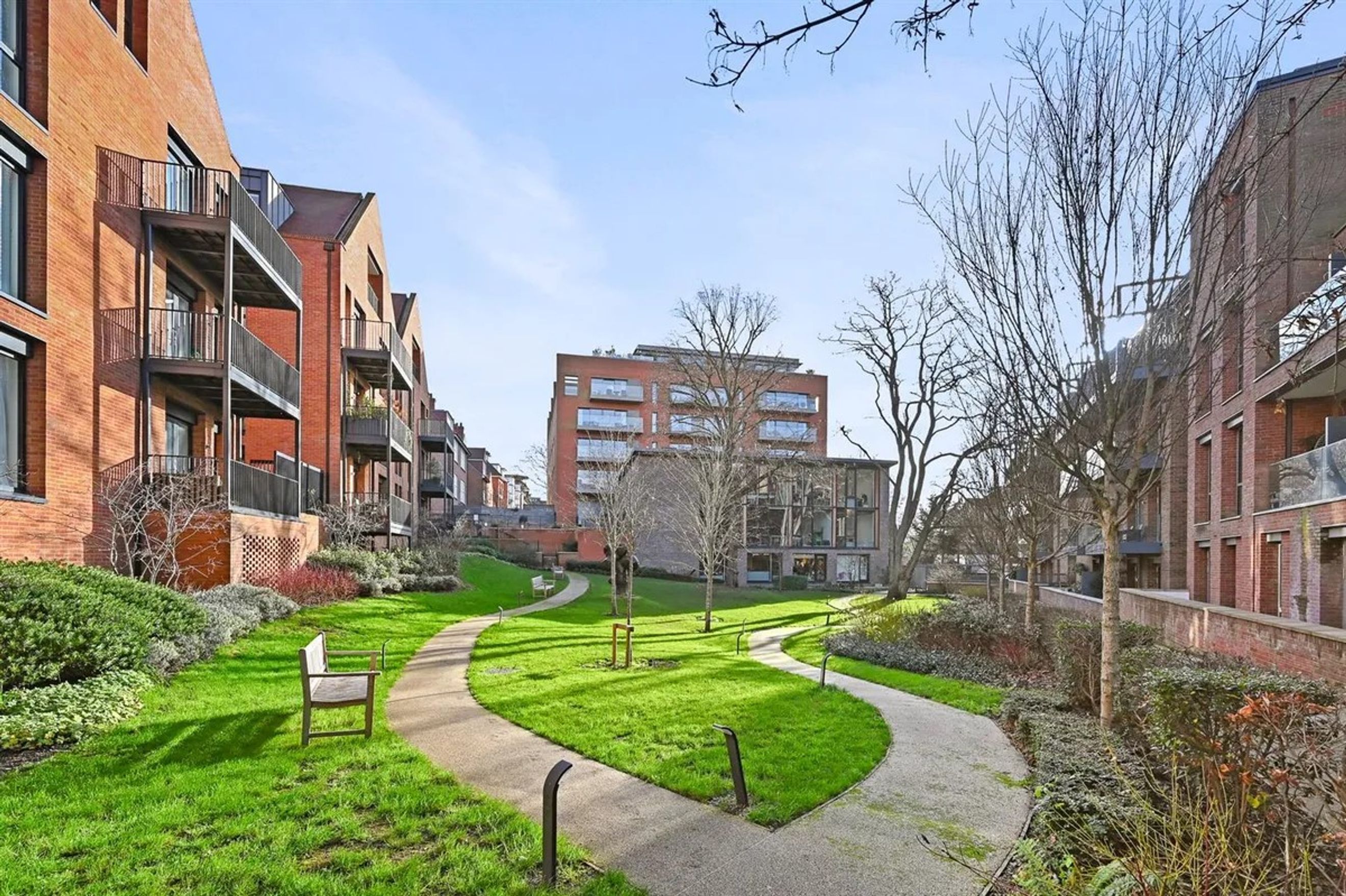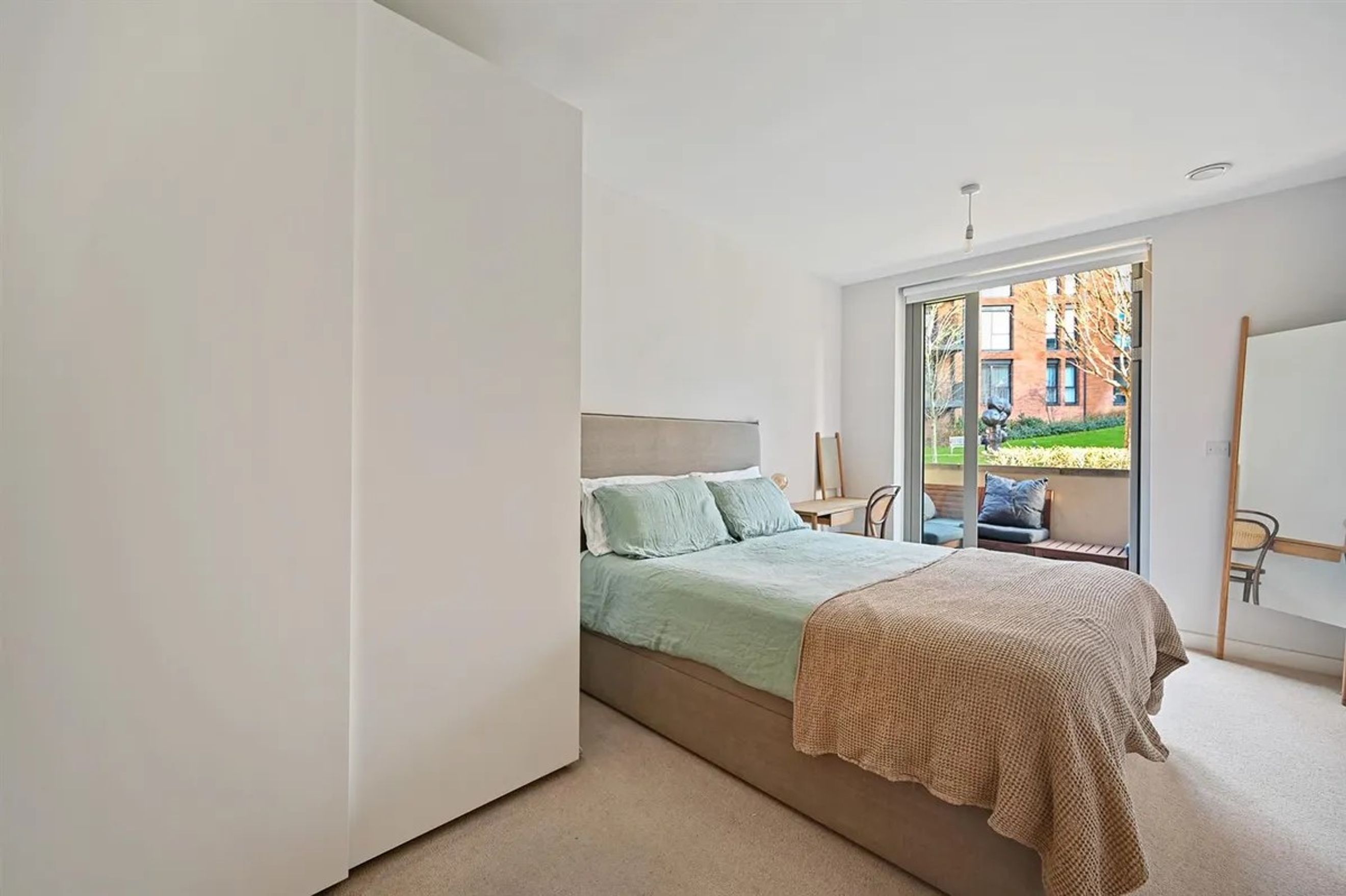 Private Patio: The apartment boasts a private patio that overlooks extensive communal landscaped gardens, accessible from both the reception room and the bedroom.