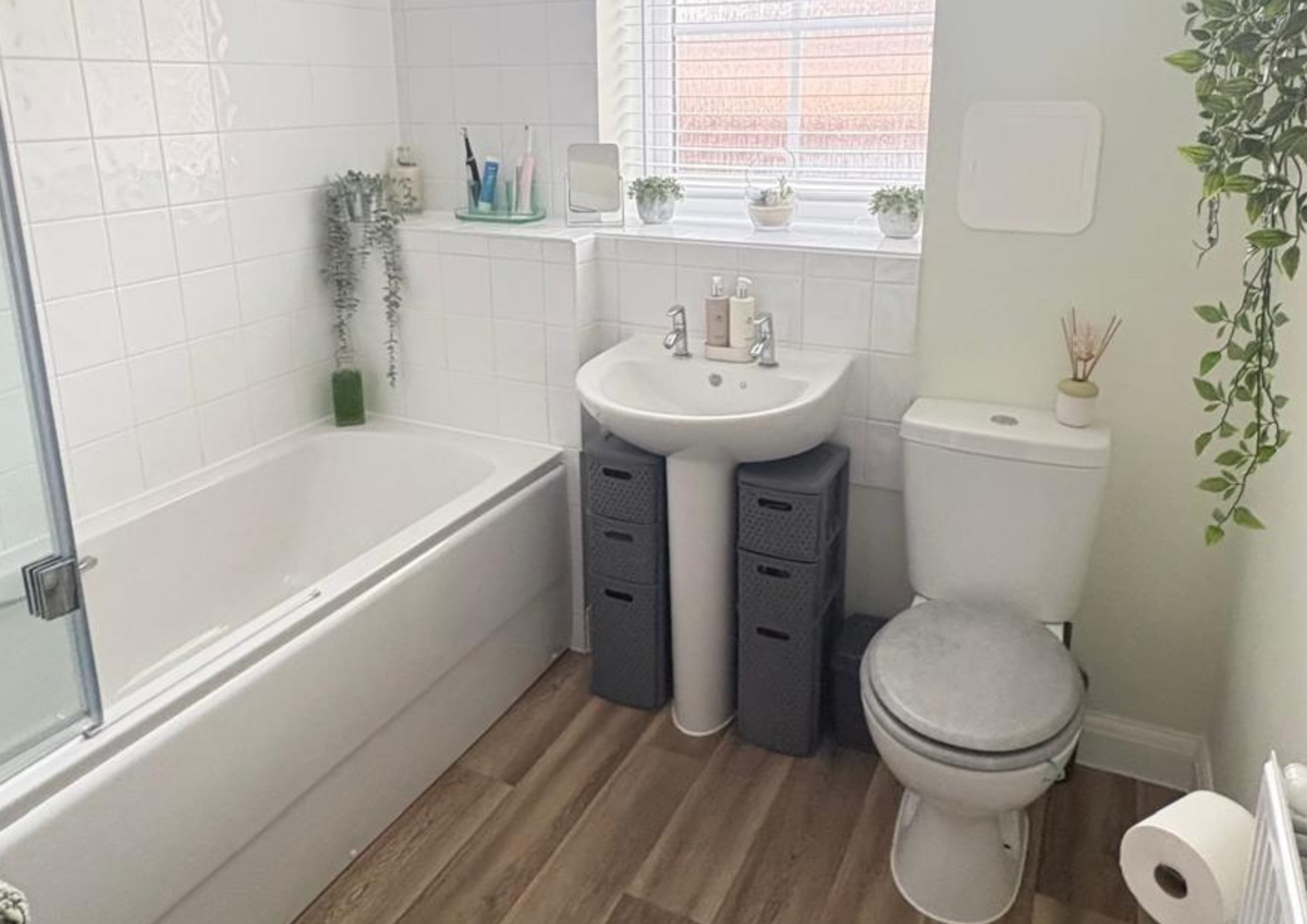 A modern bathroom completes the interior, featuring a WC, basin, and a bath with overhead shower, finished with contemporary tiling and fittings.
