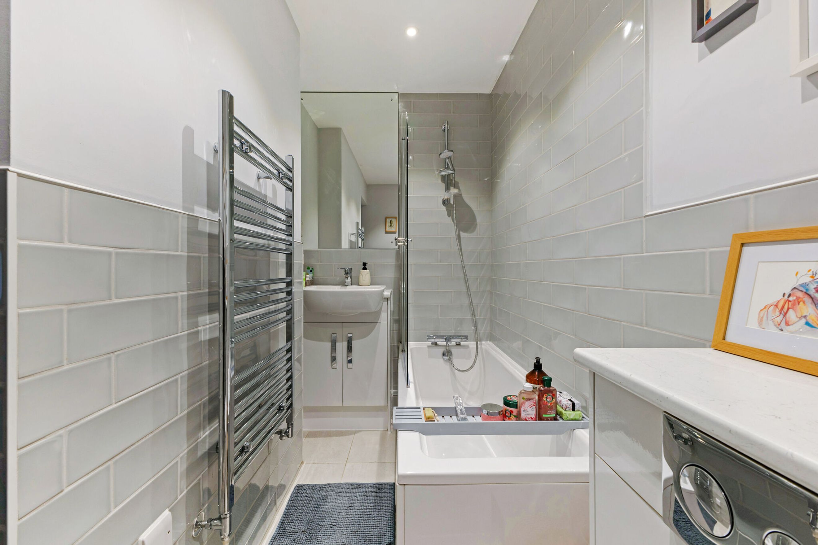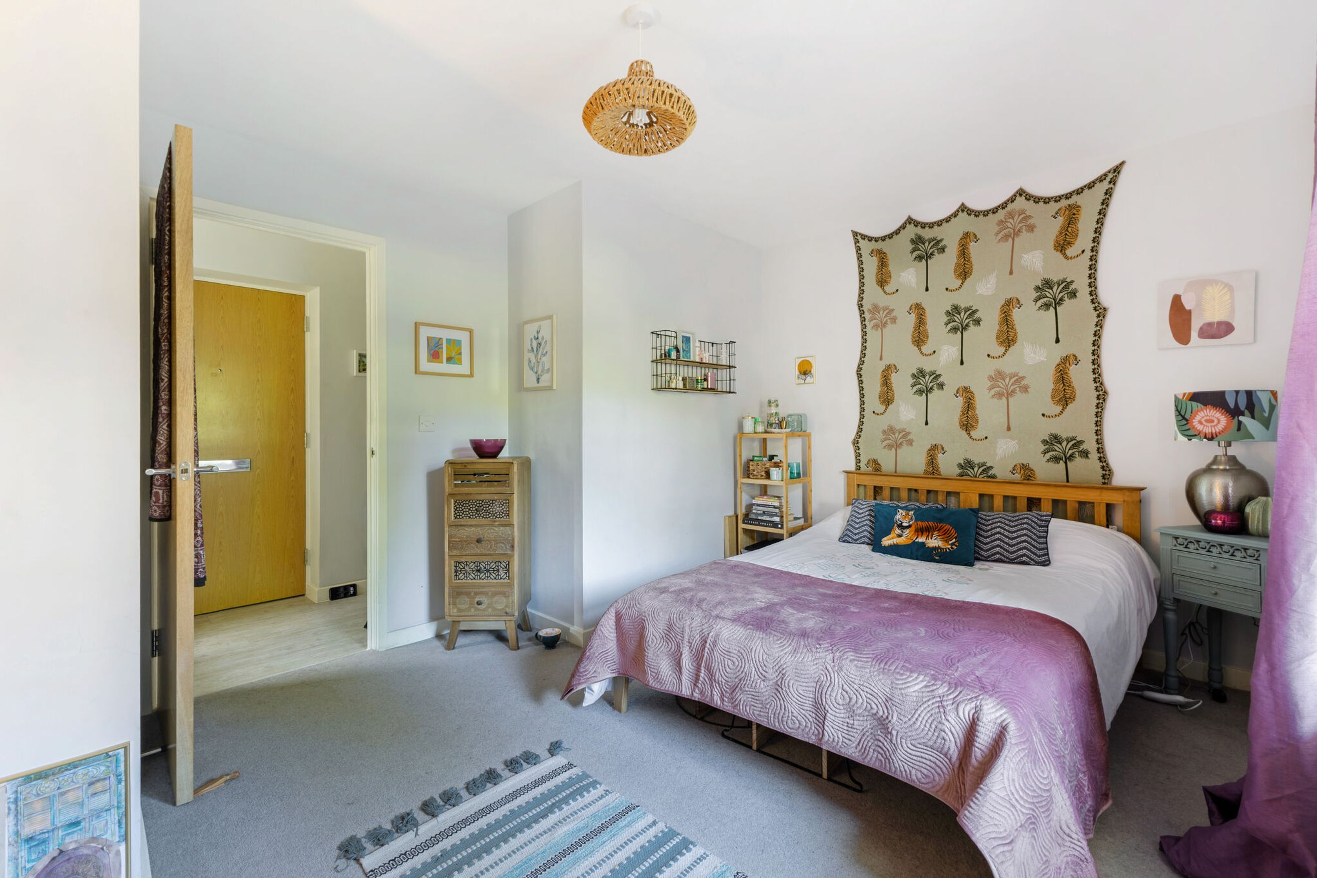 The bedroom offers a calm and comfortable retreat with plenty of room for furnishings. Positioned nearby is the bathroom, arranged with a full suite including a bath and basin area, offering convenience and practicality.
