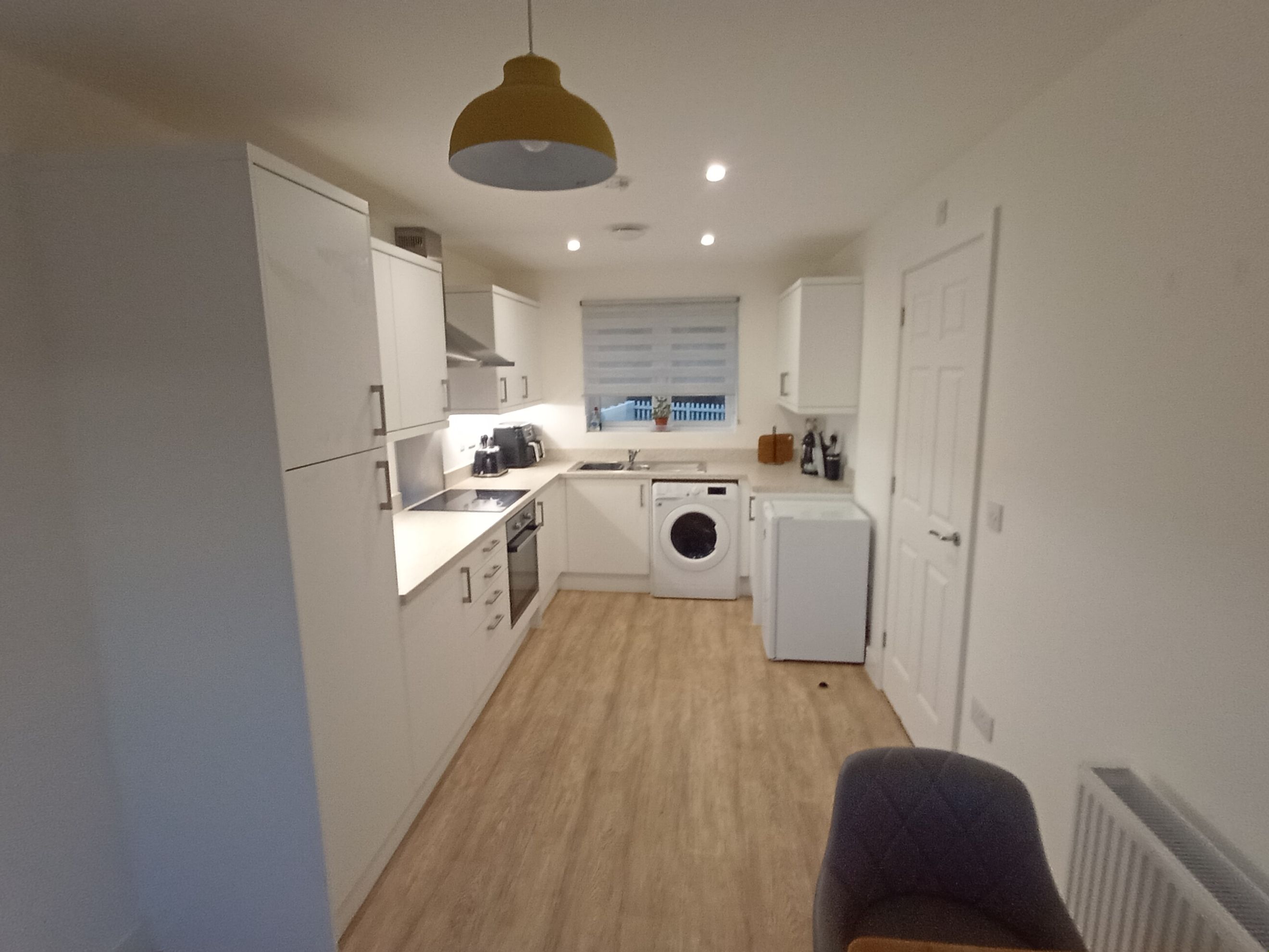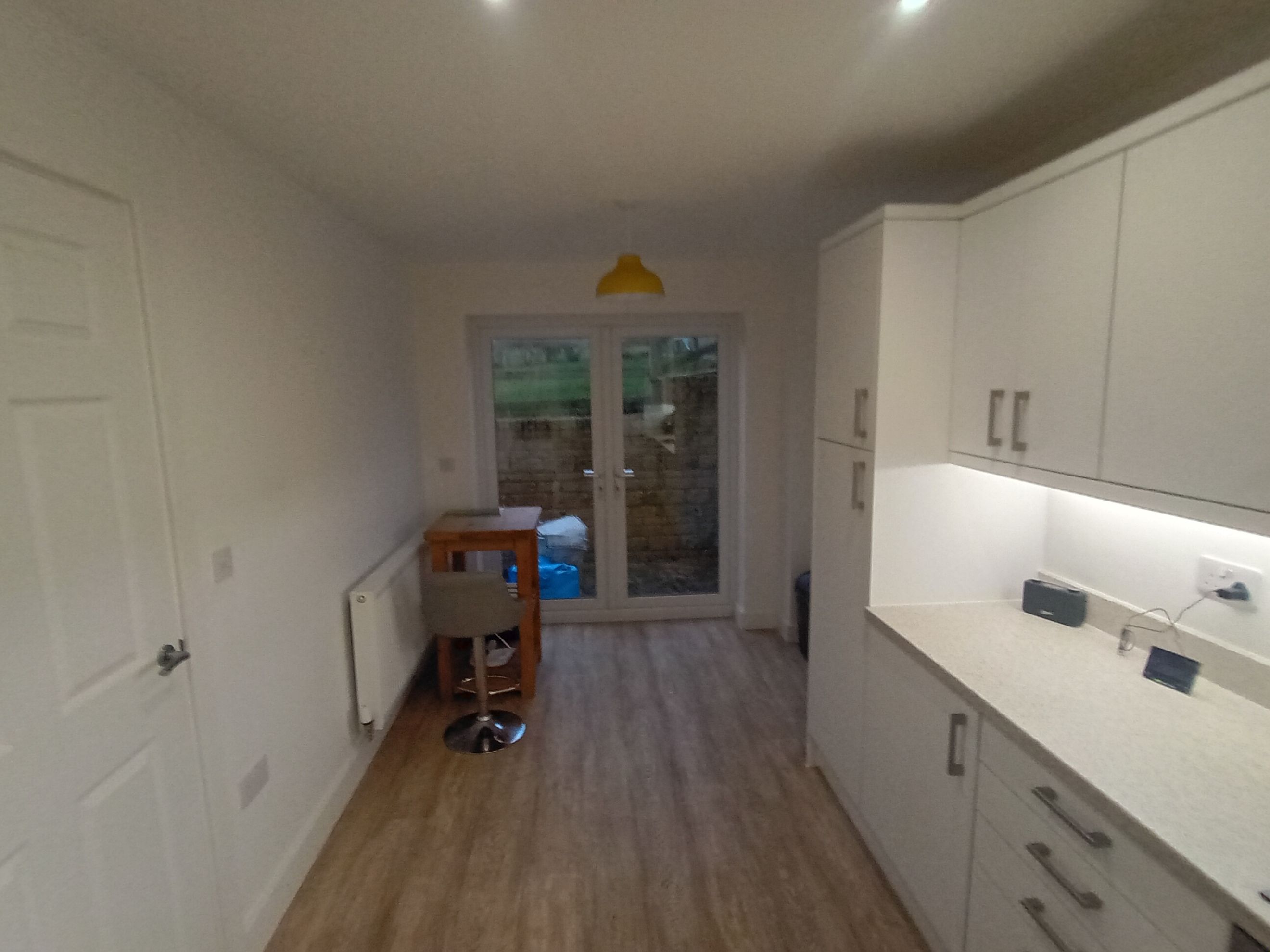 Upon entering, a hard-floored hallway provides access to the main living areas. To the left is a dual-aspect living room, filled with natural light and featuring French doors that open onto the rear garden. To the right, the dual-aspect kitchen also benefits from French doors leading outside. The ground floor is completed by a downstairs WC and a useful understairs storage cupboard.