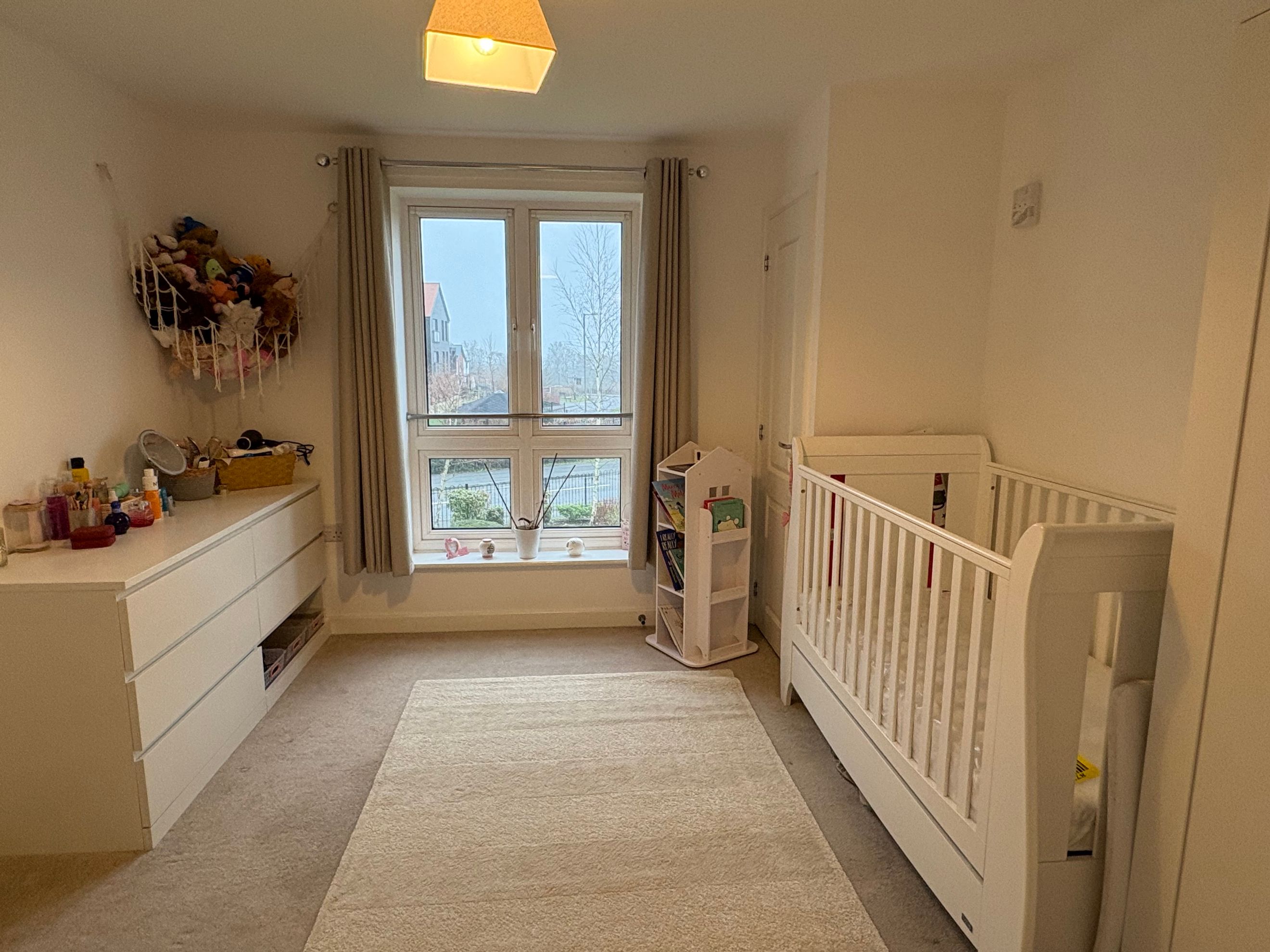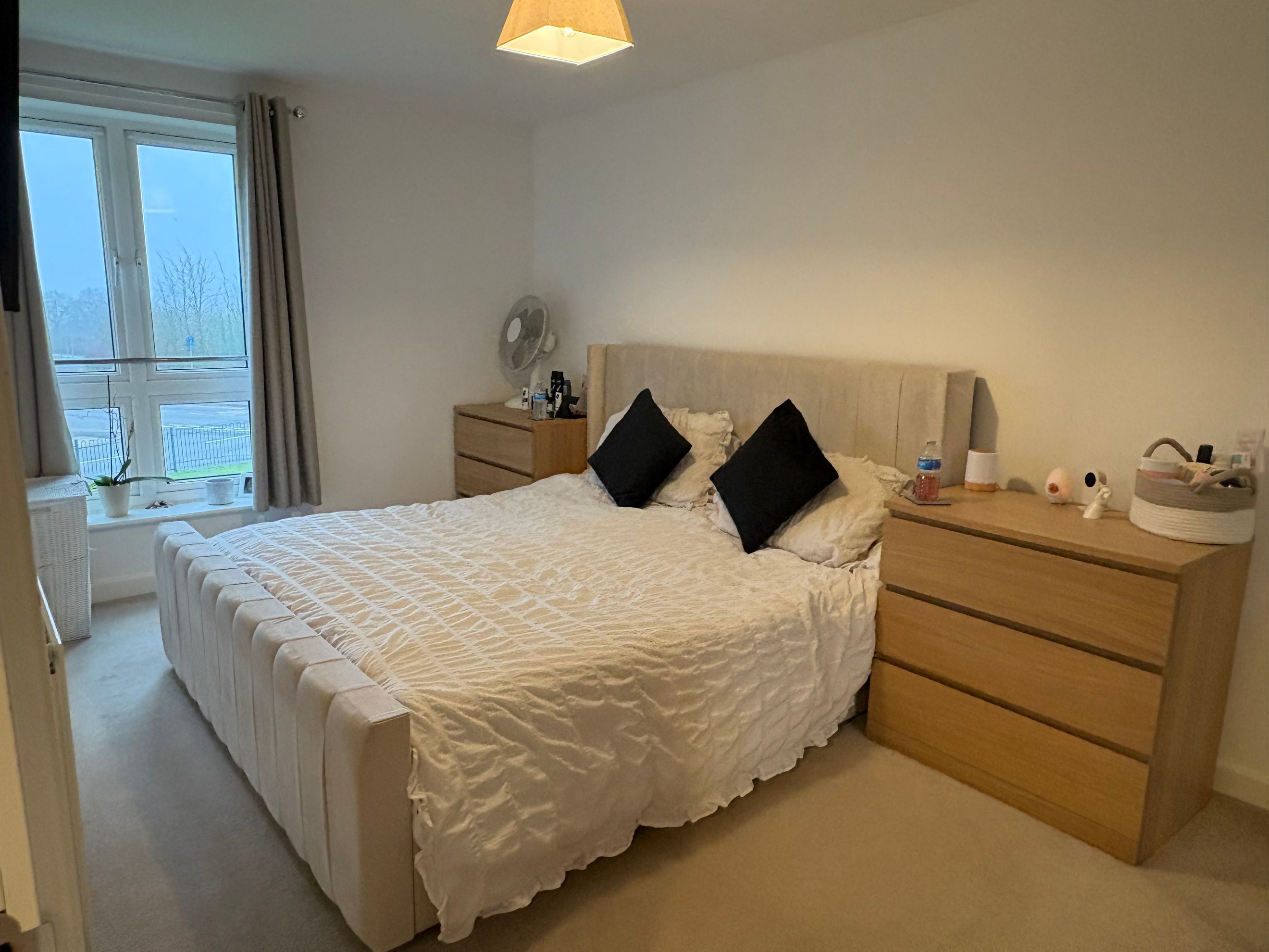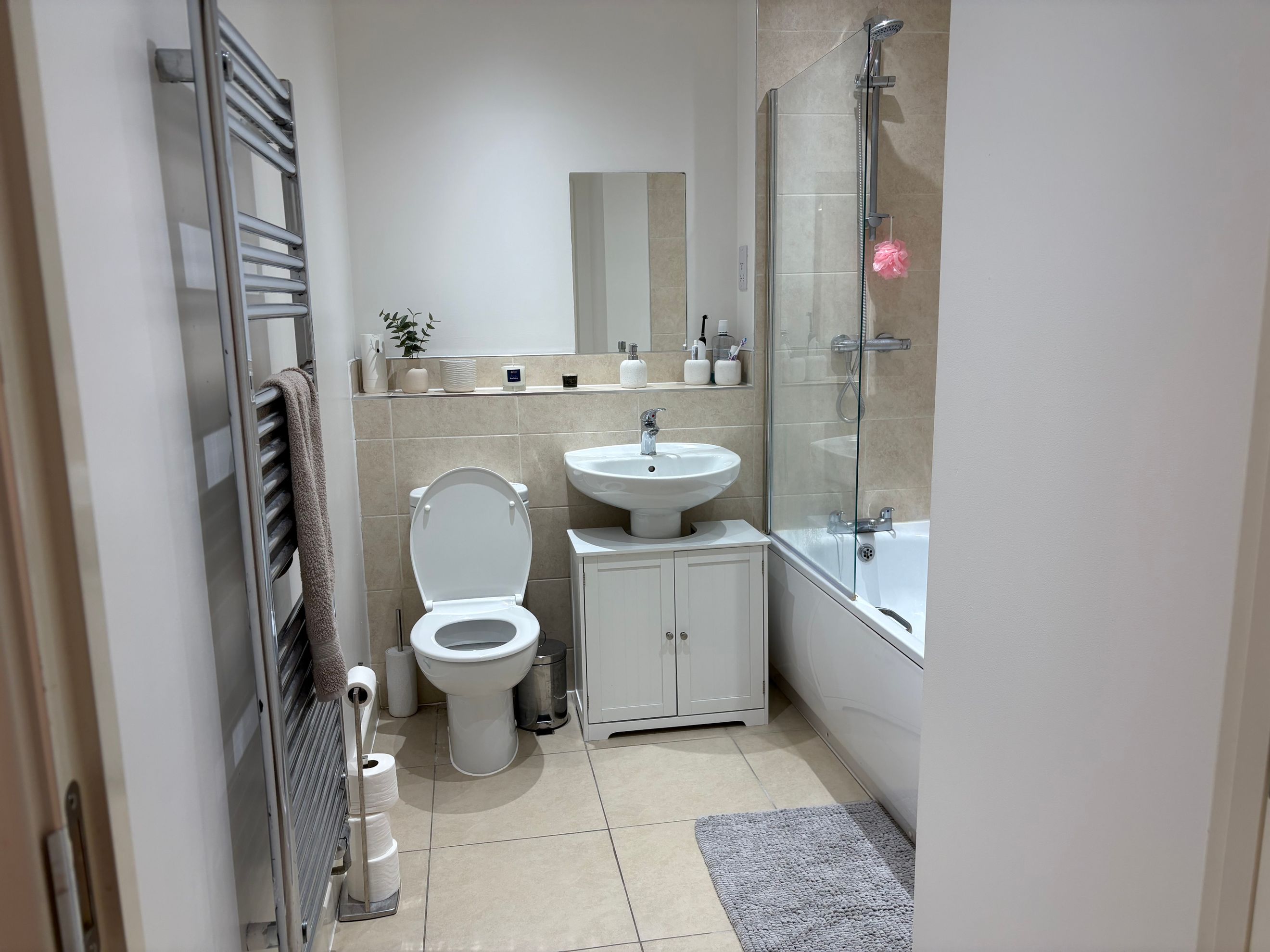 Both bedrooms are generous doubles, with the main bedroom benefiting from a built‑in storage cupboard, and the family bathroom includes a contemporary three‑piece suite with a shower over the bath.