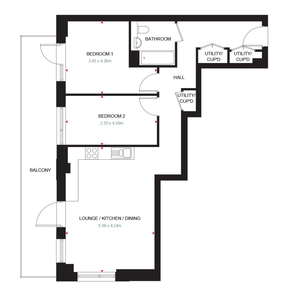 Both bedrooms are set away from the main living space, creating a calm retreat at the end of the day. The main is a generous double, while the second bedroom makes an ideal guest room, child’s bedroom or home office. The modern bathroom sits just off the hallway, and three separate utility / storage cupboards mean there’s a place for everything.