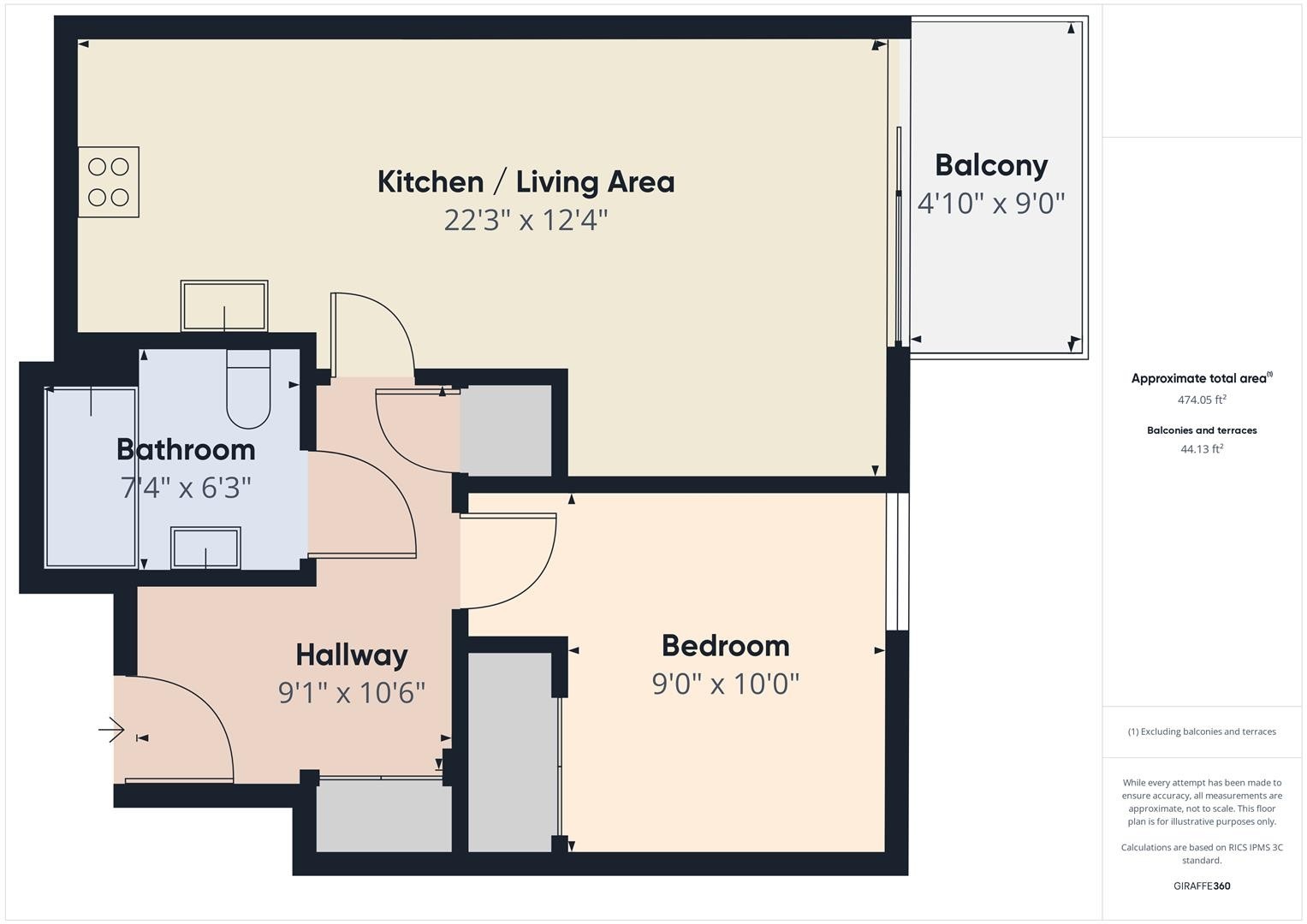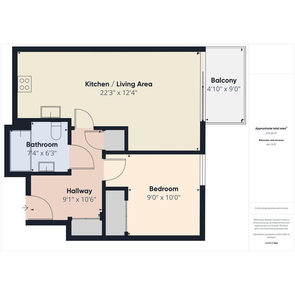 The flat includes a comfortable bedroom and a well-appointed bathroom for modern living.
