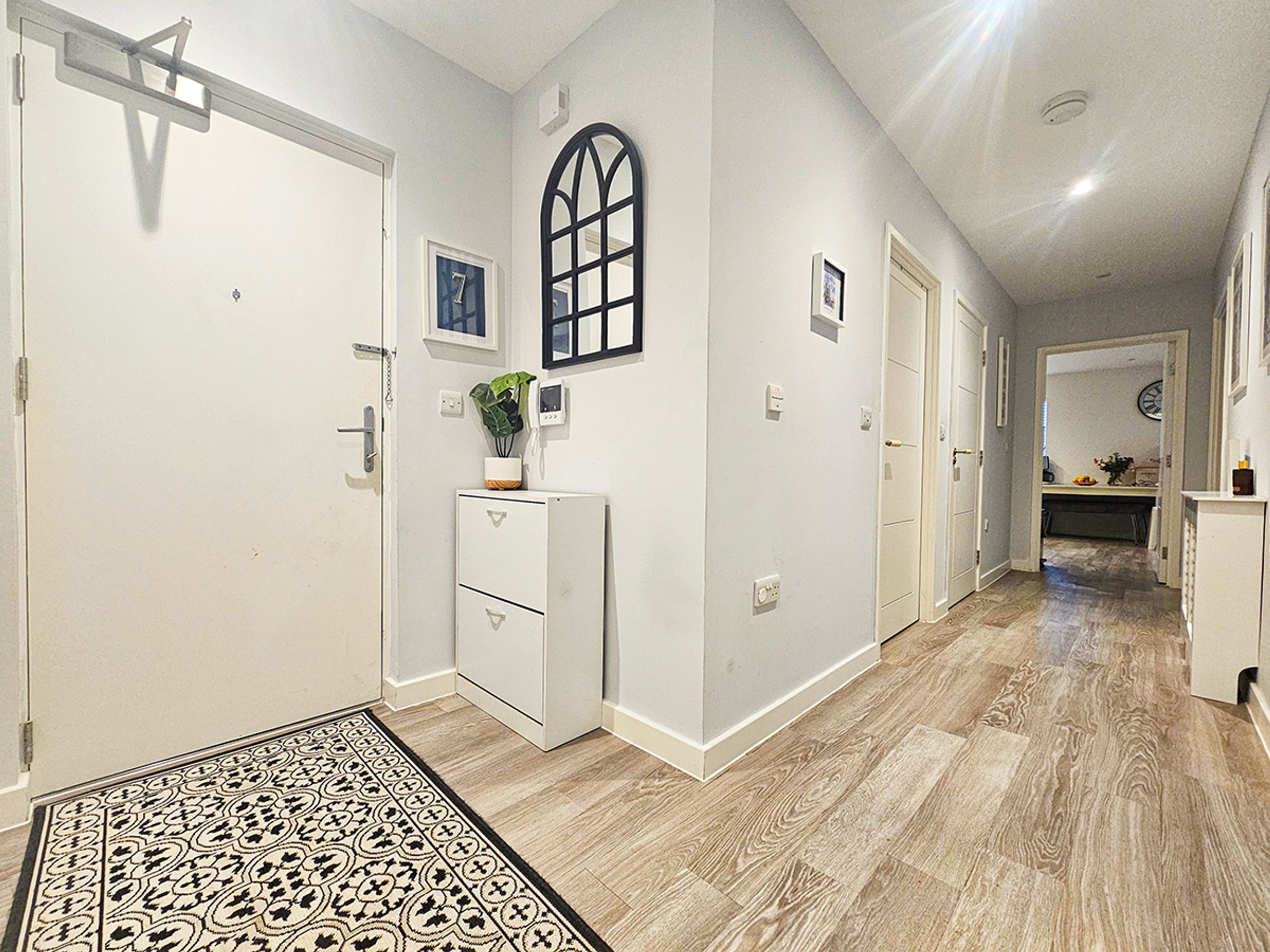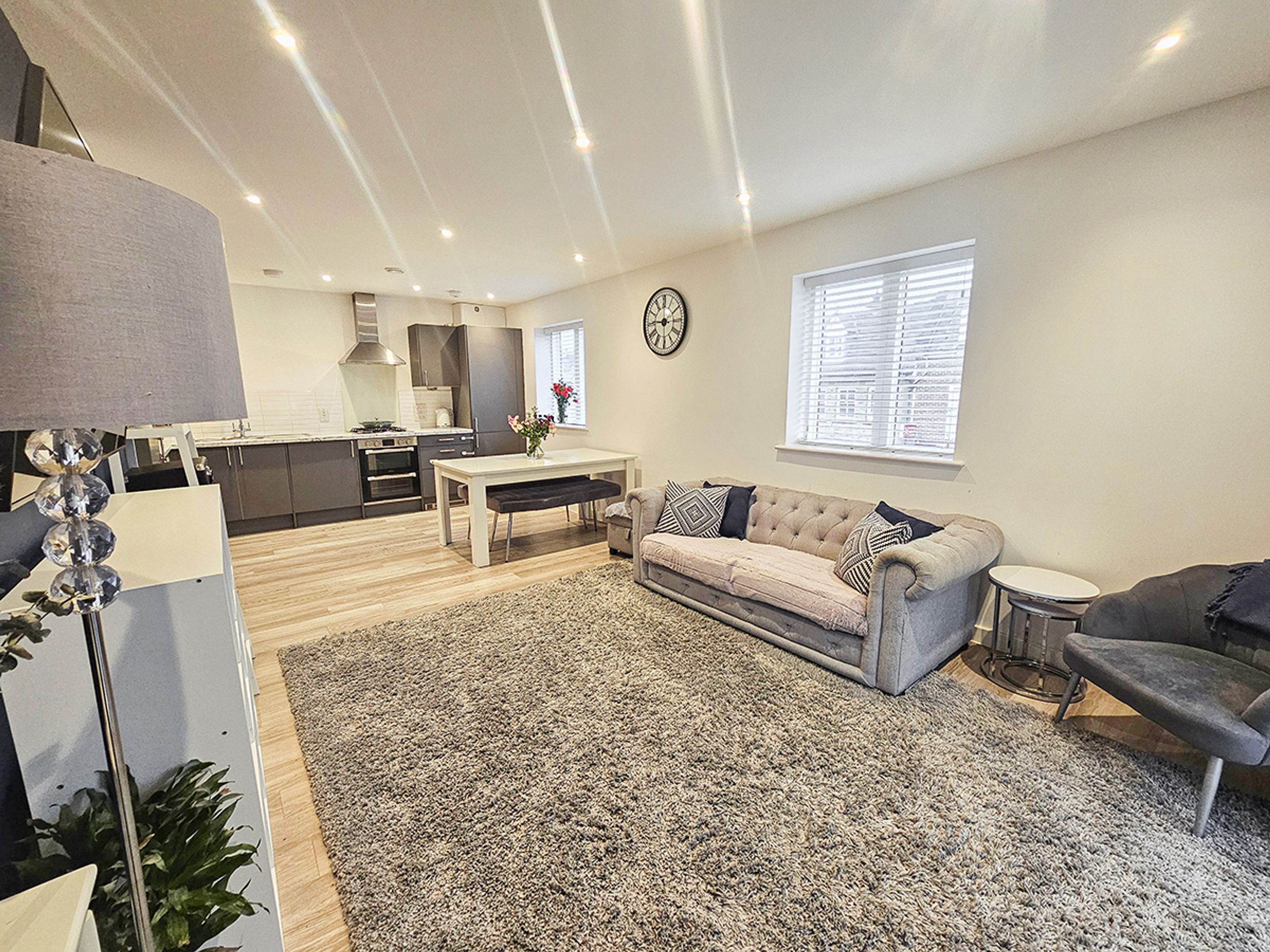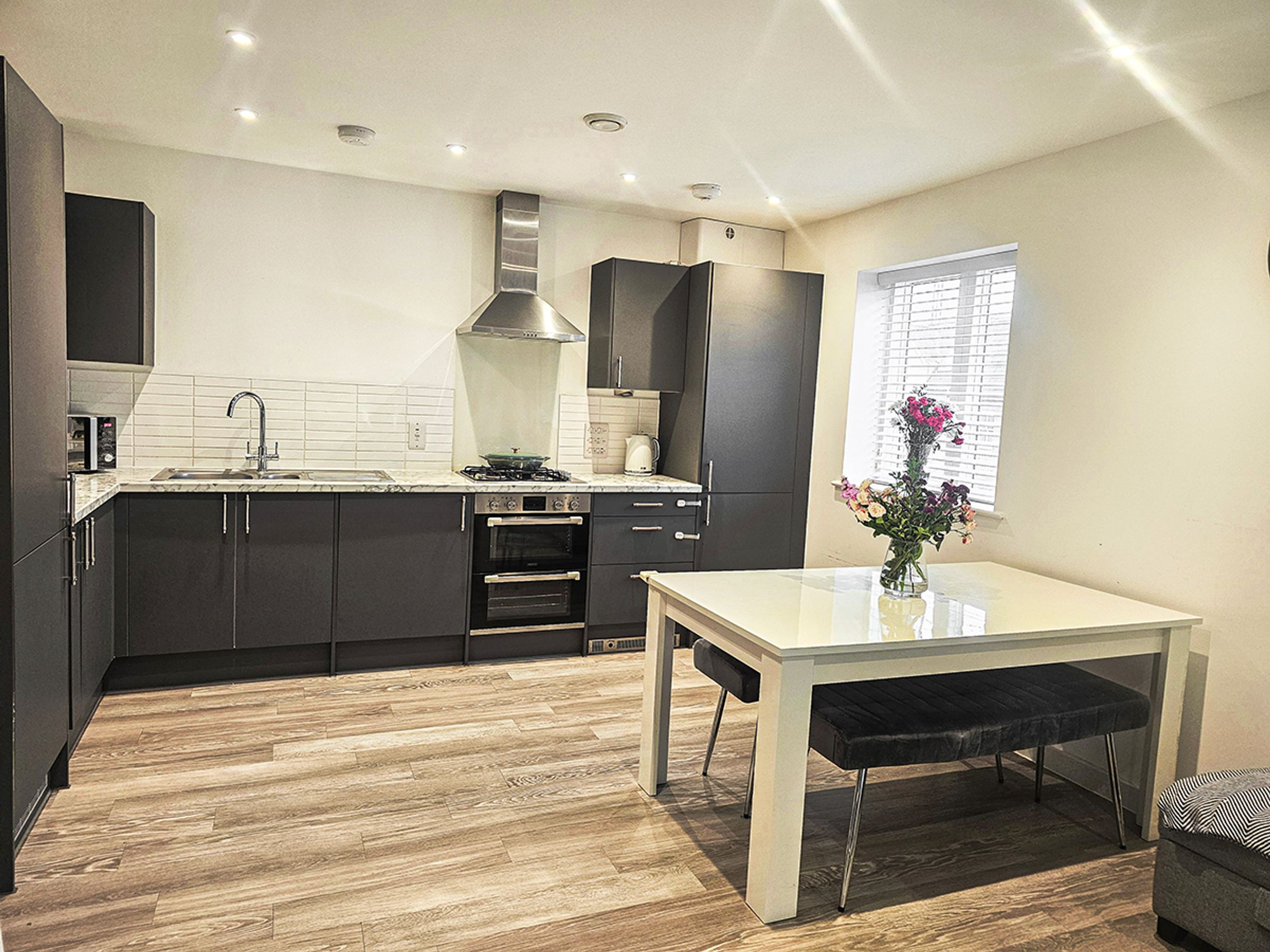The apartment is well presented throughout and benefits from an allocated parking space. Internally, it features wood‑effect flooring, a modern kitchen with dark units, and marble‑effect worktops, creating a sleek and contemporary finish.