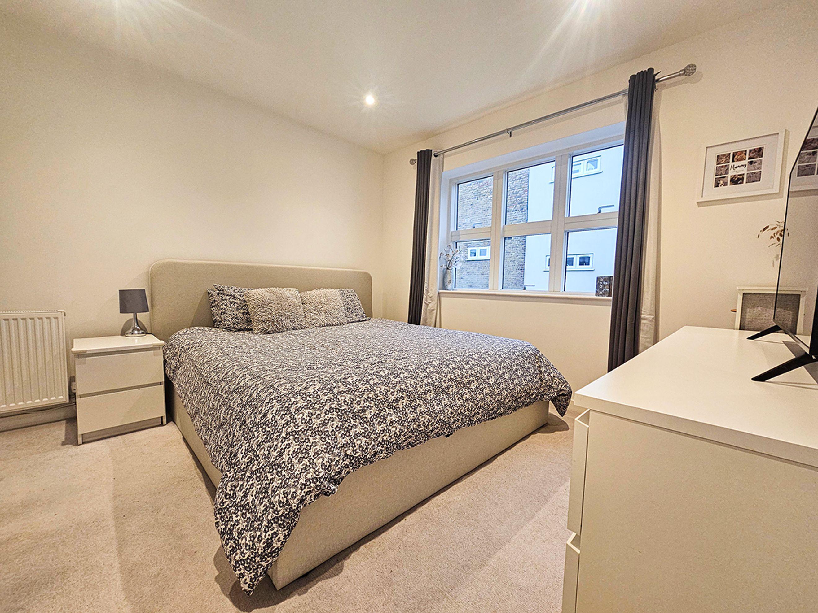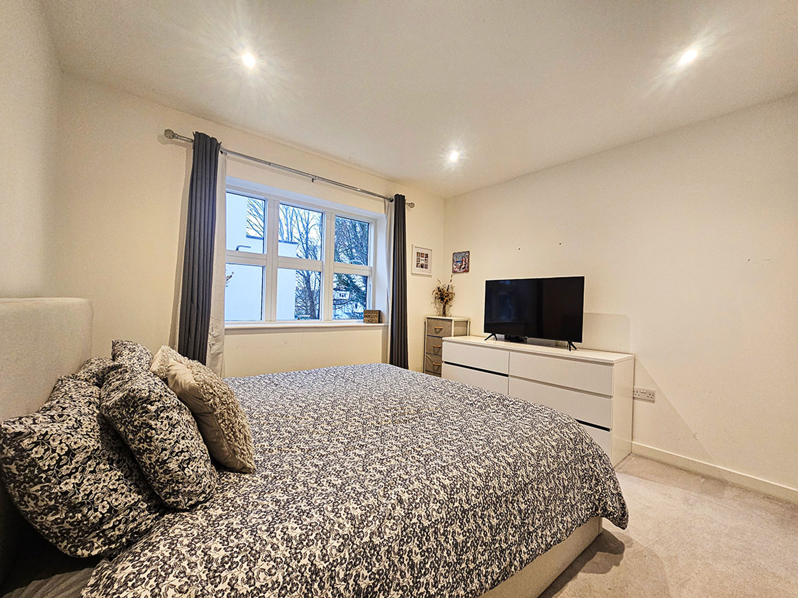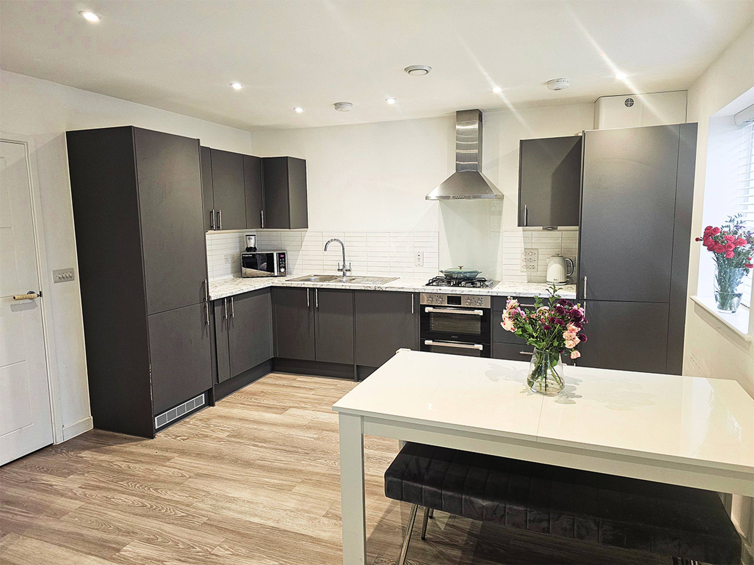 The apartment is well presented throughout and benefits from an allocated parking space. Internally, it features wood‑effect flooring, a modern kitchen with dark units, and marble‑effect worktops, creating a sleek and contemporary finish.