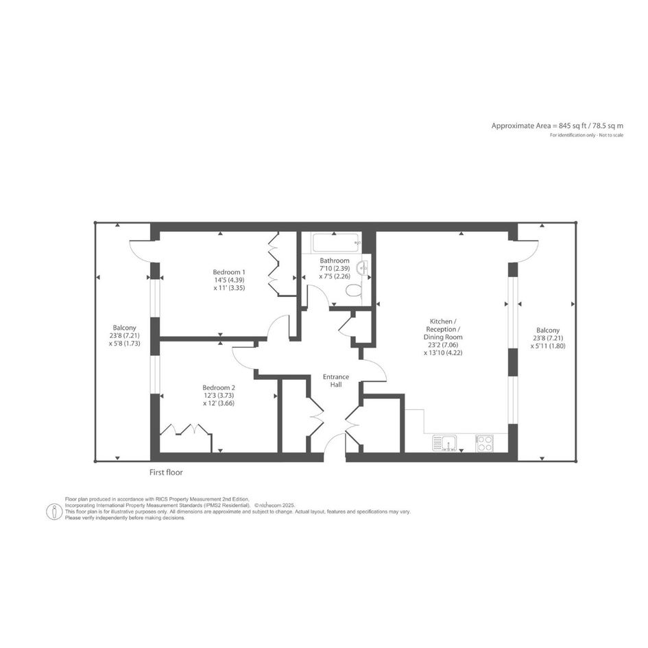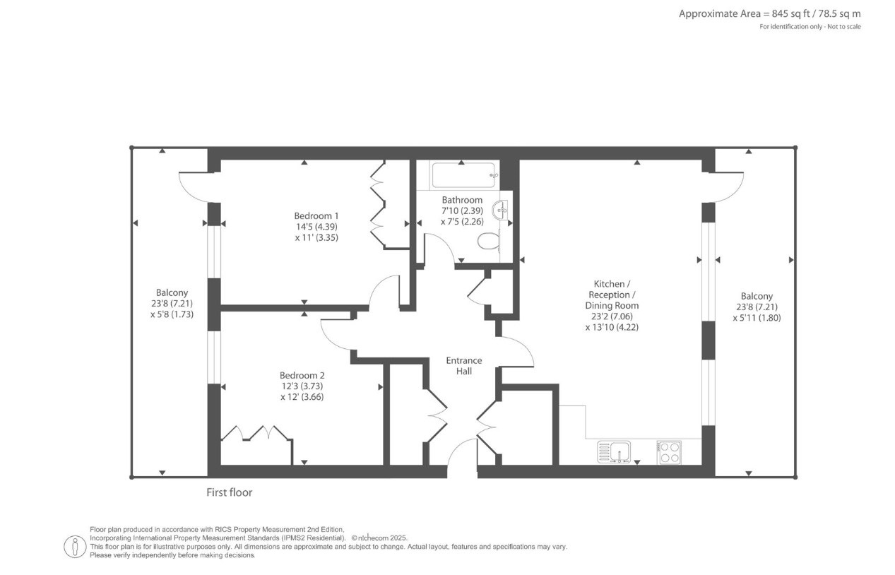 The apartment features a spacious entrance hall, leading through to a bright and airy open plan lounge/kitchen/diner with direct access to a private balcony. There are two good sized double bedrooms, with the principal bedroom benefiting from built-in storage and access to a 2nd balcony. A contemporary family bathroom completes the accommodation.