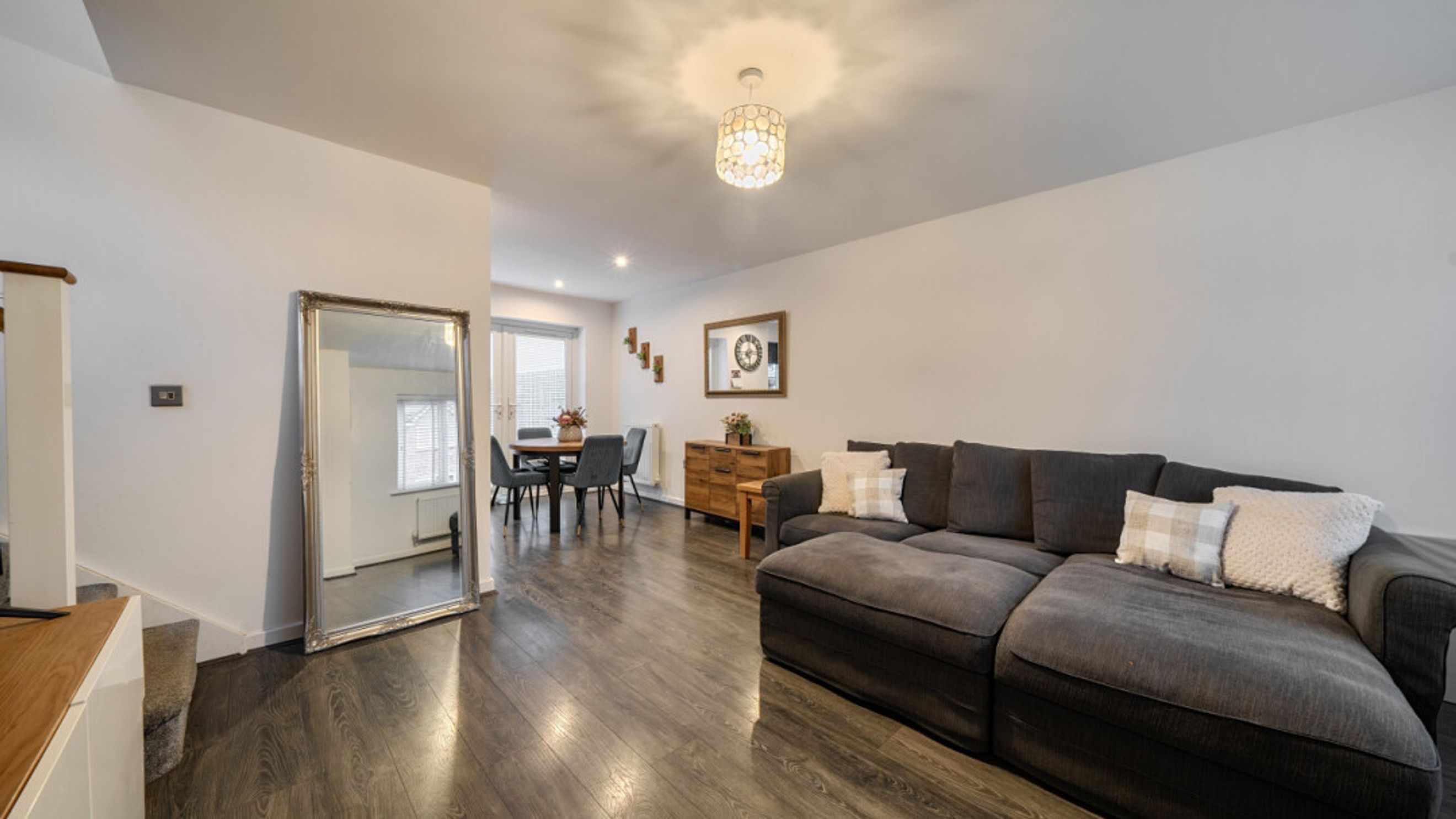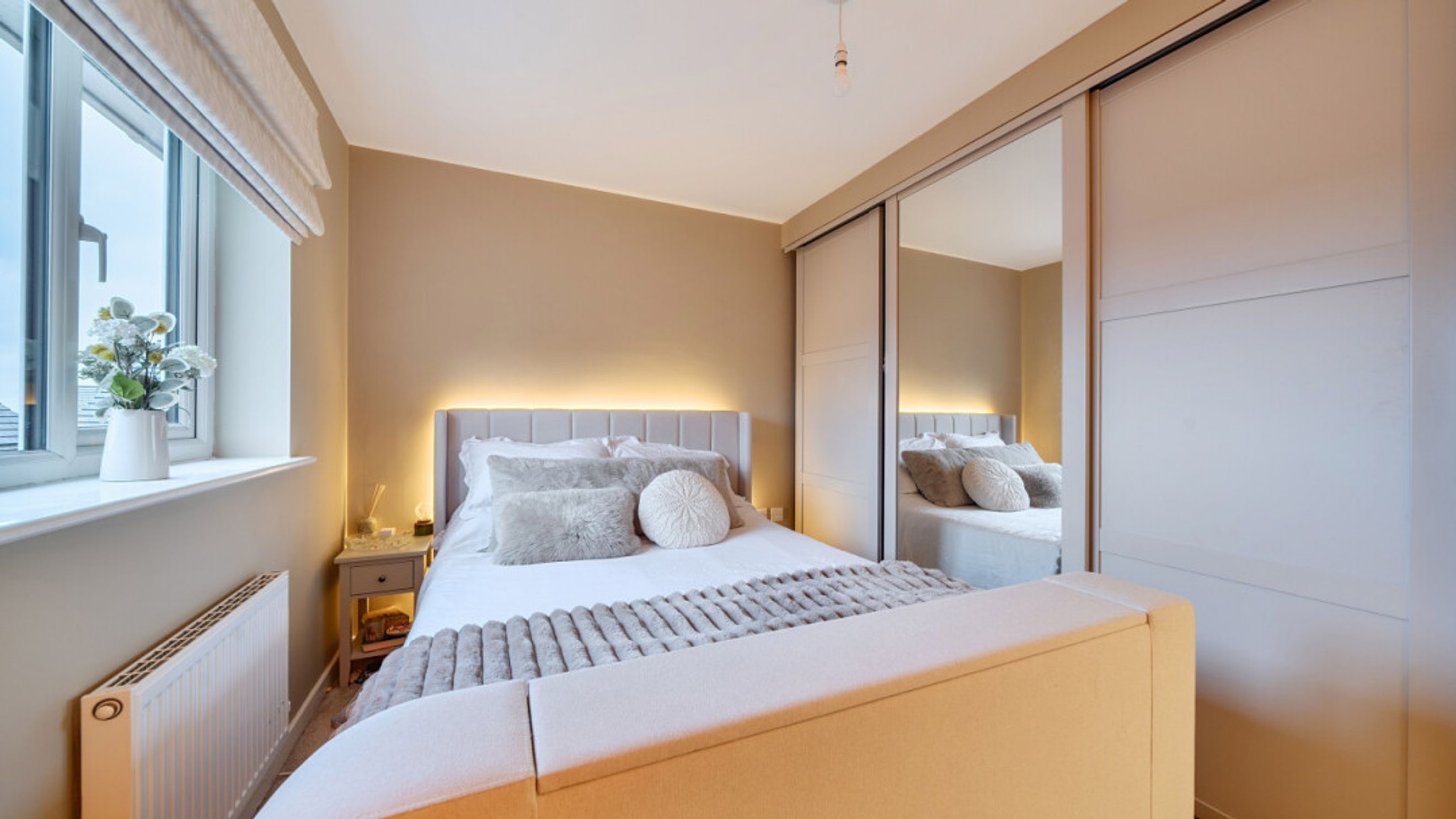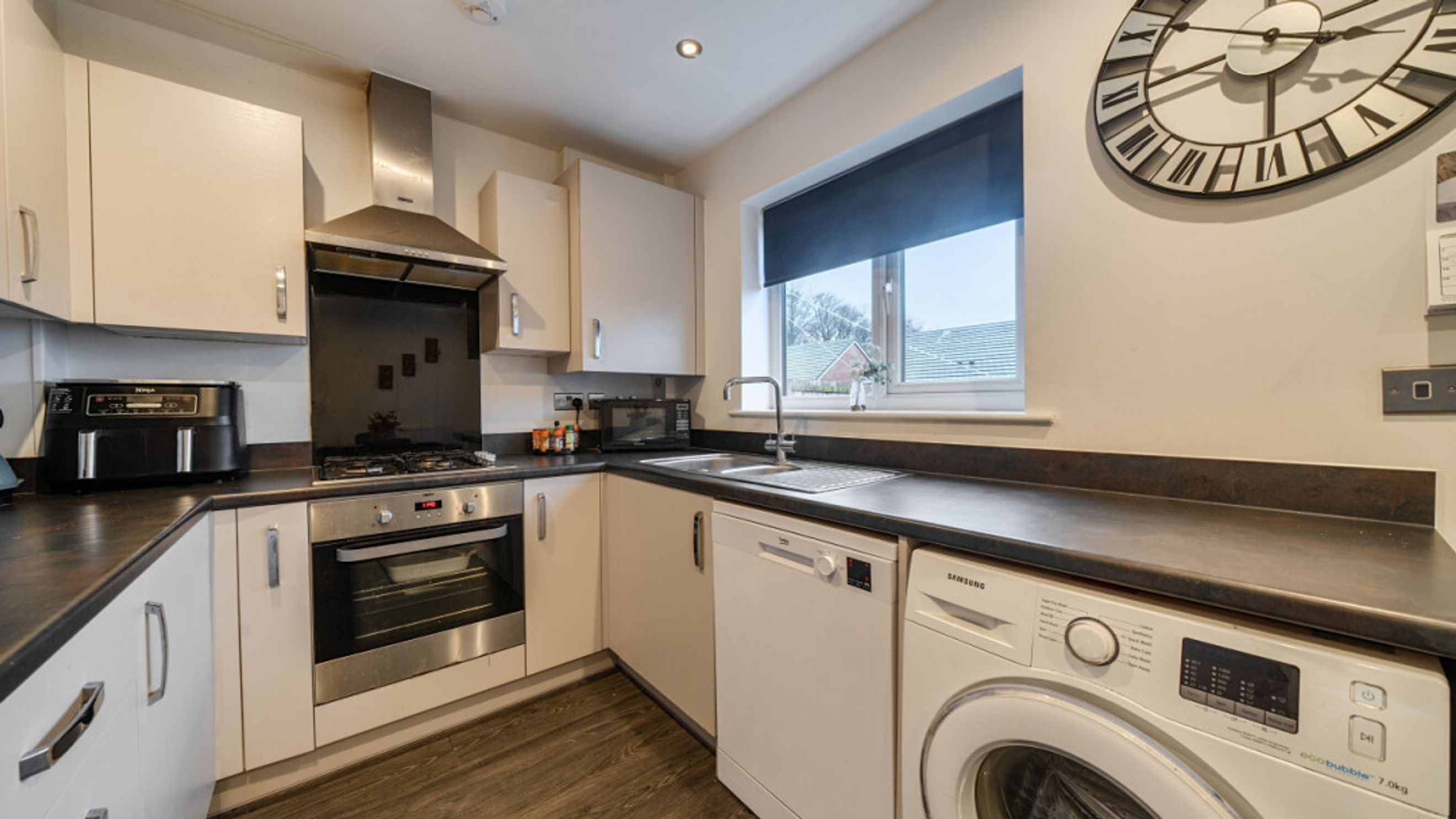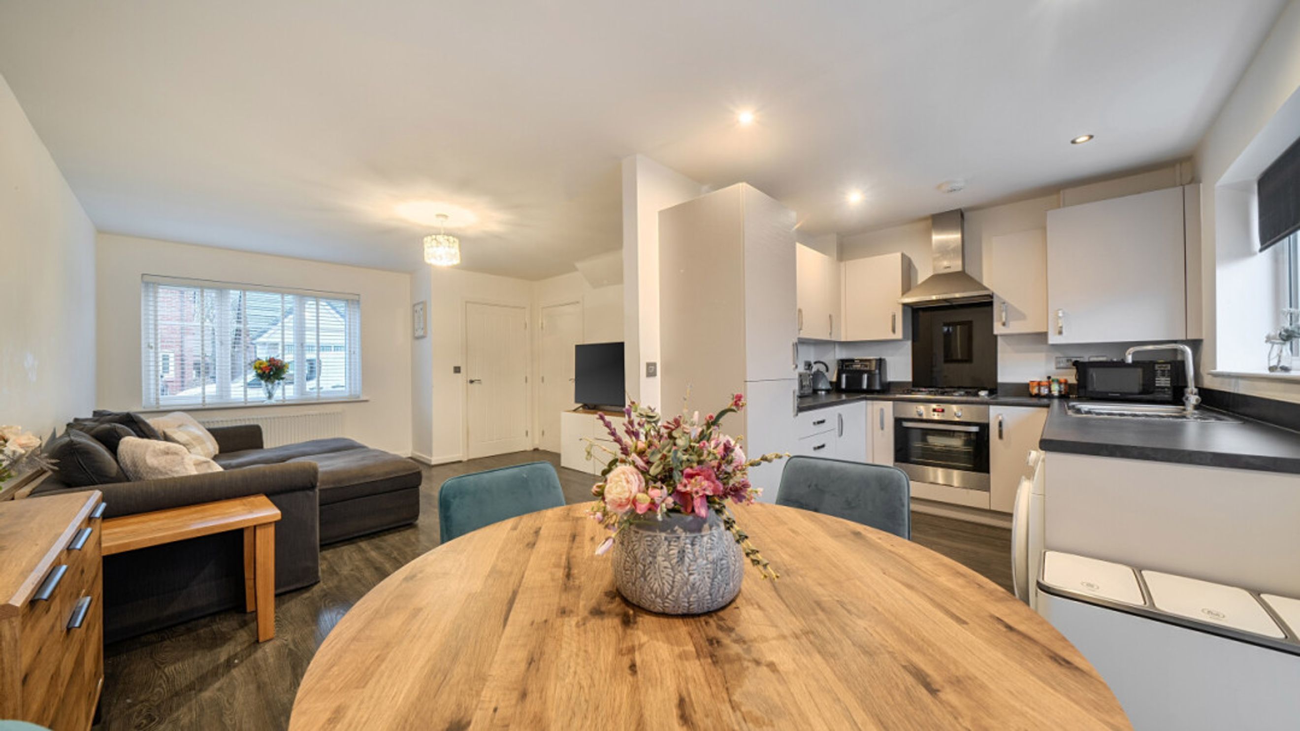 This bright and spacious semi-detached modern house, flooded with natural light, The kitchen is fitted with integrated appliances including a fridge freezer, oven, hob and extractor. Spacious main double bedroom benefitting from en-suite with shower and fitted wardrobes, as well as a bright and airy second double bedroom. The bathroom comes complete with a white three-piece suite with a shower over bath and a stone tile surround. Additional storage cupboards, large rear garden and private driveway