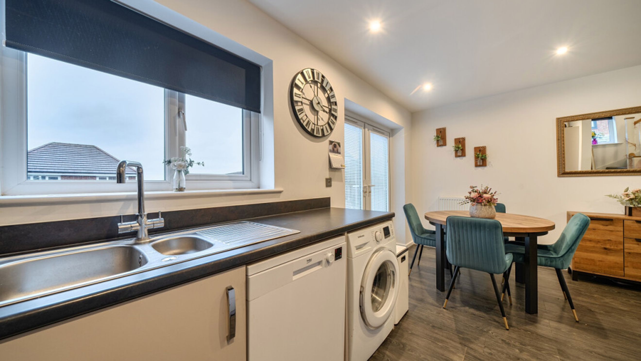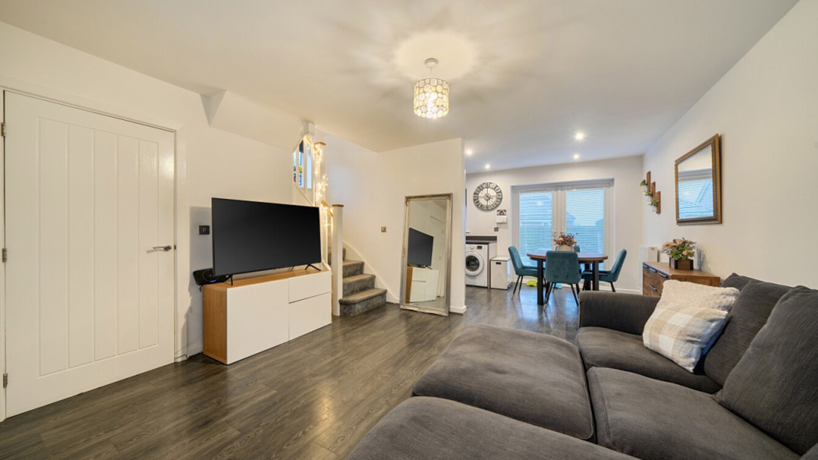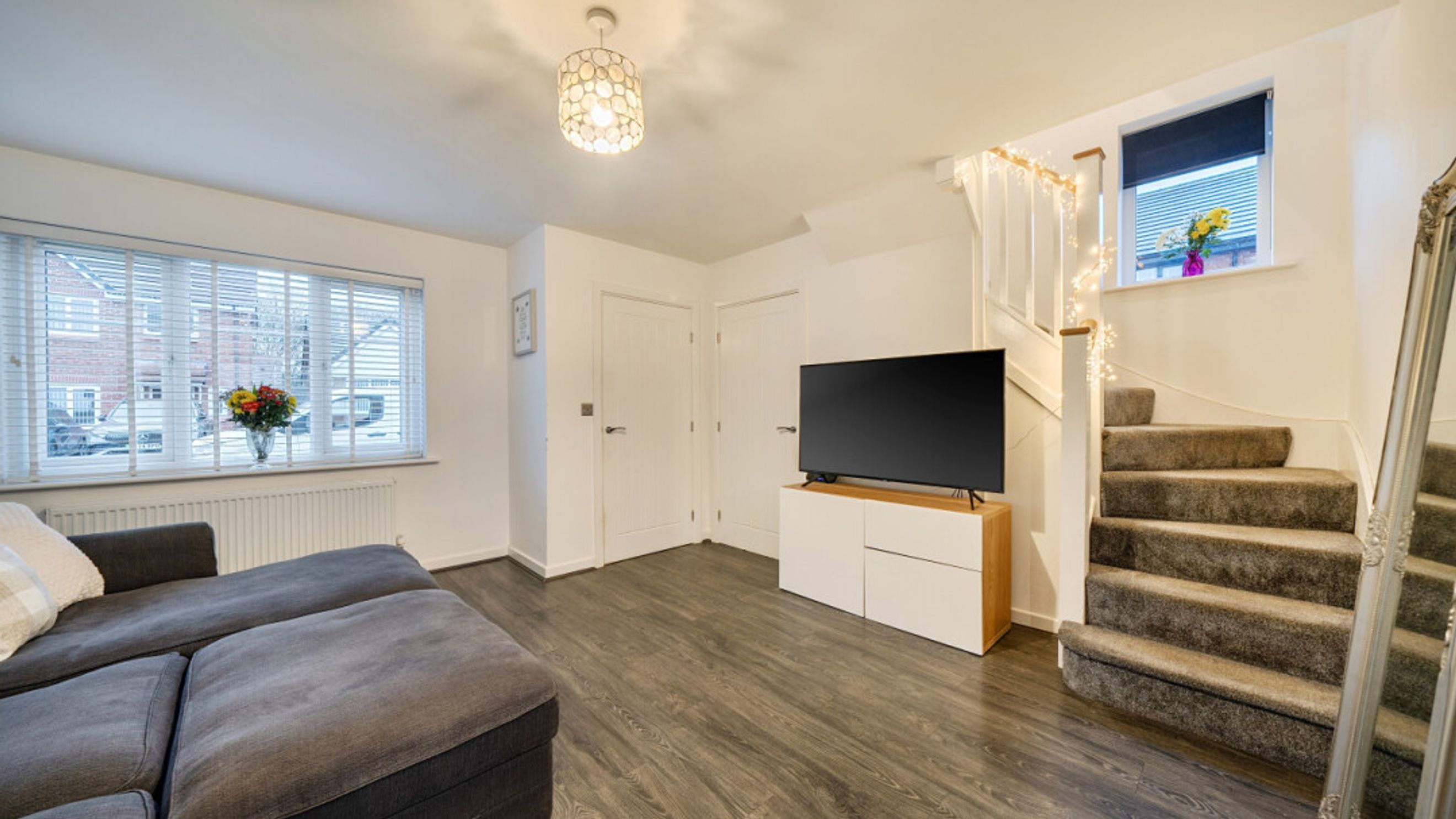 This bright and spacious semi-detached modern house, flooded with natural light, The kitchen is fitted with integrated appliances including a fridge freezer, oven, hob and extractor. Spacious main double bedroom benefitting from en-suite with shower and fitted wardrobes, as well as a bright and airy second double bedroom. The bathroom comes complete with a white three-piece suite with a shower over bath and a stone tile surround. Additional storage cupboards, large rear garden and private driveway