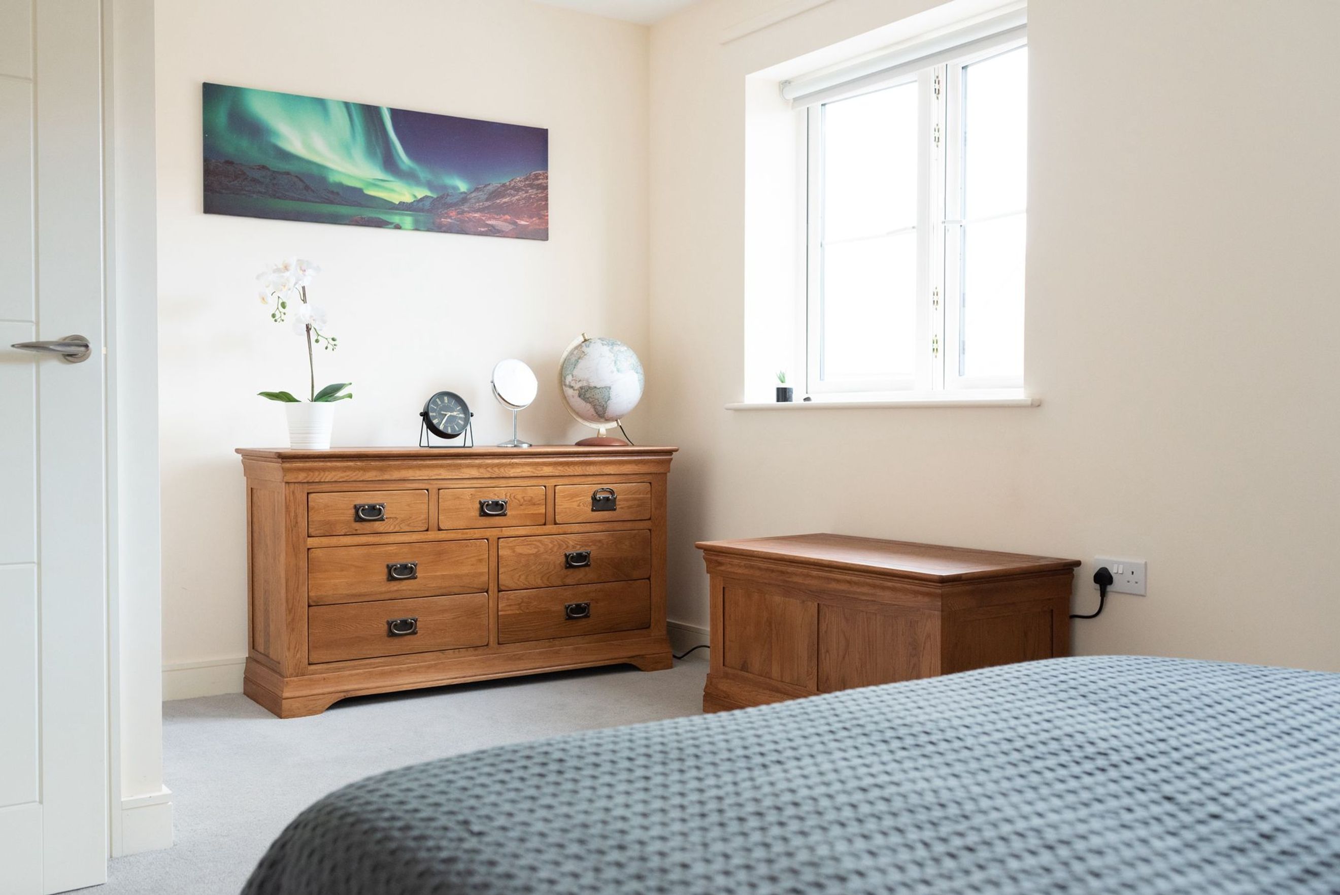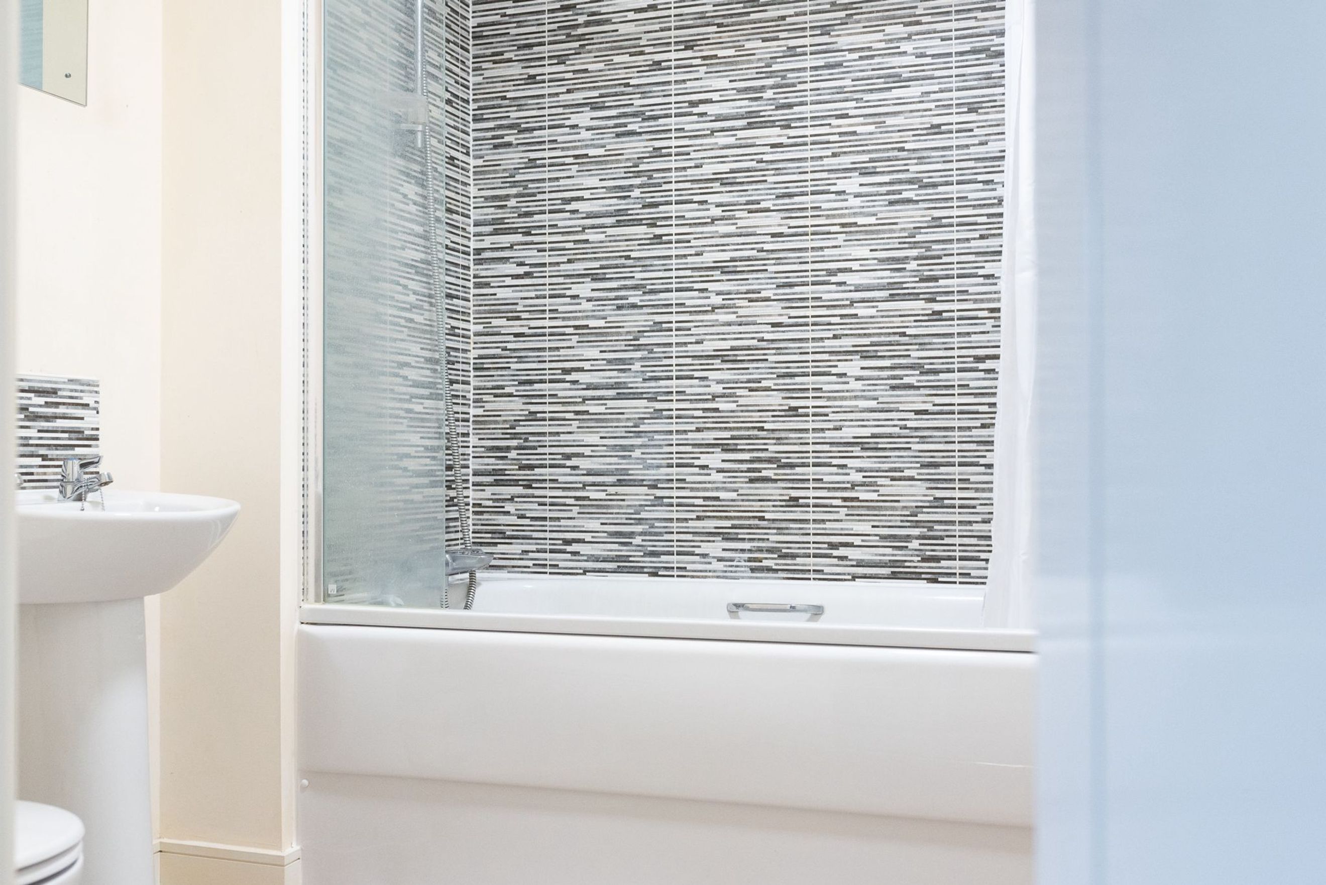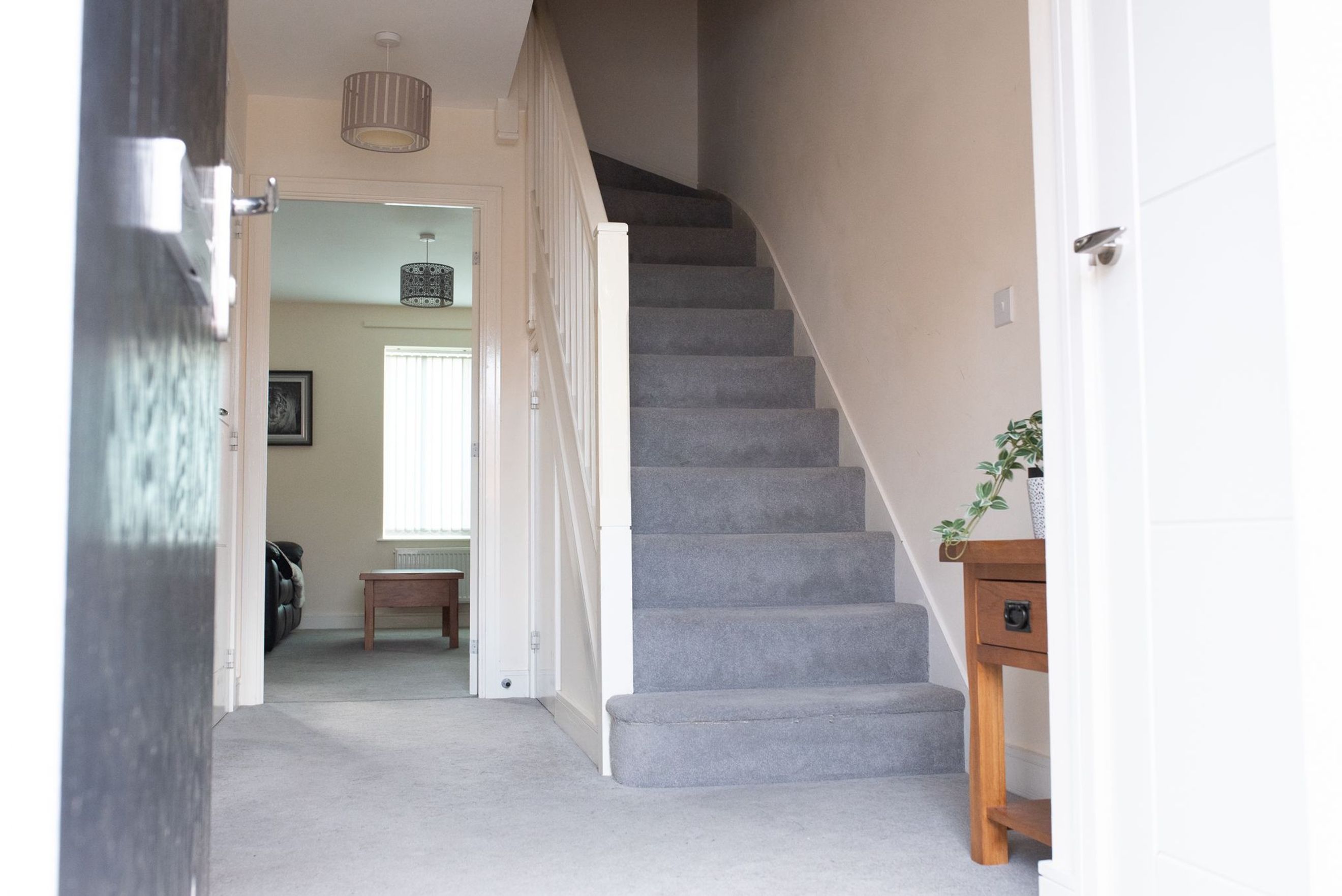 Upstairs are two double bedrooms, one featuring a built‑in cupboard, along with a family bathroom fitted with a three‑piece suite and shower over the bath.