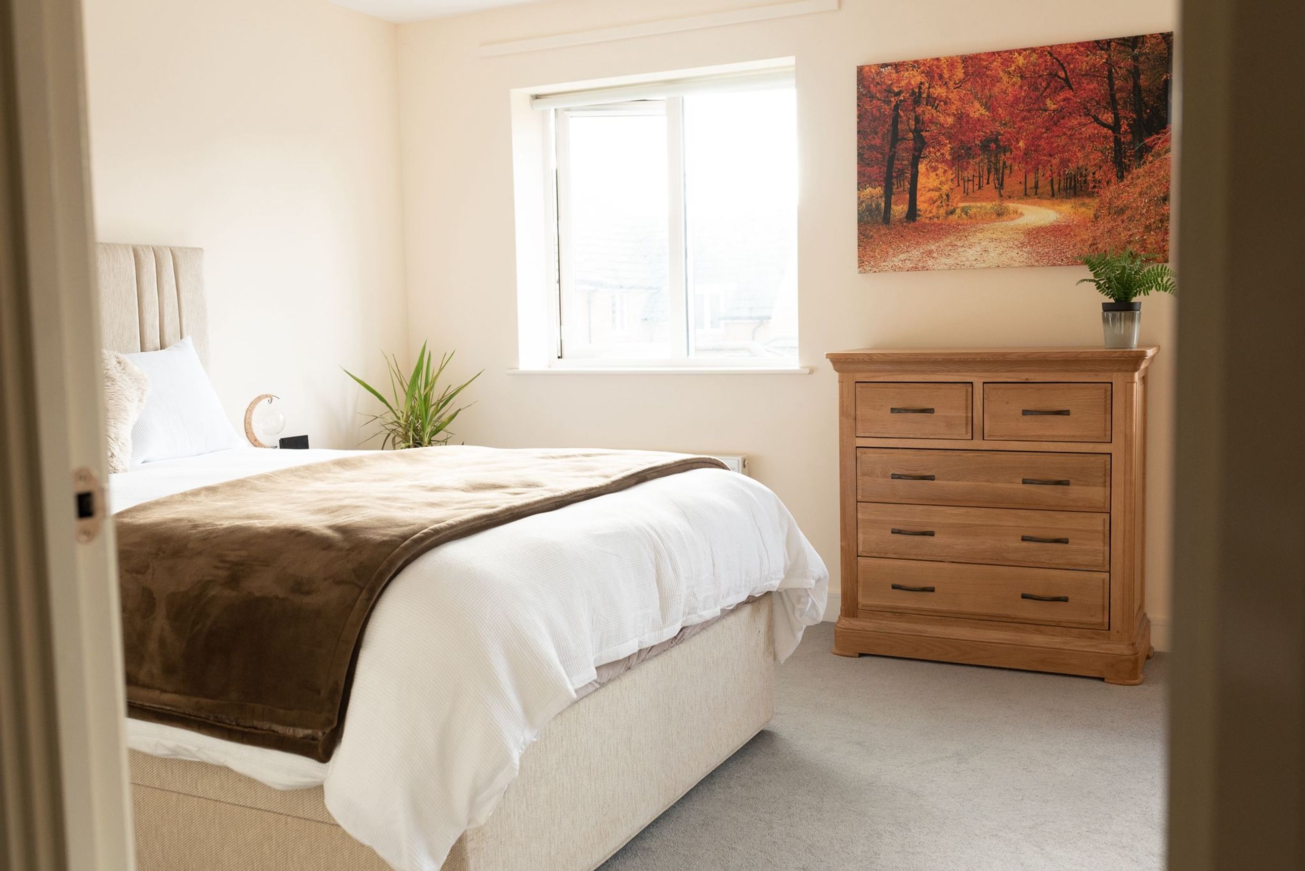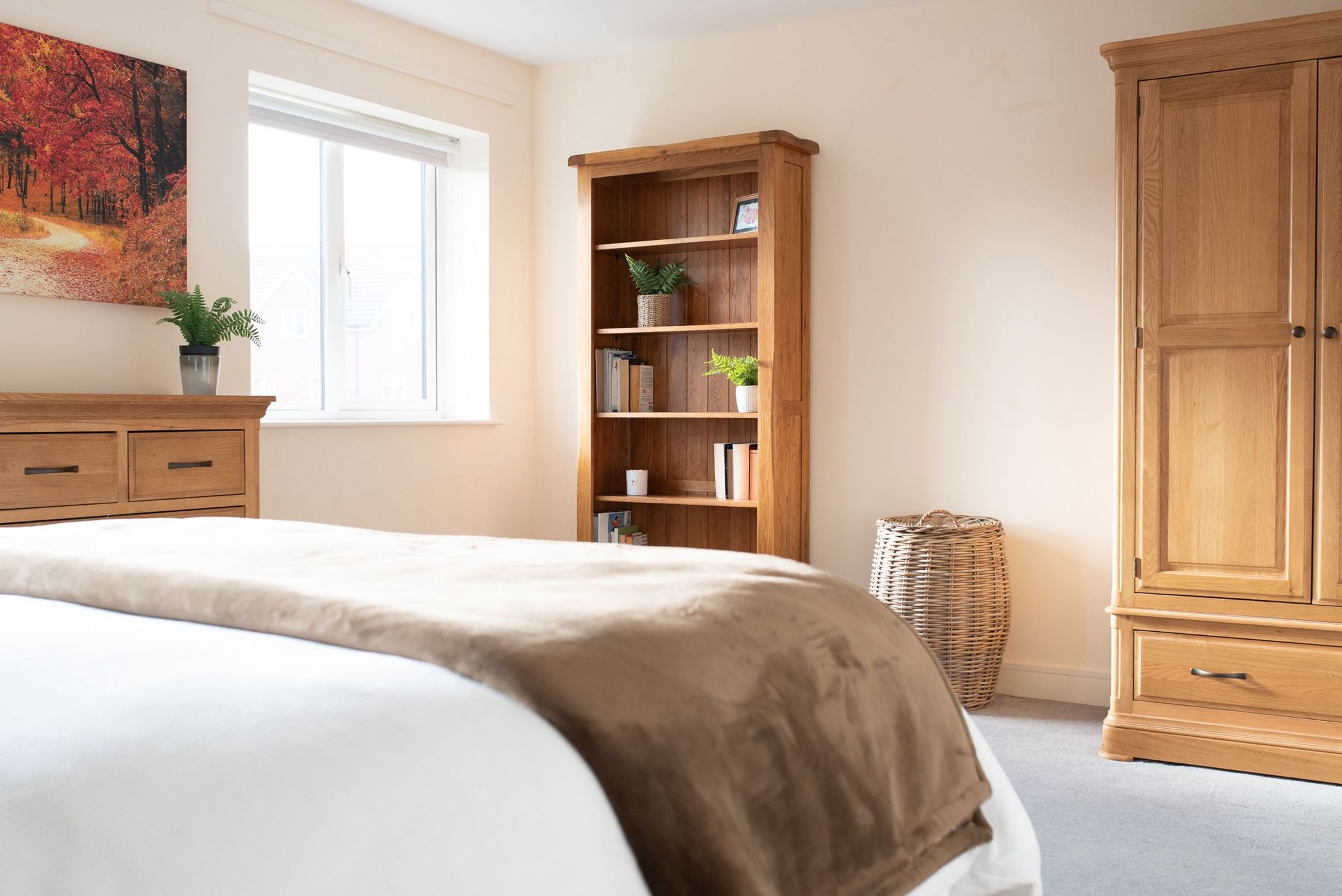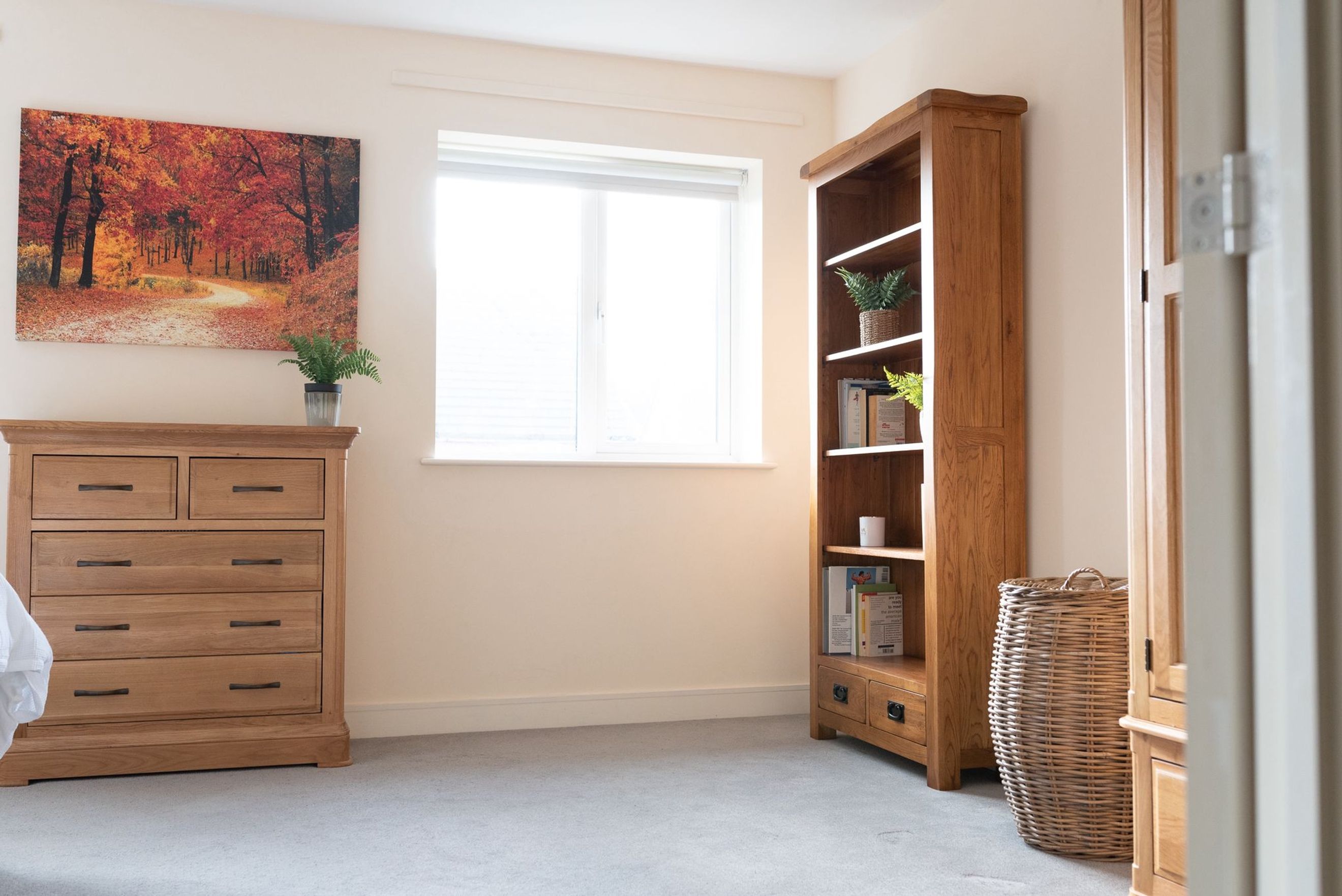 Upstairs are two double bedrooms, one featuring a built‑in cupboard, along with a family bathroom fitted with a three‑piece suite and shower over the bath.