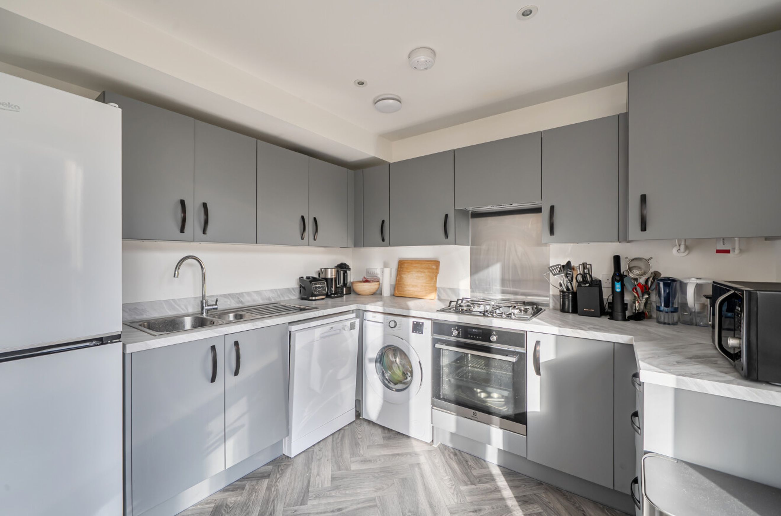 The kitchen is fitted with an integrated oven, hob and hood, with doors to your back garden. On this floor, you'll also find a WC and storage.