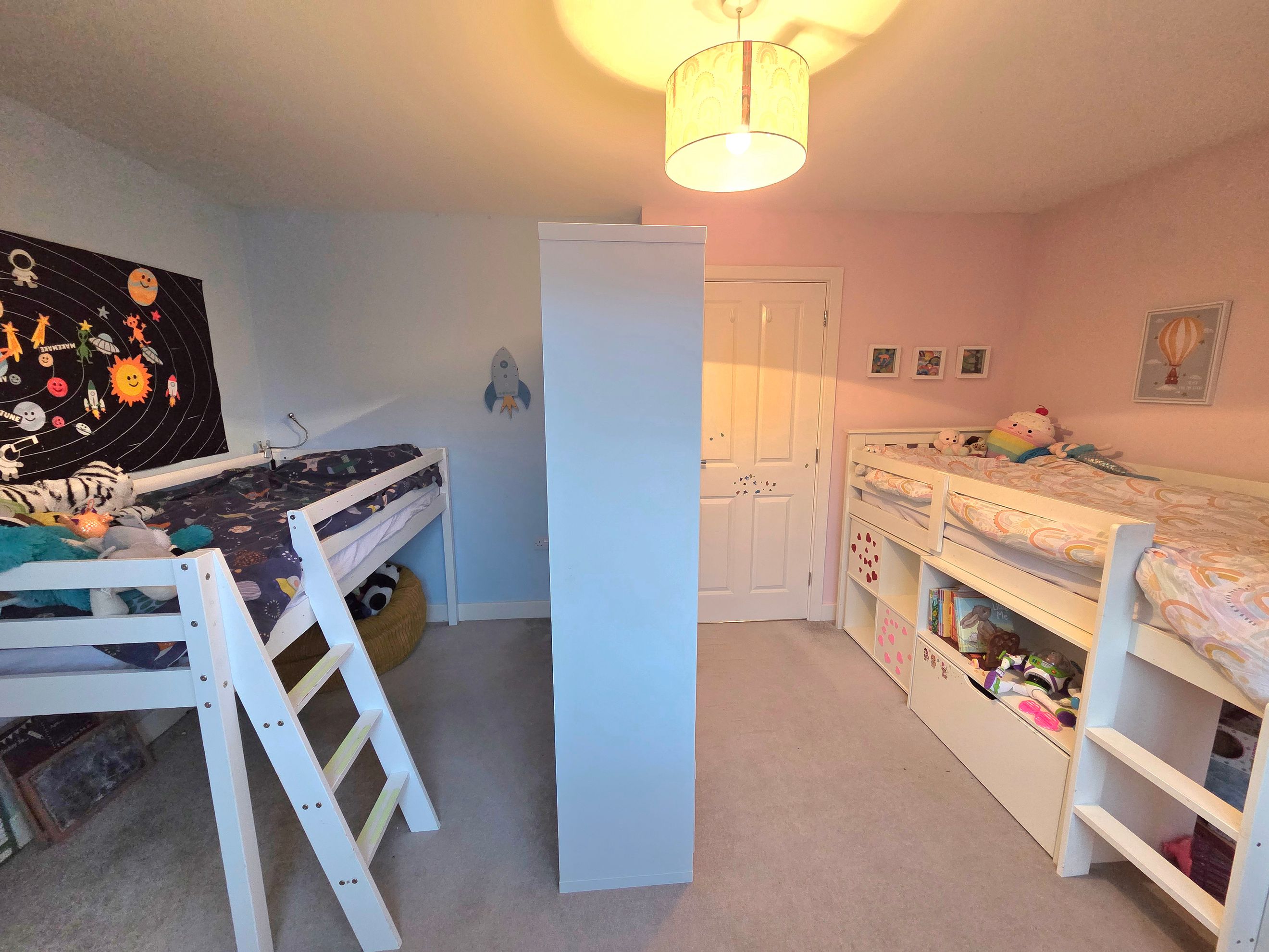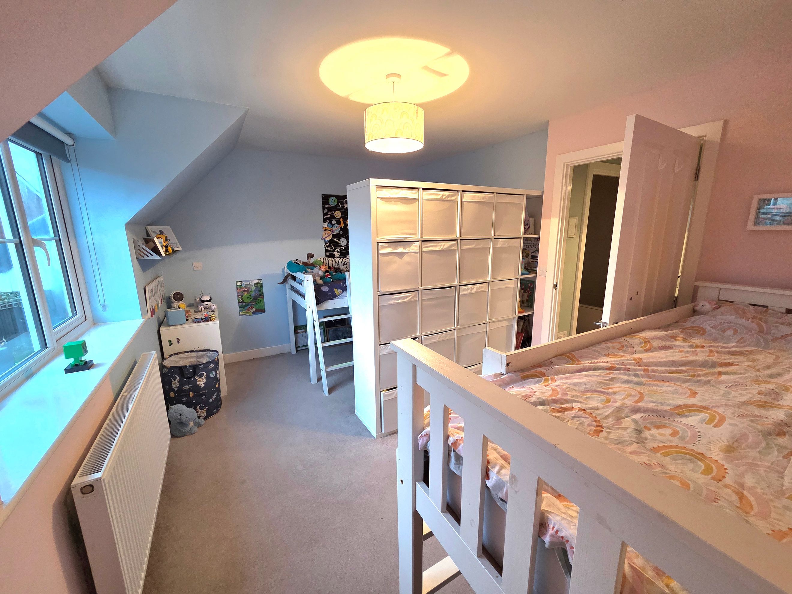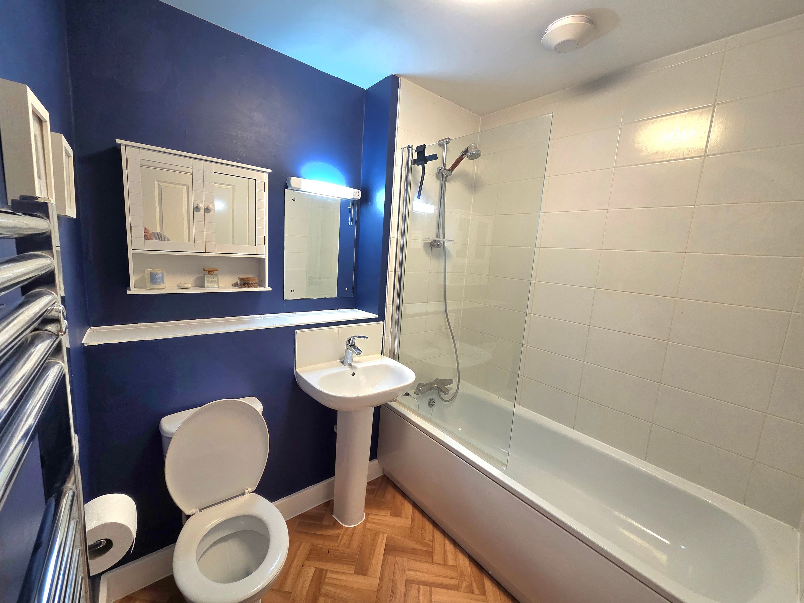Upstairs, you’ll find two spacious double bedrooms, one benefiting from its own built‑in storage cupboard. The family bathroom includes a classic three‑piece suite with a shower over the bath.
