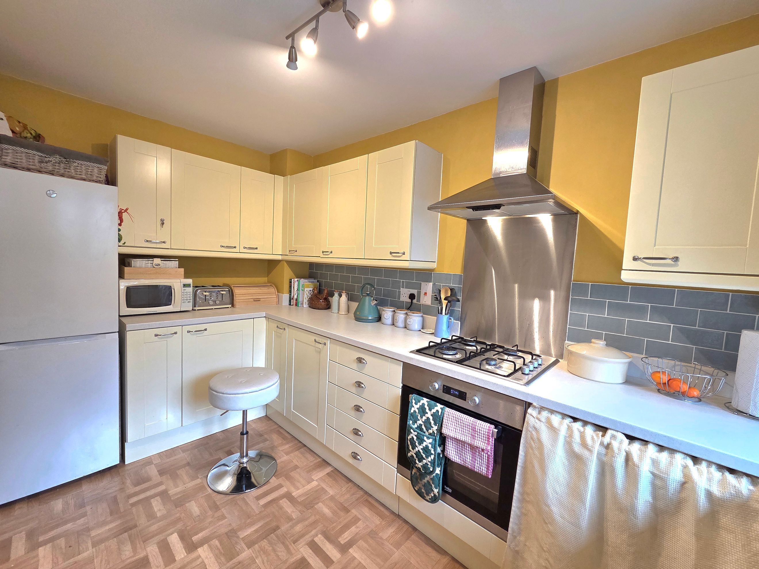 Theres an entrance hallway that leads to a well‑equipped kitchen featuring ample storage, an oven, hob, extractor fan, and dedicated space for both a washing machine and fridge‑freezer. The separate living/dining room is generously sized, complete with a useful storage cupboard and doors opening out to the rear garden. A convenient downstairs cloakroom adds to the thoughtful layout of the ground floor.