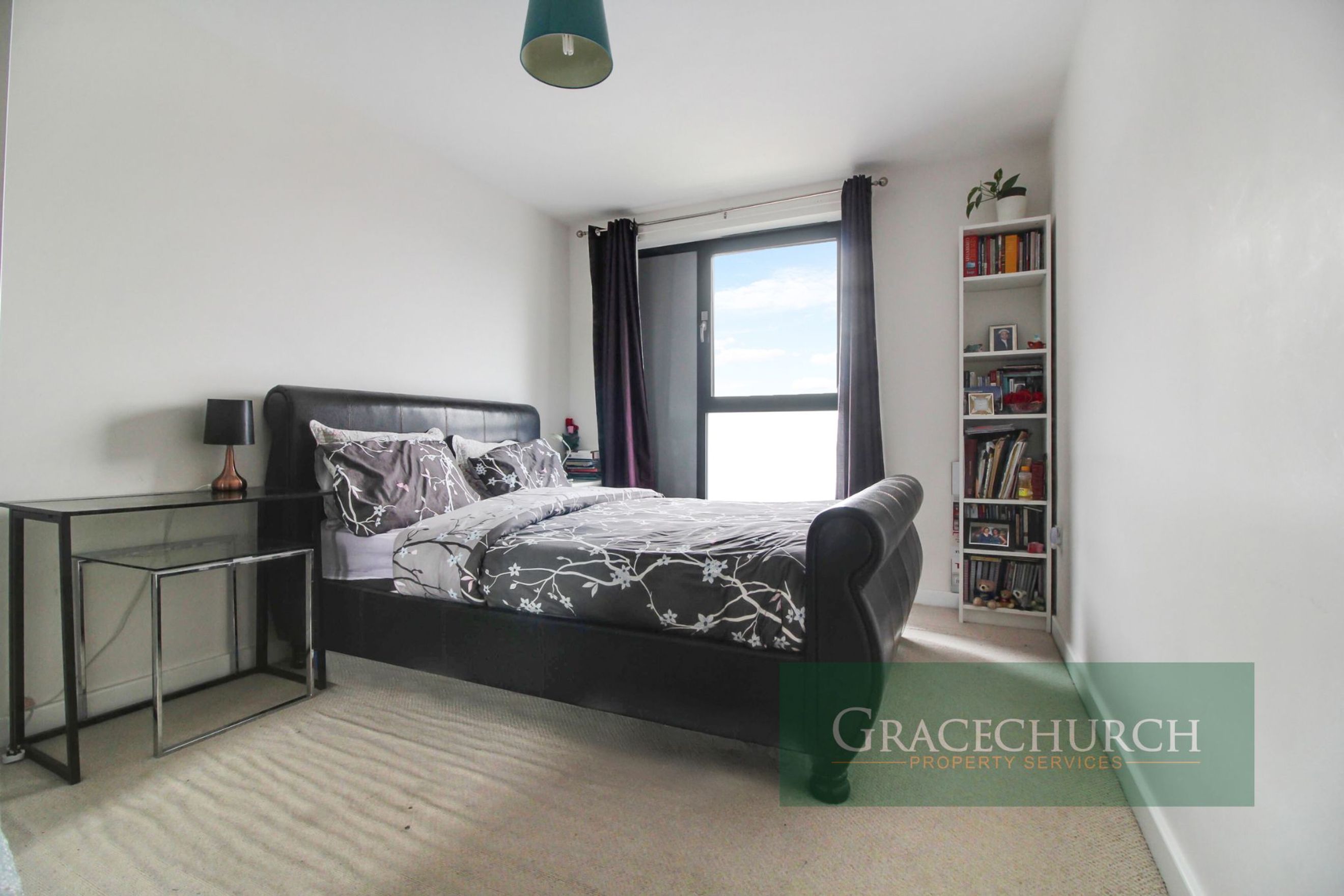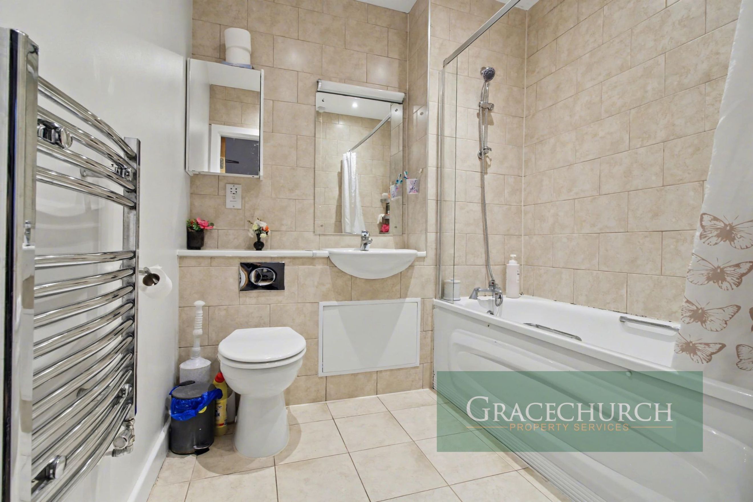 The double bedroom is generously proportioned and enjoys a calm, bright outlook, comfortably accommodating wardrobes and additional furnishings. The modern bathroom is finished in neutral tones and features a three-piece suite with a shower over bath and full-height tiling, creating a clean and timeless aesthetic.