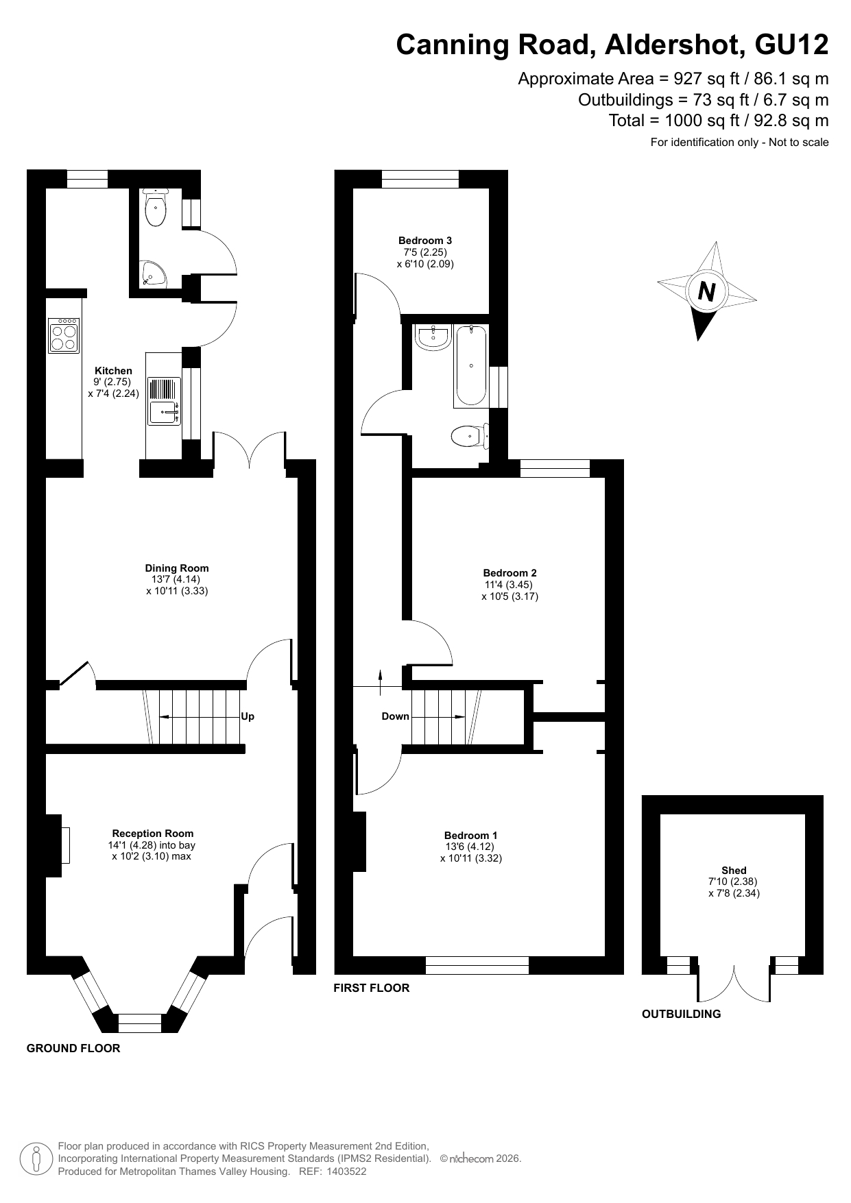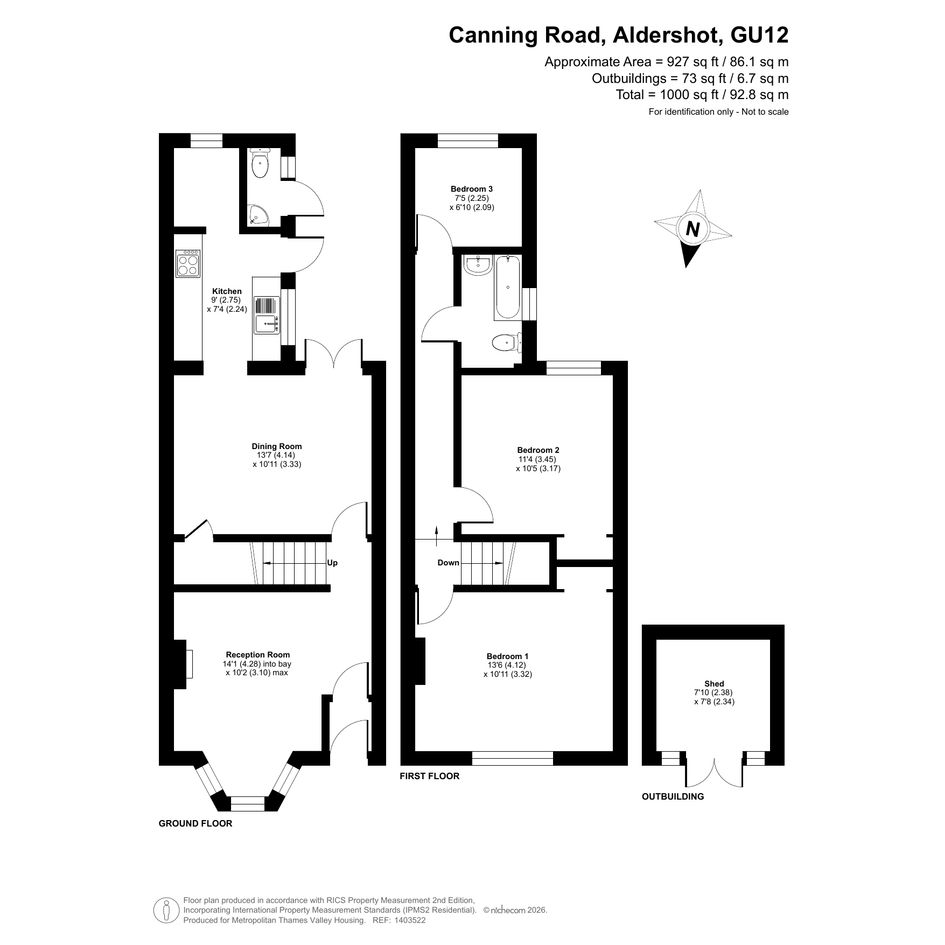 The property features an entrance hall, a reception room, a separate kitchen and dining room, and a toilet on the ground floor. On the first floor, there are three bedrooms and one family bathroom.