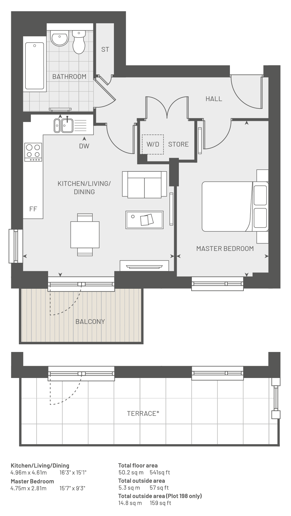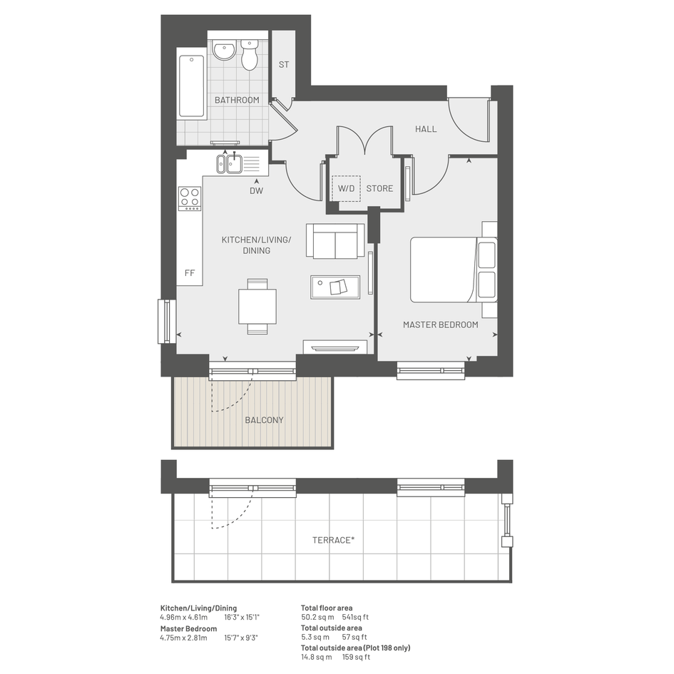 Plot 198, The Cherry, 1 bed, 1 bath apartment with balcony- 541 Sq Ft