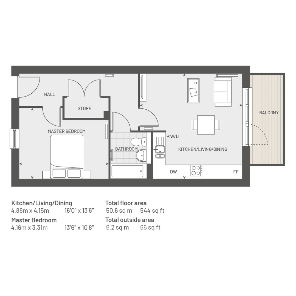Plot 064,The Barnwell, 1 bed, 1 bath, balcony- 544 Sq Ft