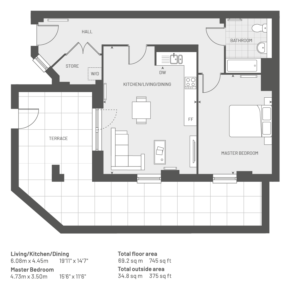 Plot 199, The Clematis is a beautifully designed one-bedroom ground-floor home offering an impressive 745 sq ft of thoughtfully arranged living space in one of North London's most desirable neighbourhoods.
