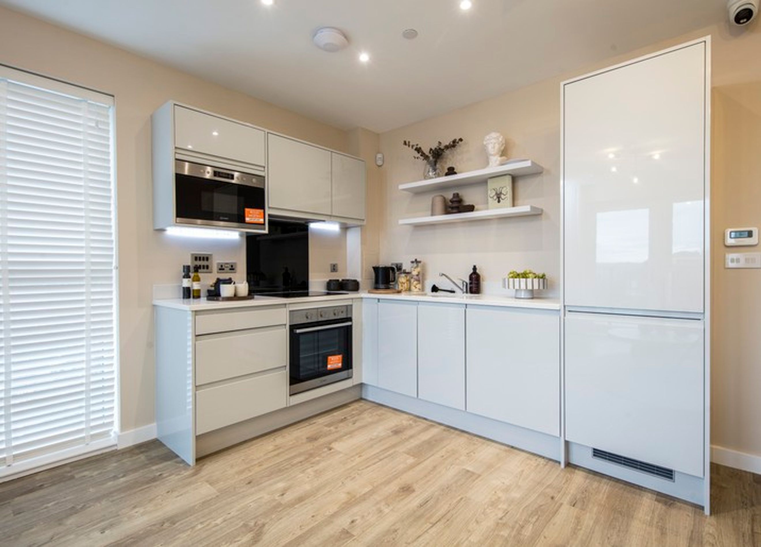 Upon entering, you are welcomed into a spacious open plan kitchen and living area, carefully designed to balance style, comfort, and practicality. The L shaped kitchen is finished with sleek handleless gloss cabinetry, Quartz 'Salt and Pepper' worktops, and fully integrated appliances, creating a modern and functional space ideal for cooking, entertaining, or relaxing.