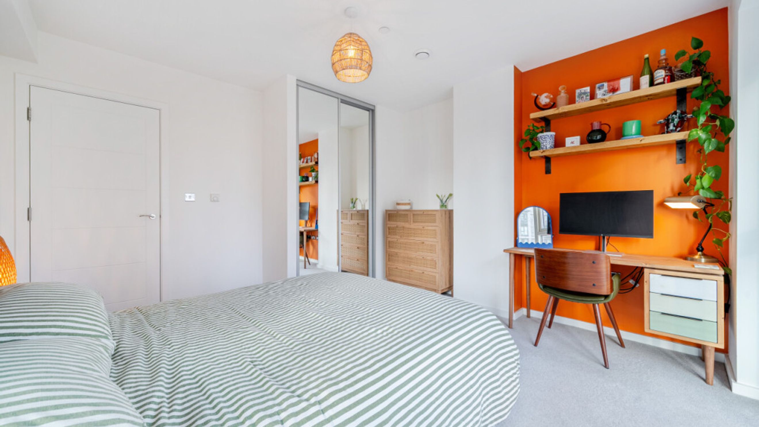 Retreat to the generously sized double bedroom, complete with built in wardrobes, ample storage, and elegant custom fitted wooden blinds and curtains that enhance the room's warmth and character. The sleek bathroom features beautiful grey tiling, white wall finishes, and a shower over bath, offering a serene and stylish space to unwind.