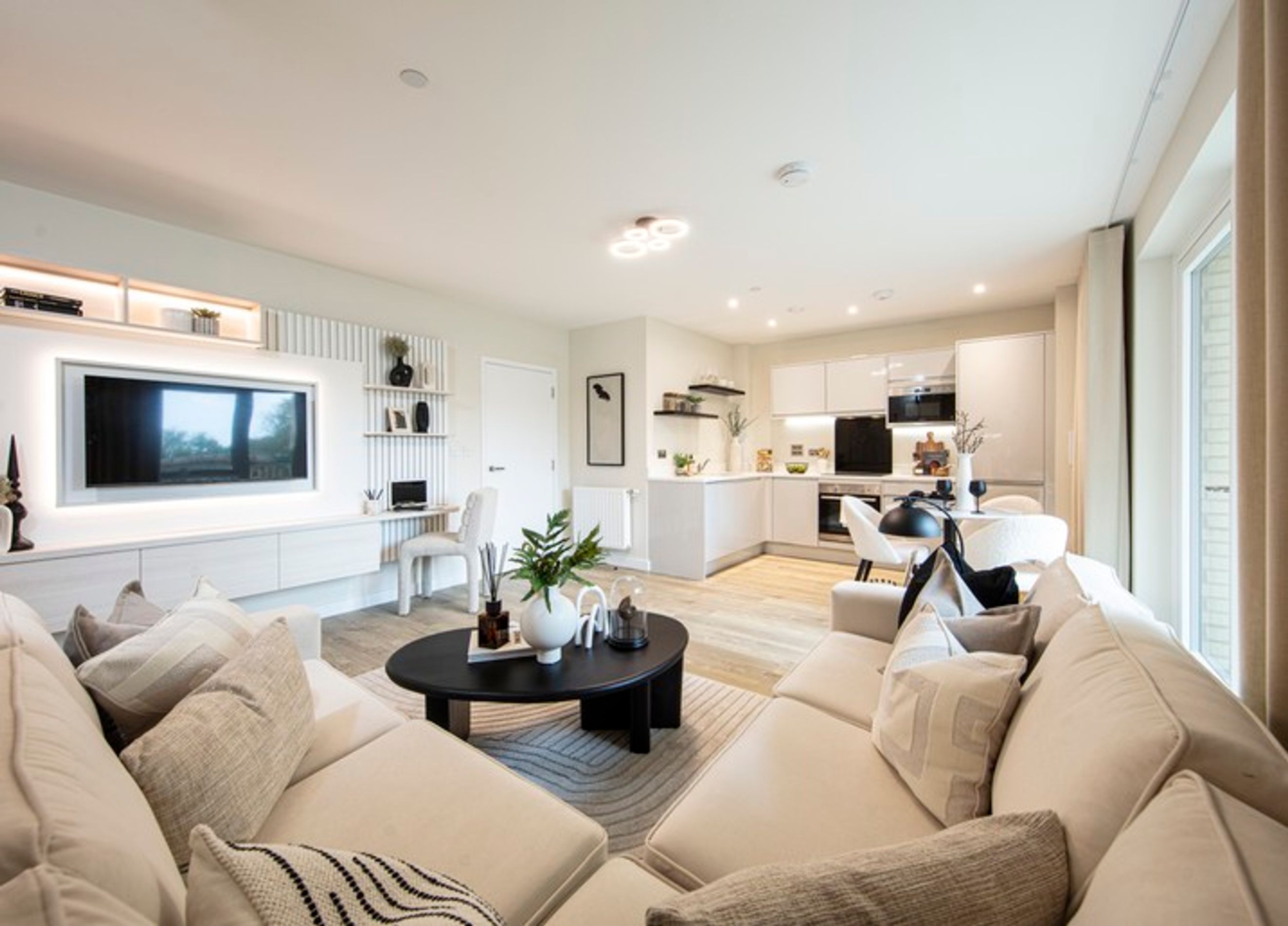 Step inside to a spacious entrance hallway that flows seamlessly into an impressive open-plan L-shaped kitchen and living area, thoughtfully designed to balance contemporary style with everyday practicality. The kitchen showcases sleek gloss handleless cabinetry, Quartz 'Salt and Pepper' worktops, and fully integrated appliances, delivering both elegance and efficiency. The bright, modern living space is finished with stylish flooring and flooded with natural light, creating an inviting setting for relaxing or entertaining.