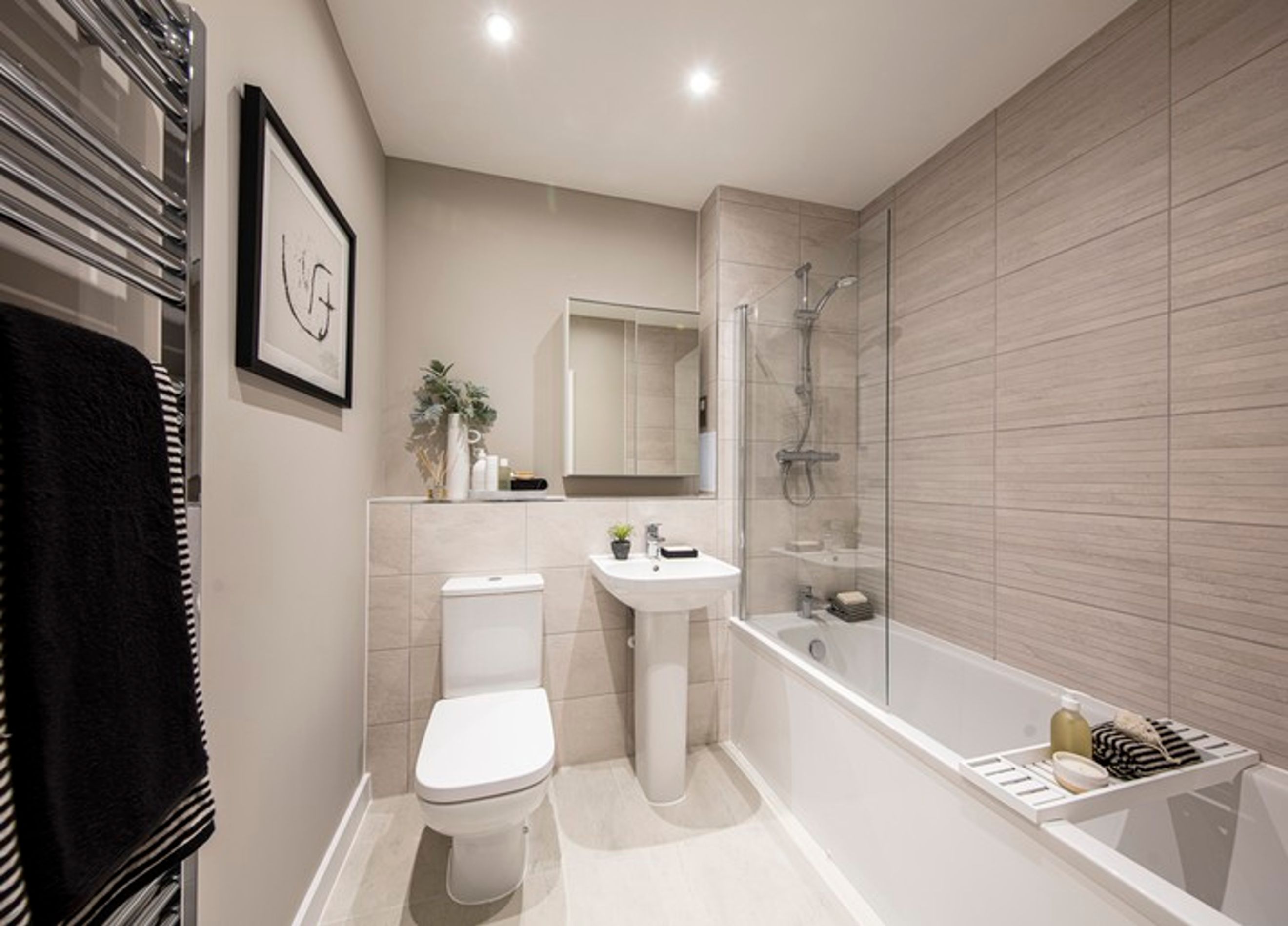The generous principal bedroom offers a calm and comfortable sanctuary, complete with a contemporary en suite bathroom. The second bedroom is equally light and well-proportioned, while the versatile third bedroom provides ideal flexibility as a home office, nursery, or guest room. A separate family bathroom adds a touch of luxury, featuring porcelain tiling, a heated towel rail, and elegant white sanitaryware.