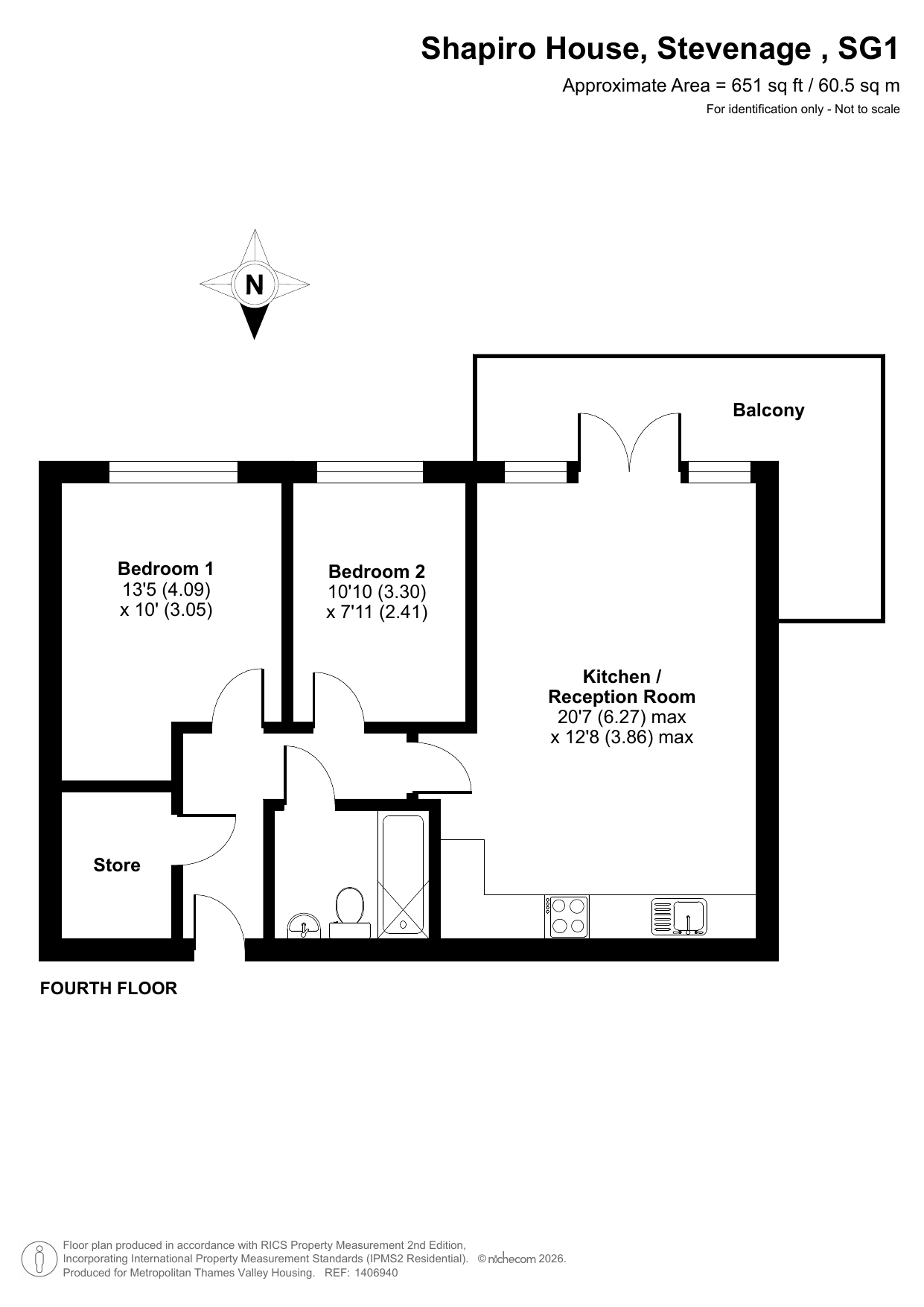 The apartment features an entrance hallway, an open-plan living room and kitchen, two bedrooms, and a bathroom.