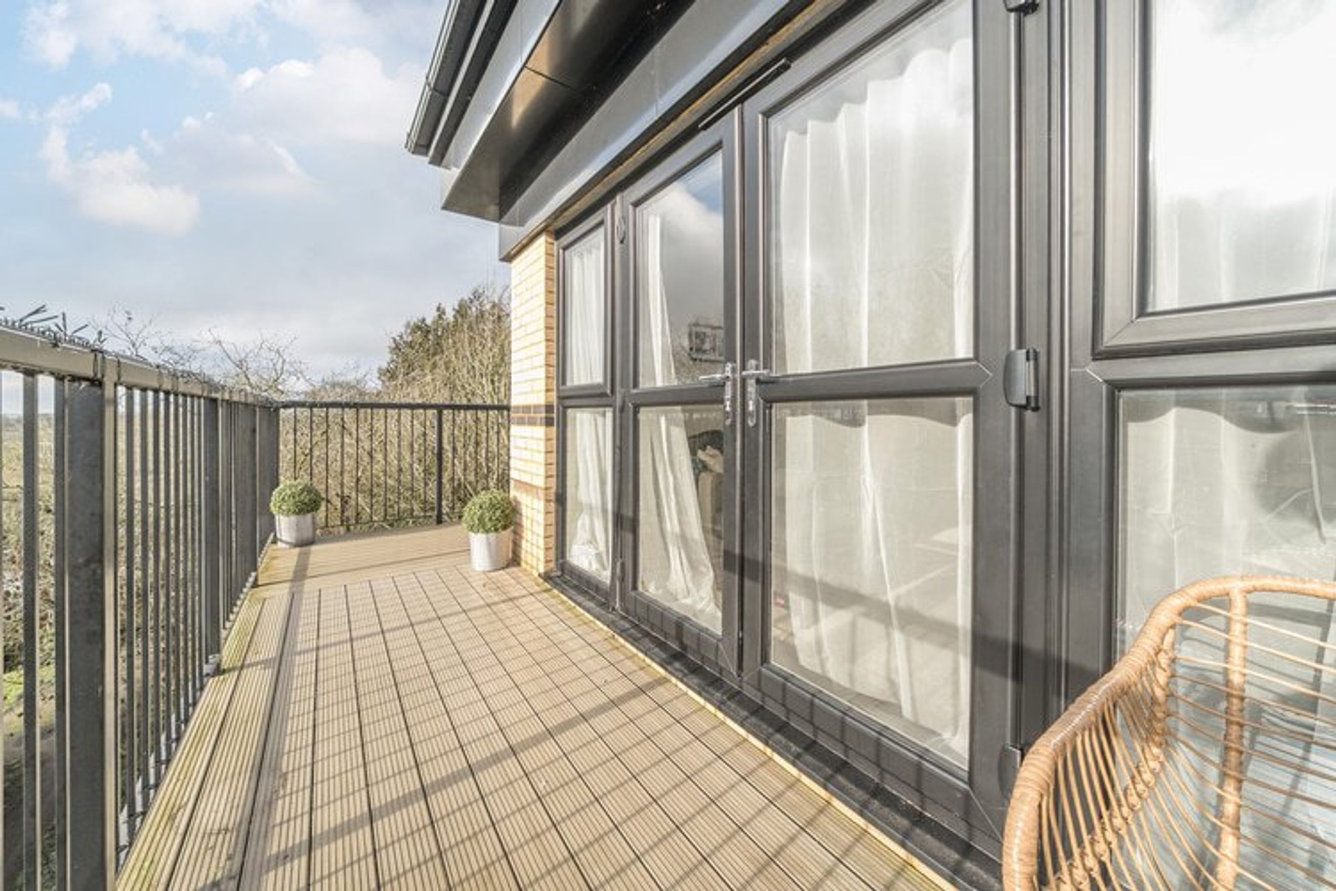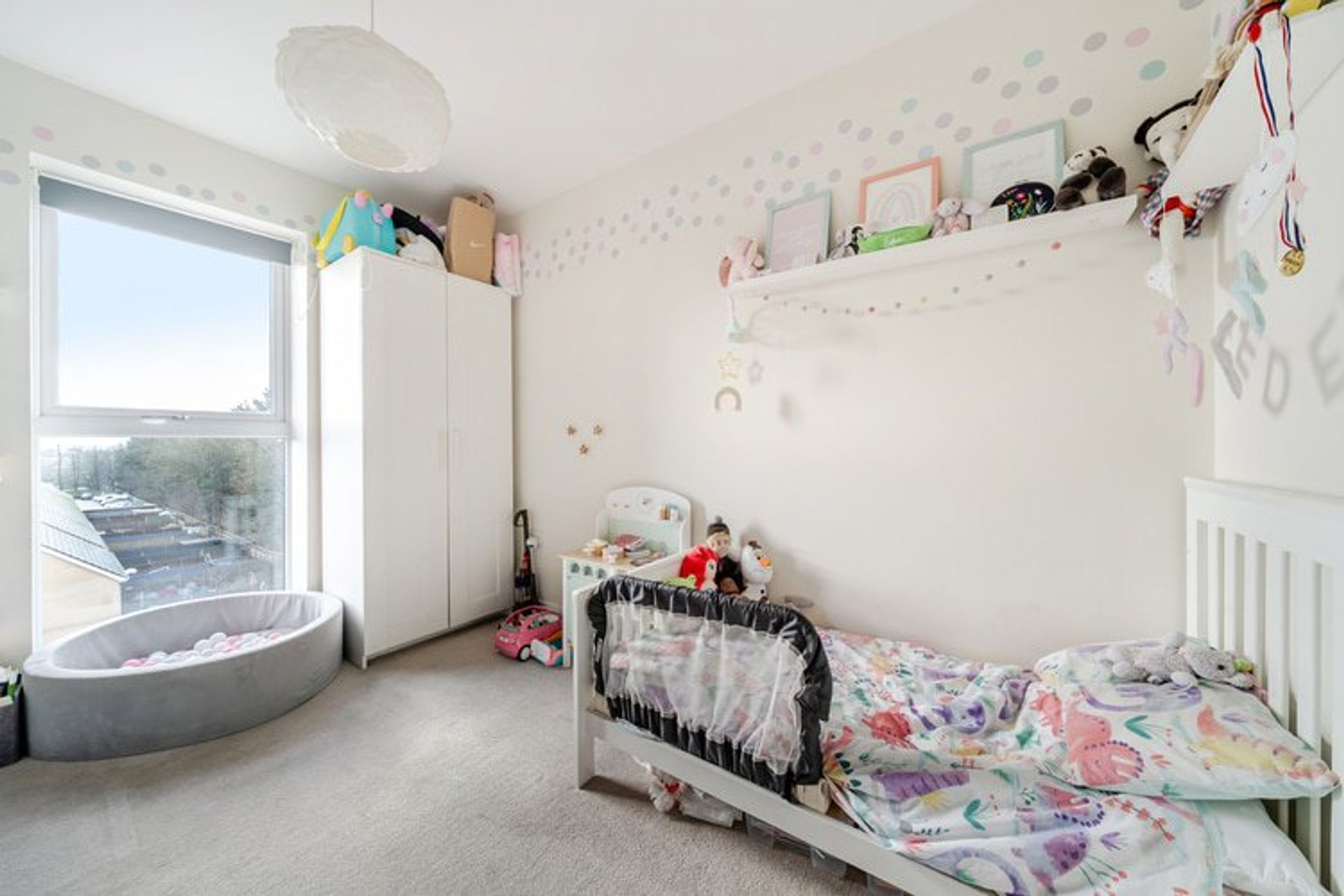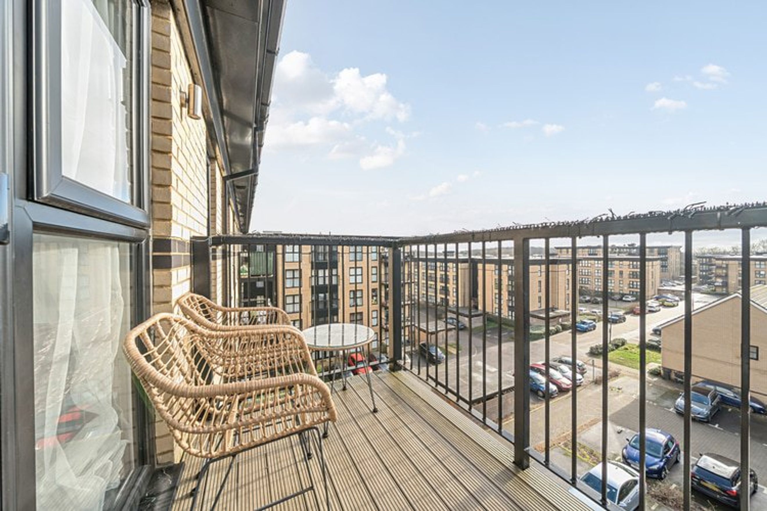 The flat offers residents a wrap-around balcony, allocated off-street parking and access to a shared garden area.