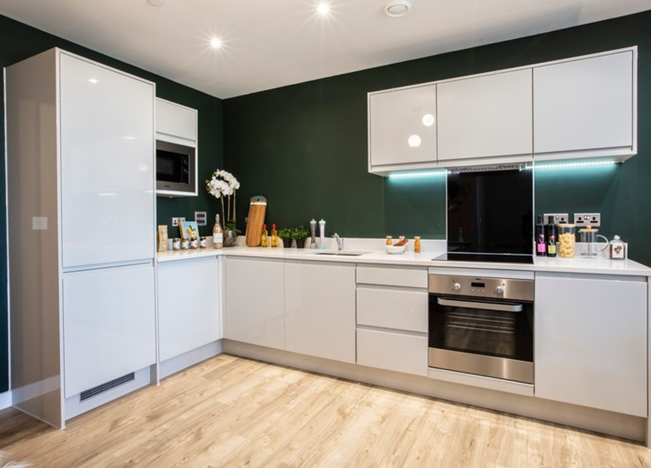 Welcome 'The Elder' - A 782 sq ft two-bedroom apartment on the second floor at Southall Grove. It features an open-plan kitchen, living, and dining area with an L-shaped kitchen, Quartz 'Salt & Pepper' worktops, integrated appliances, and modern cabinetry. Amtico Spacia 'Sun Bleached Oak' flooring runs throughout the living space and has lots of natural light.