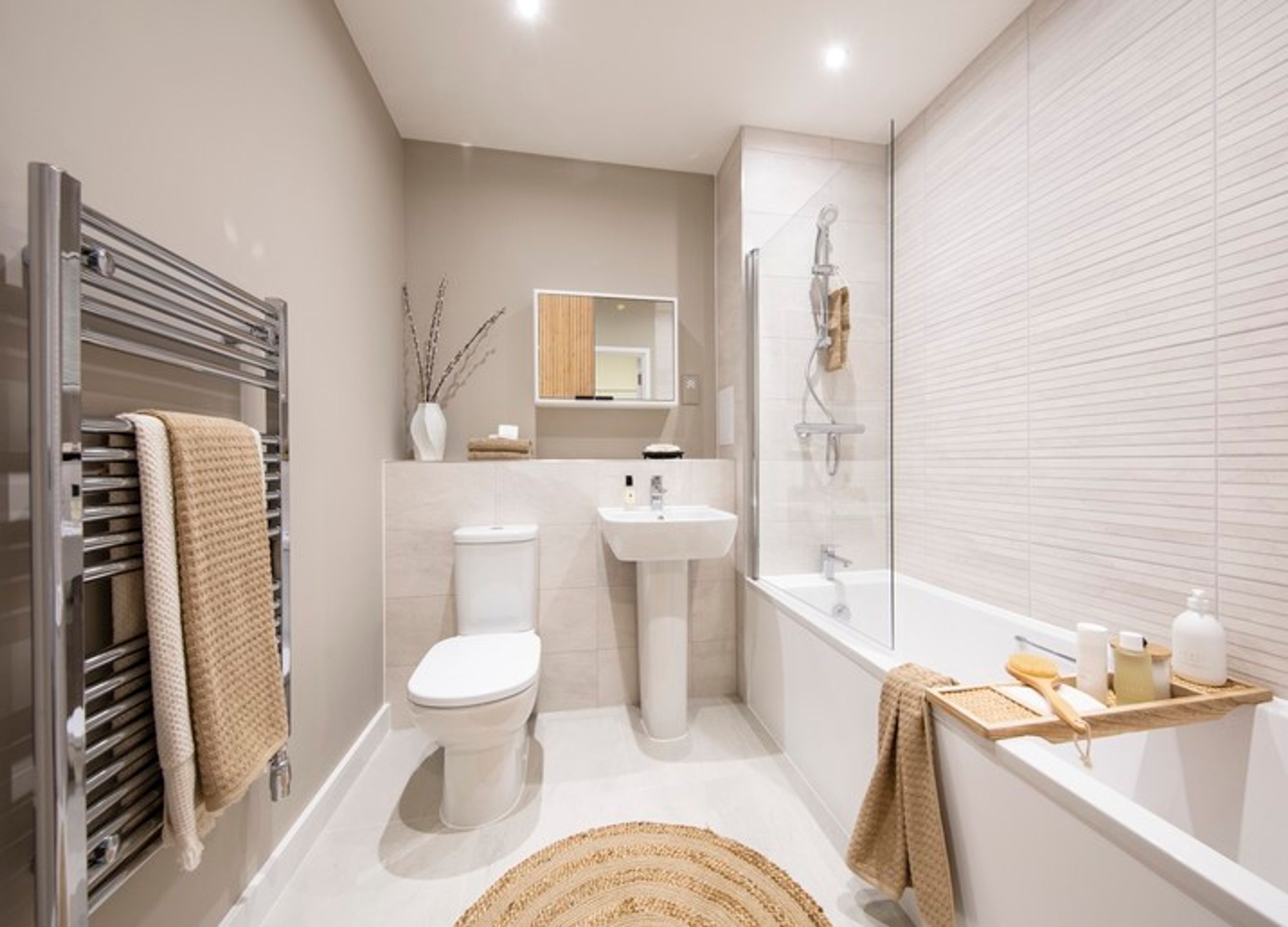 Both bedrooms are doubles, finished with grey carpets. The master includes an en-suite, and there's a separate bathroom with white sanitaryware, chrome fittings, and a heated towel rail. Built-in storage adds further practicality.