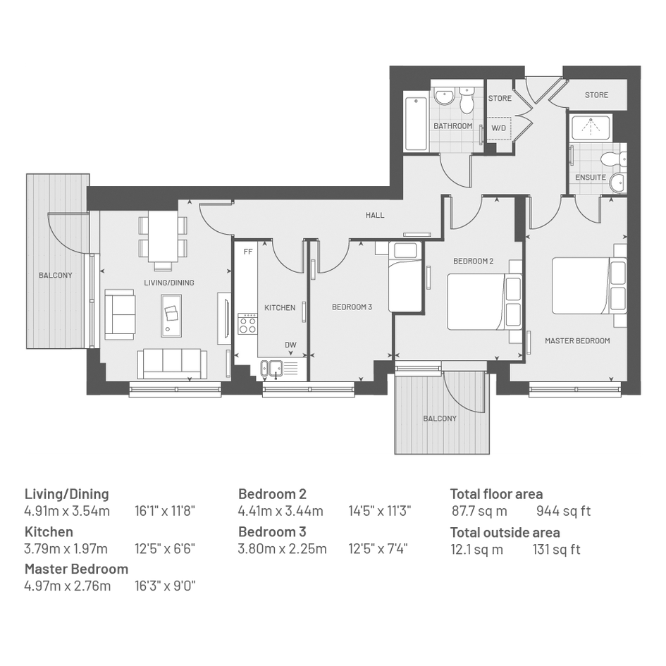 Introducing 'The Larch' - A 944 sq ft three-bedroom apartment on the 9th floor of Southall Grove. It includes a separate L-shaped kitchen with an open-plan living and dining area with natural light and open views of Southall Park.