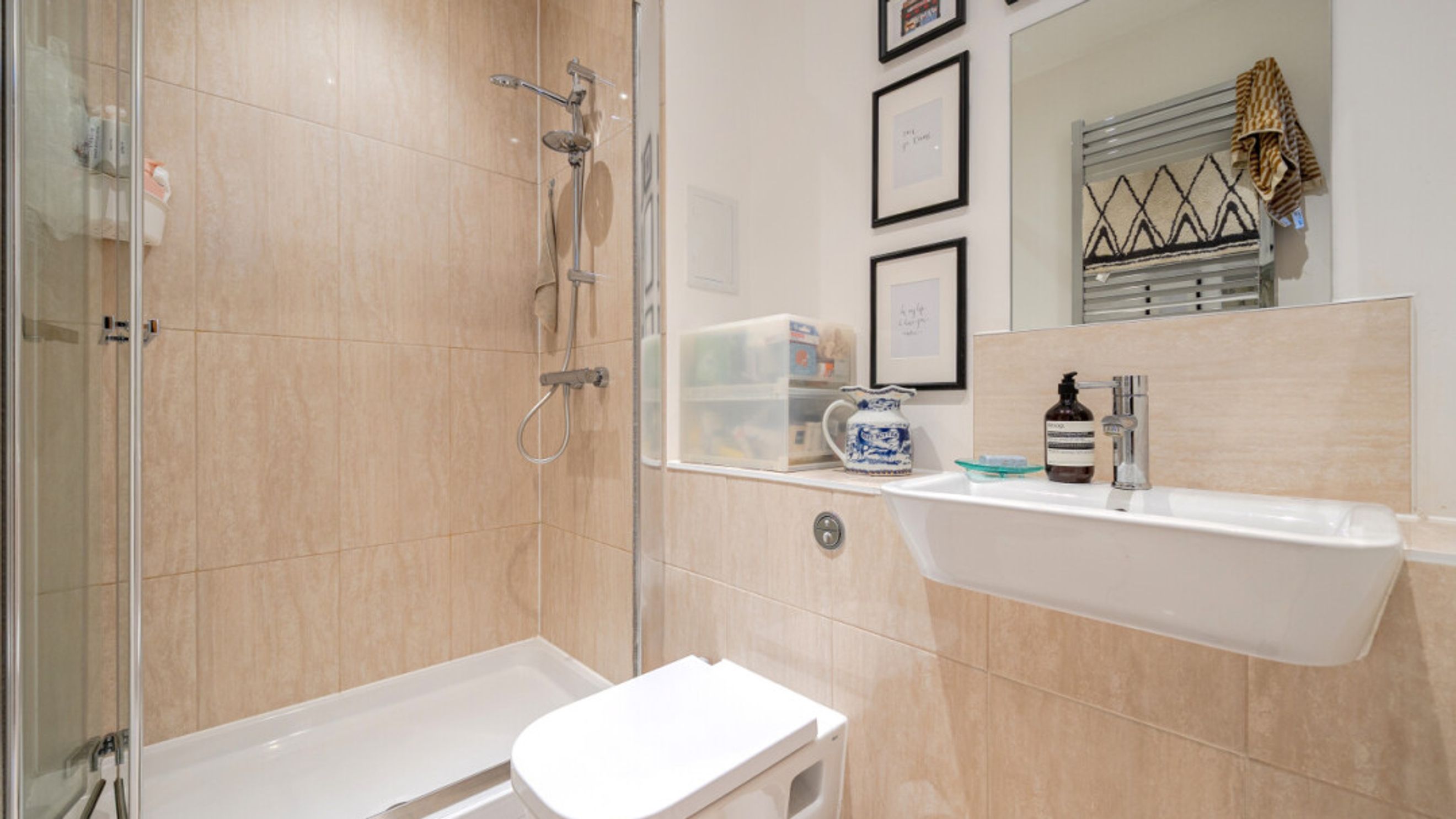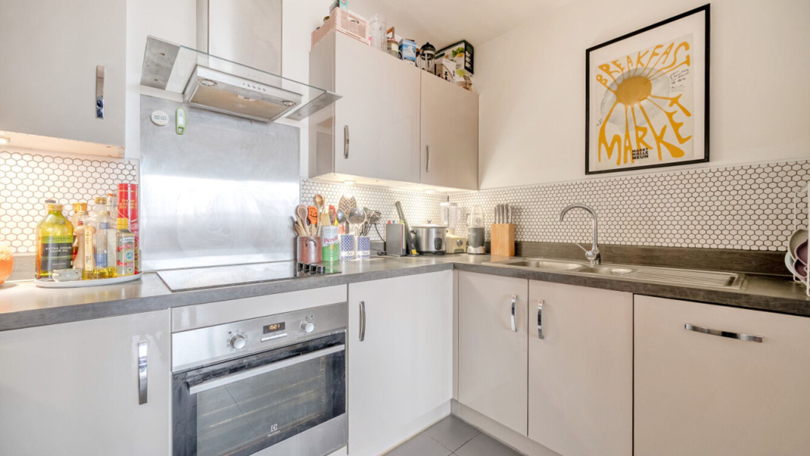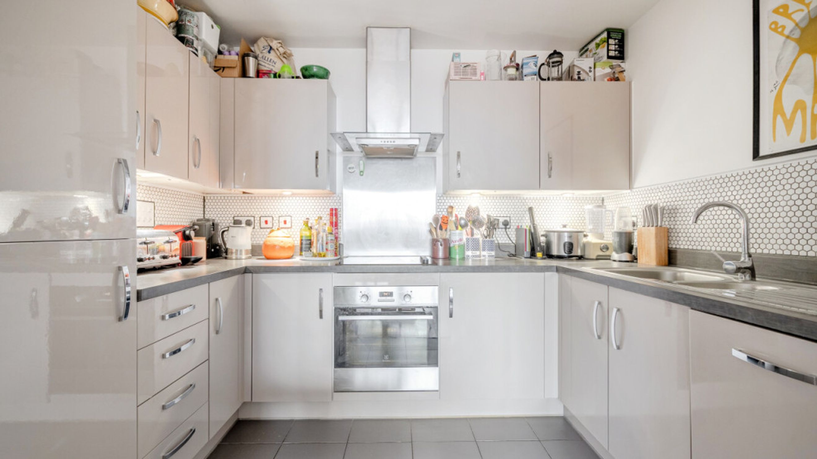 This bright and spacious west facing apartment consists of a stylish dual aspect open-plan kitchen and living area, flooded with natural light from wide floor-length windows that open onto a private balcony with rooftop views. The kitchen is fitted with high gloss units, and benefits from integrated appliances including a fridge freezer, oven, hob, extractor fan and dishwasher. There are two good sized double bedrooms, the master having built in storage and an en-suite shower room. A contemporary family bathroom bathroom comes complete with a white three-piece suite with a shower over bath and a stone tile surround.