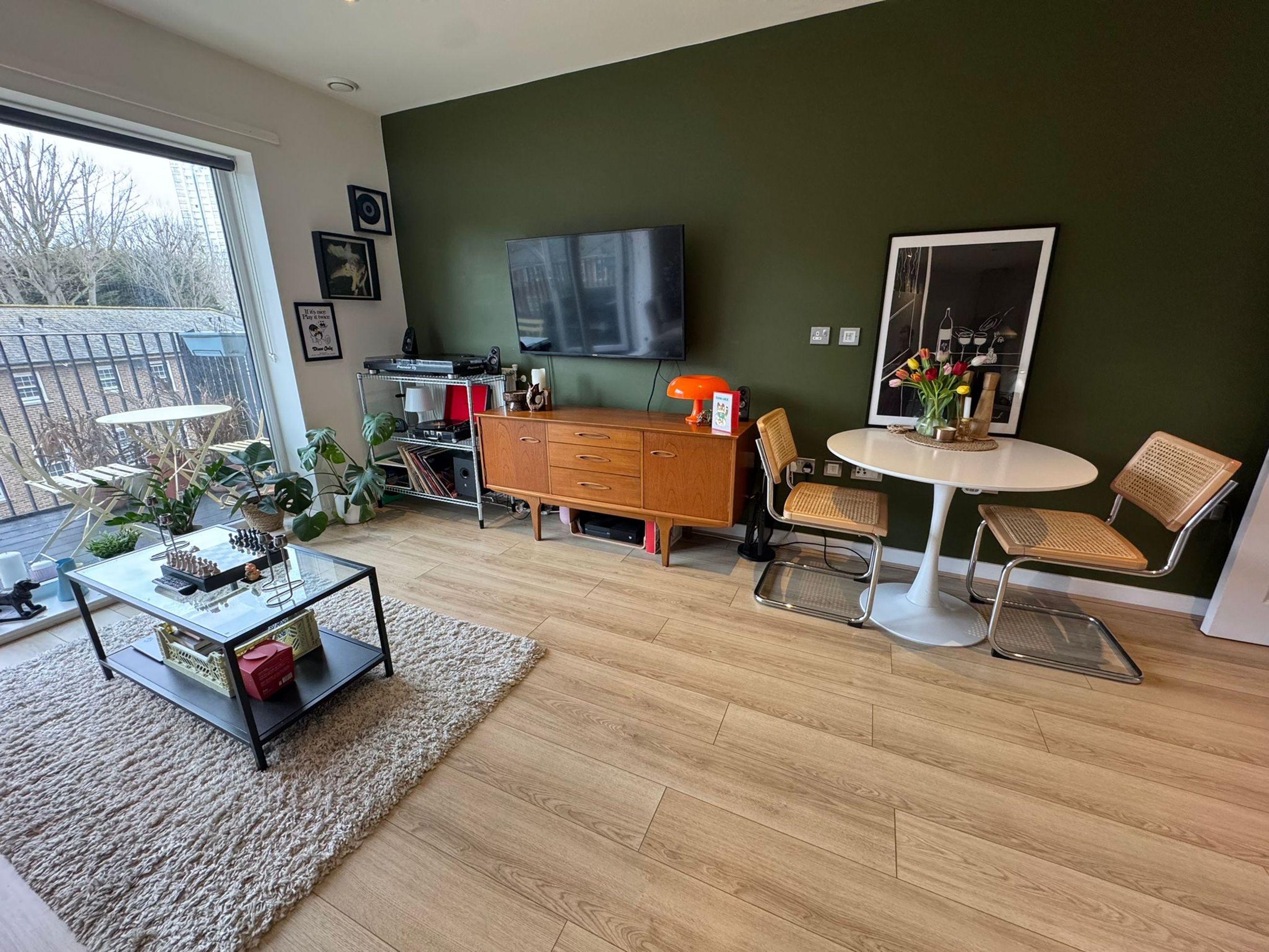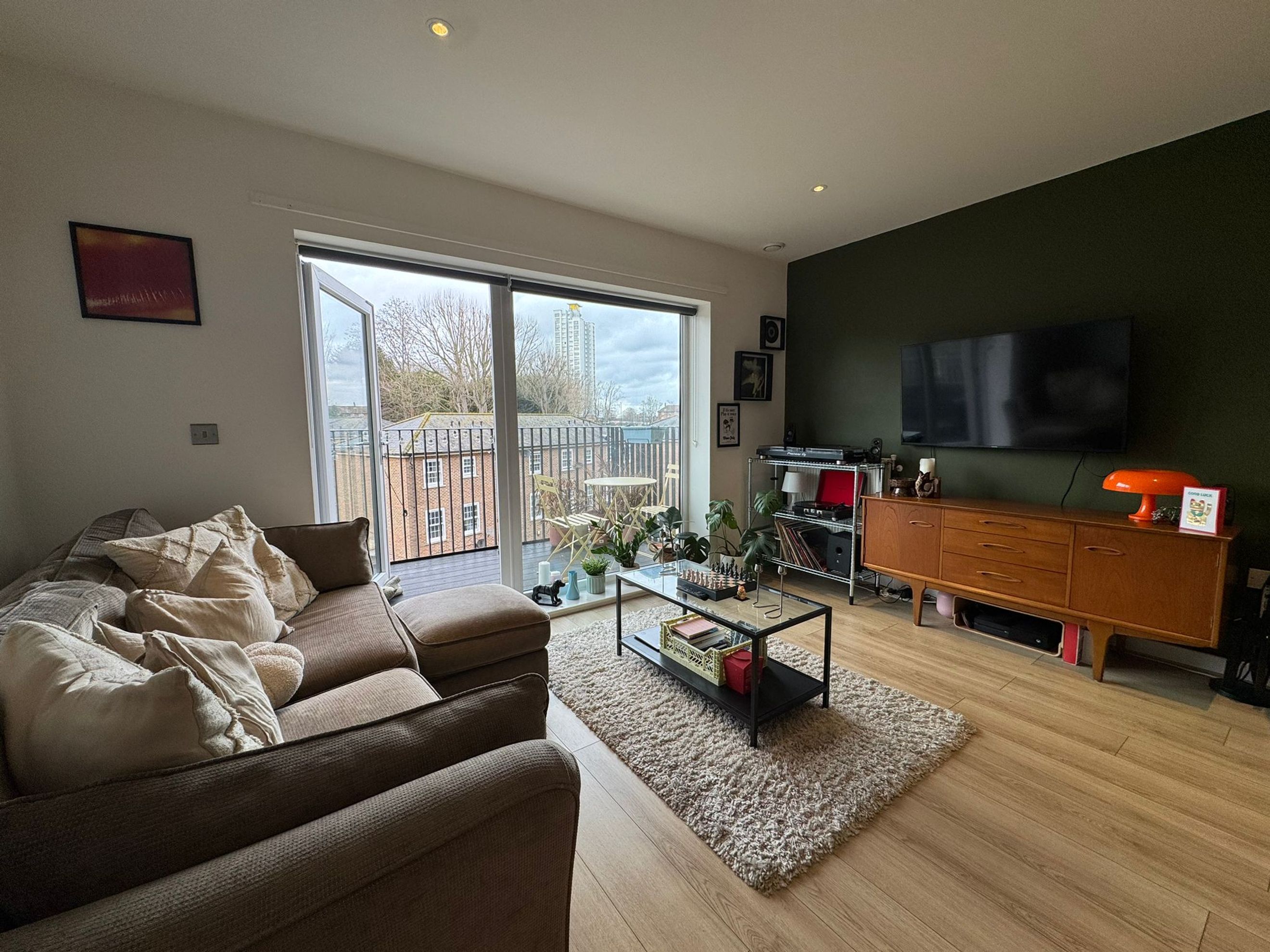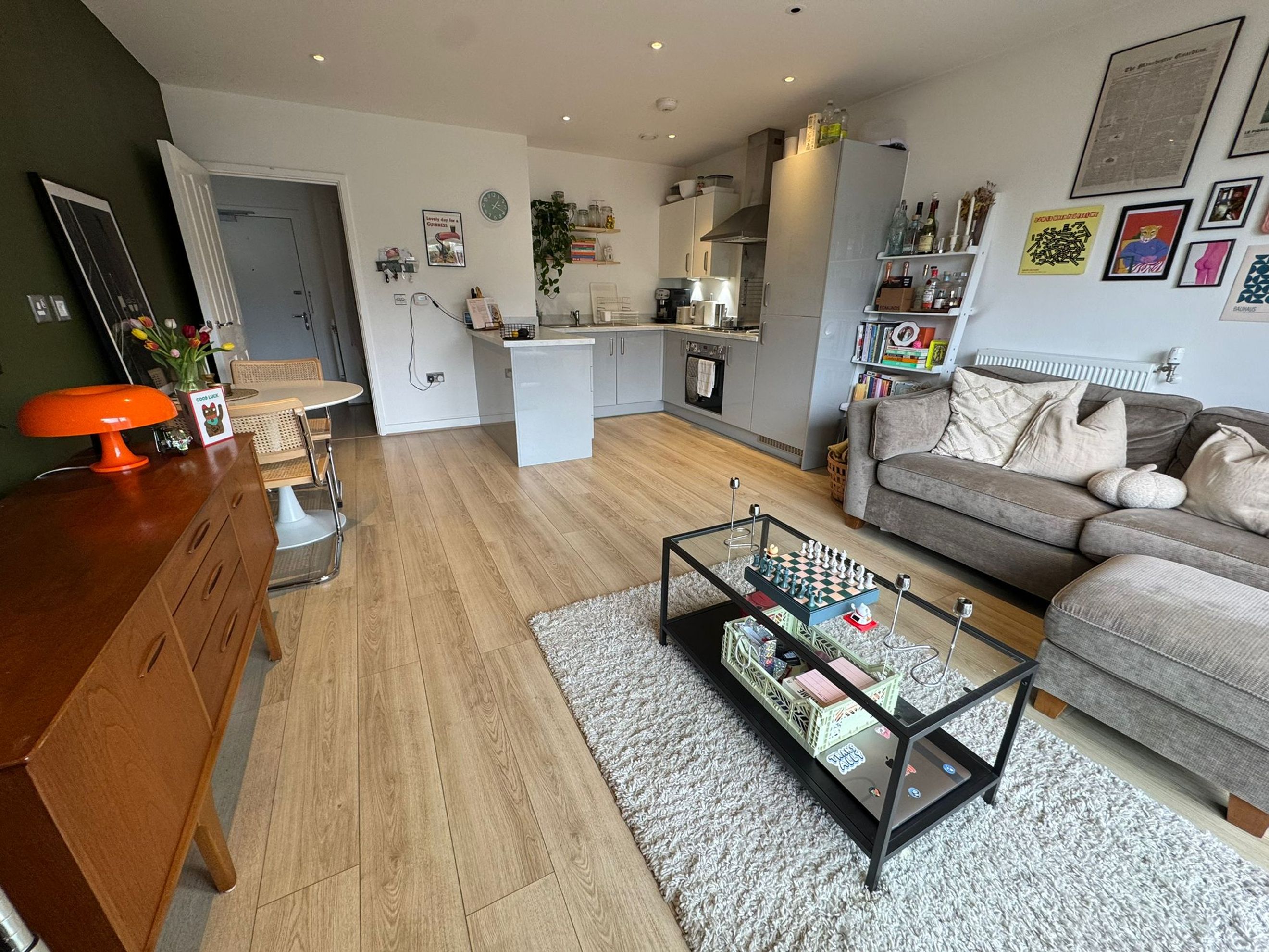 The apartment features a bright and spacious open‑plan living and dining area, a modern fitted kitchen, a well‑proportioned master bedroom, and a contemporary bathroom with a shower over the bath. It also benefits from a private balcony.