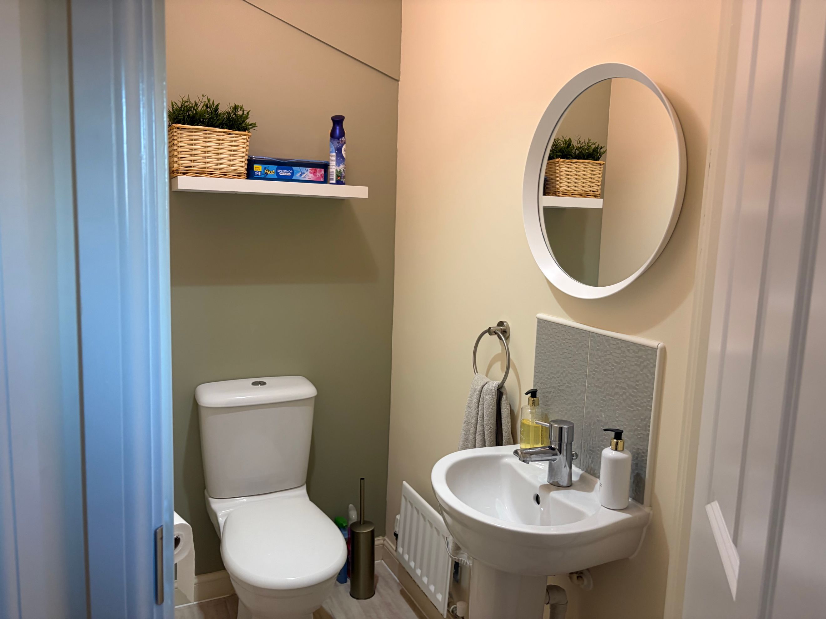 There's a ground floor toilet, accessible from a separate hallway. The hallway is separated from the living room by a door.