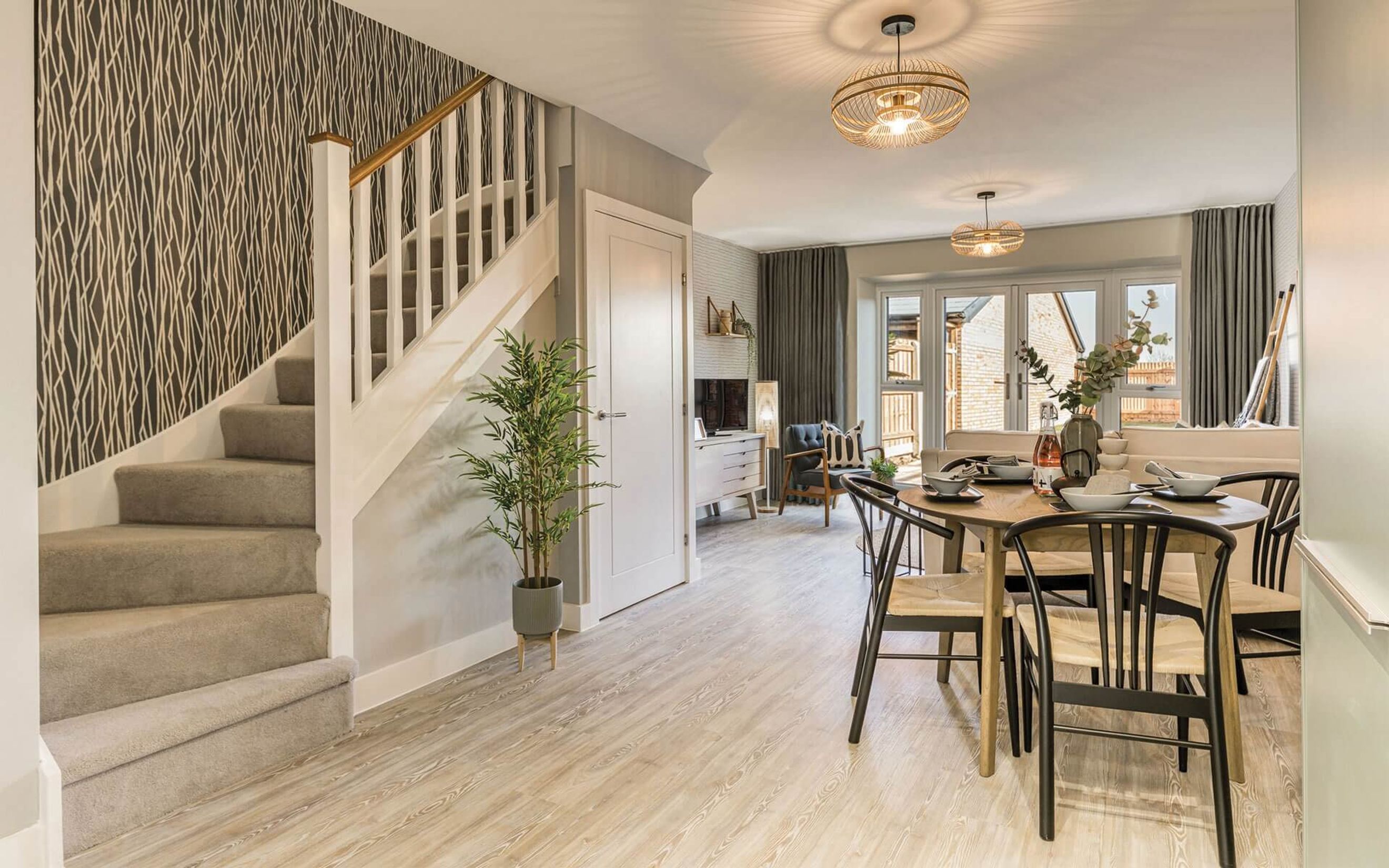 On the ground floor, you'll find a well-proportioned open-plan kitchen and dining area that flows seamlessly into a generous living space. It's a layout made for both everyday life and entertaining, with a bright, open feel and double doors that lead into the garden — extending your living area outdoors. You will also feel at home from day one, with a fully fitted kitchen complete with single oven, induction hob, integrated fridge/freezer and dishwasher. A downstairs cloakroom and handy storage cupboard complete this level.