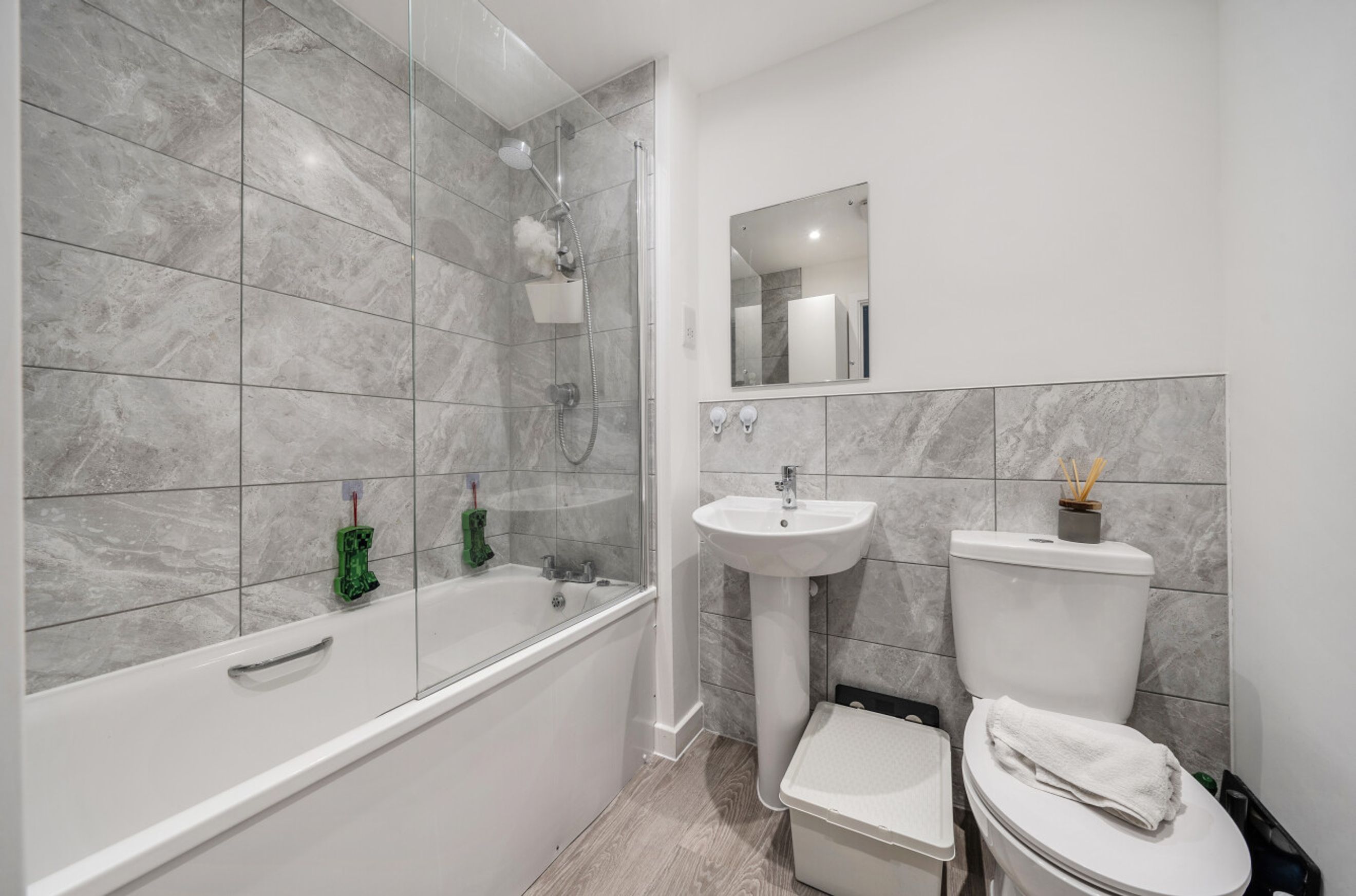 Upstairs, there are two comfortable bedrooms. The bathroom has a modern, white suite. You'll also have two parking spaces.