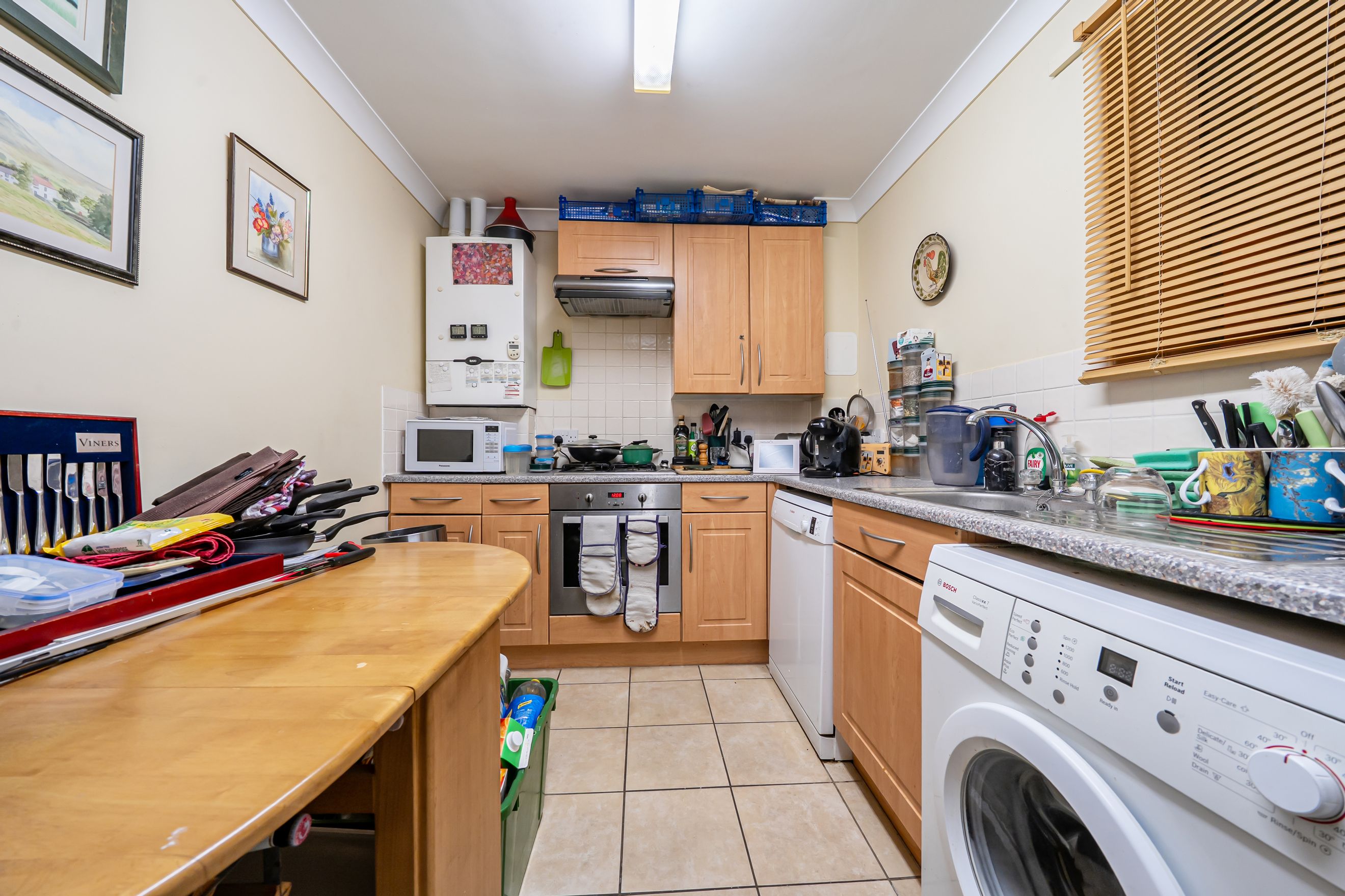 The property is thoughtfully arranged around a central hallway, creating a natural separation between living and sleeping areas. The generous reception room provides an inviting space for both relaxation and entertaining, with direct access to the balcony—ideal for enjoying a morning coffee or unwinding at the end of the day. The adjoining kitchen is neatly configured and well-proportioned, offering ample workspace and storage.