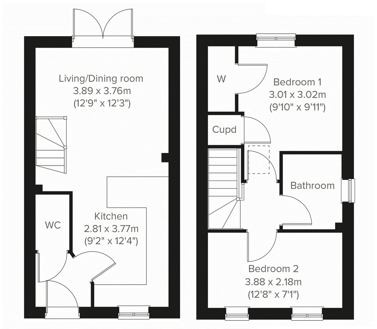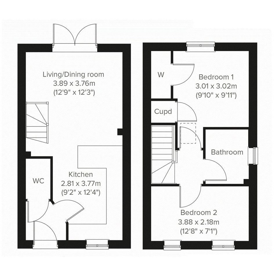 A well-designed two-bedroom home offering practical, modern living. The entrance hallway leads directly into a spacious kitchen, providing plenty of room for meal preparation and casual dining. A generous living and dining room provides an inviting space featuring double doors that open onto the garden, ideal for enjoying natural light while creating a combined indoor-outdoor space. A convenient downstairs WC is thoughtfully positioned off the hallway.