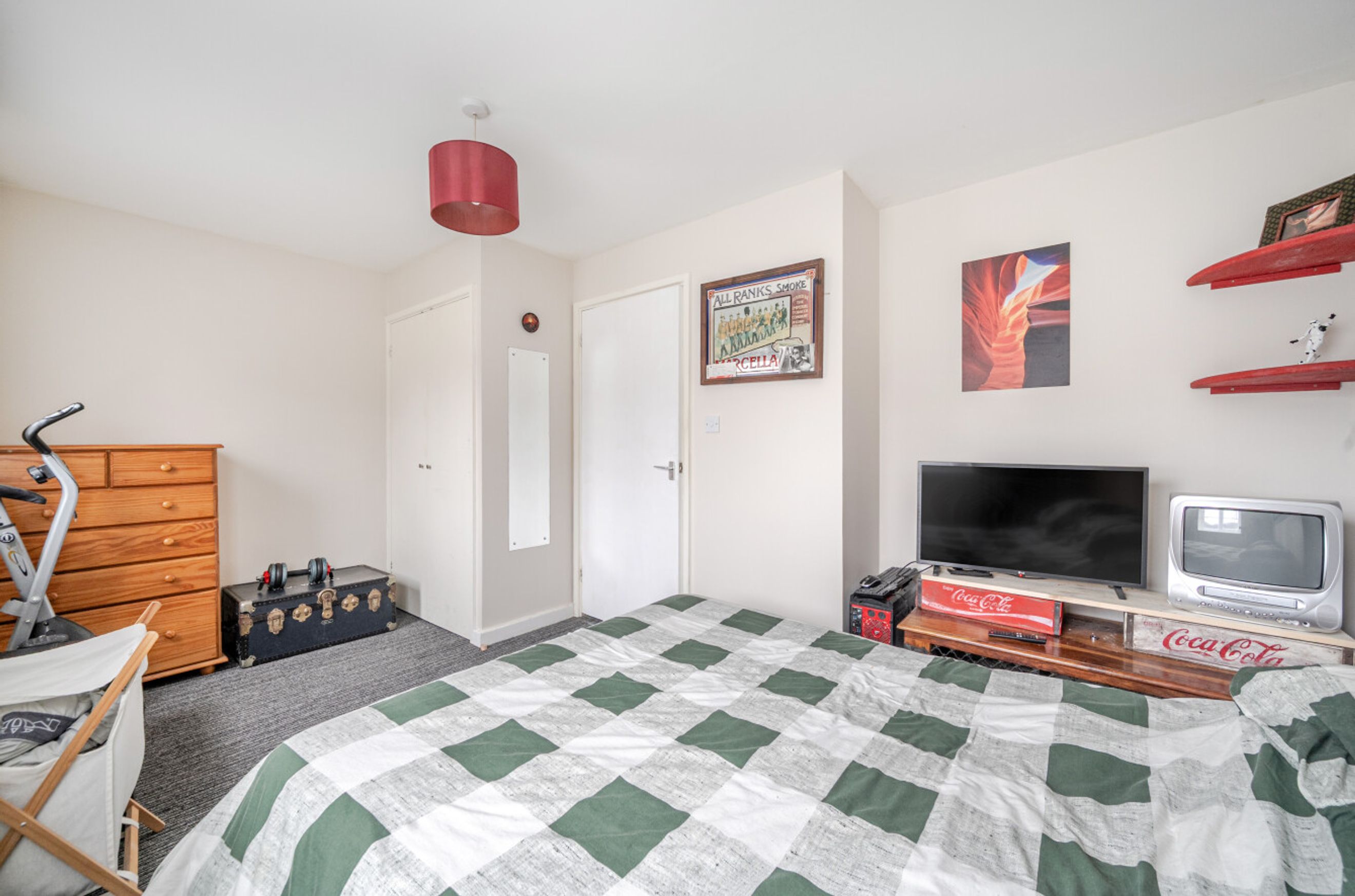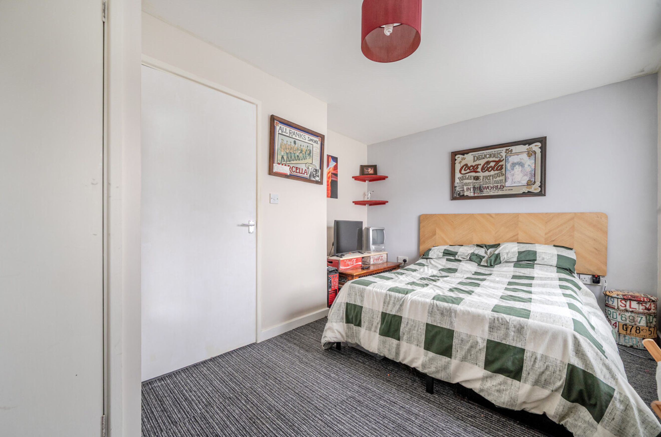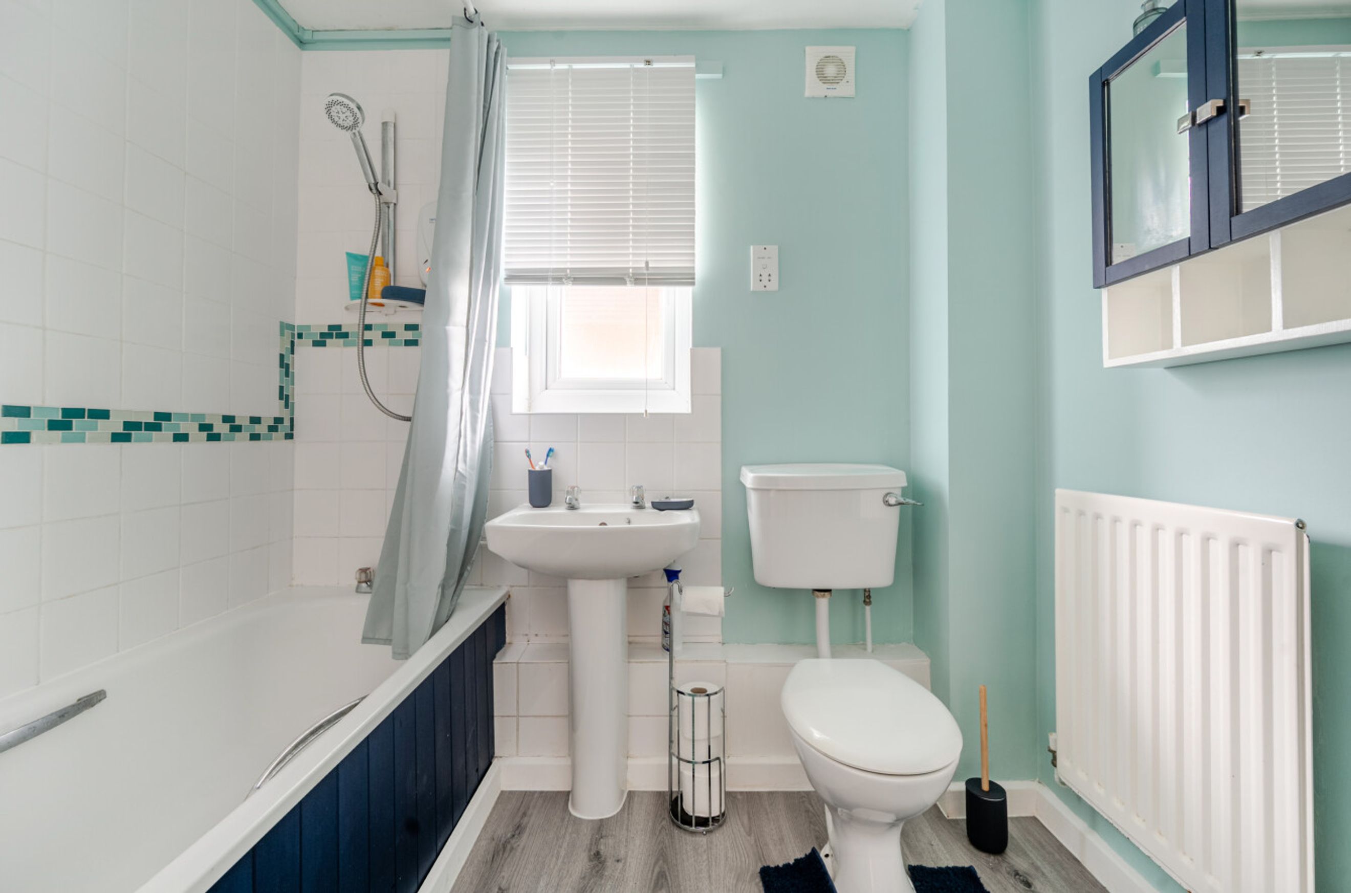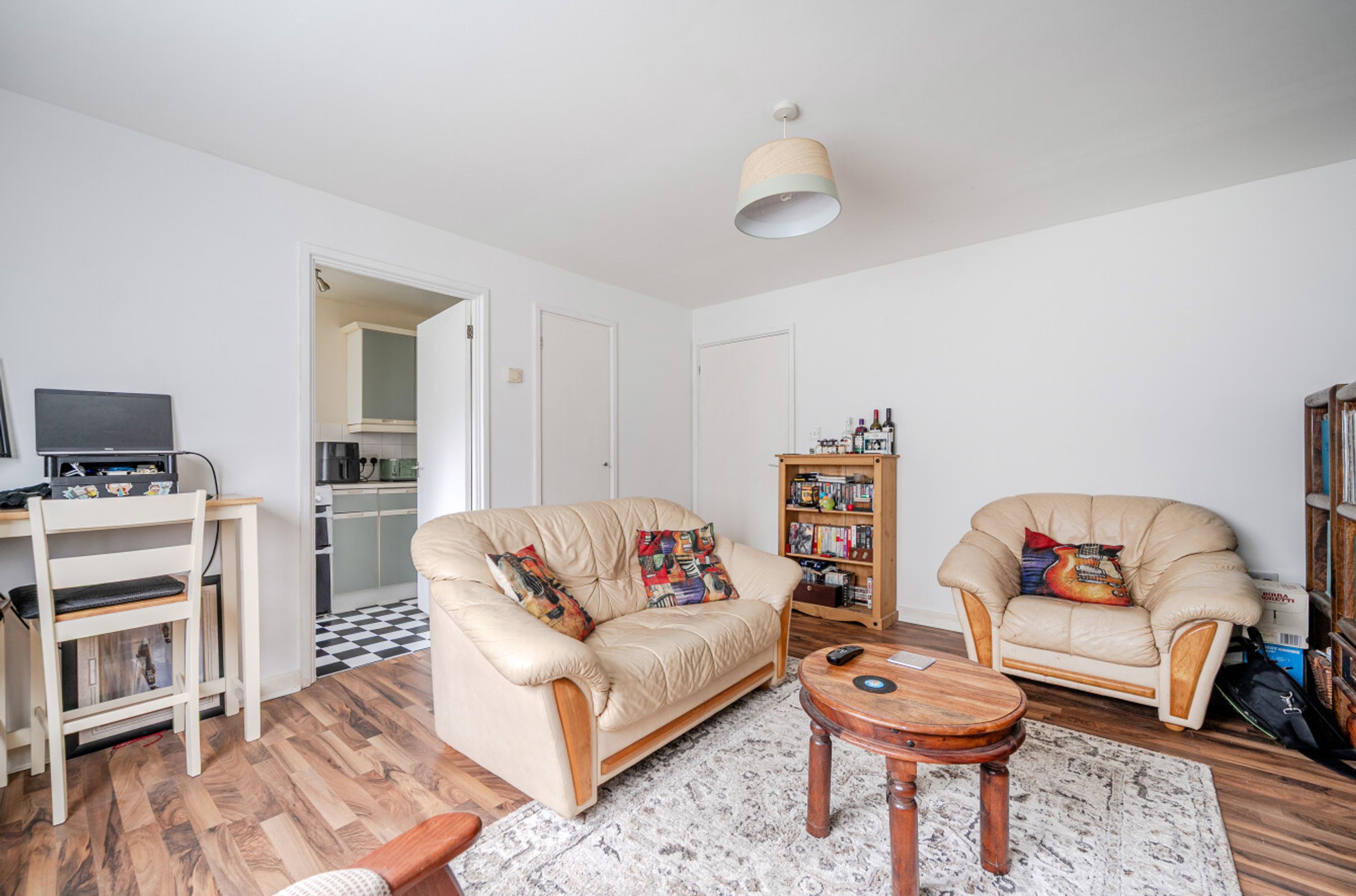 The separate fitted kitchen sits just off the living area and offers practical worktop space and storage, ideal for everyday cooking. The double bedroom is well proportioned, with room for wardrobes and additional furniture, while the bathroom features a full suite including bath with overhead shower.