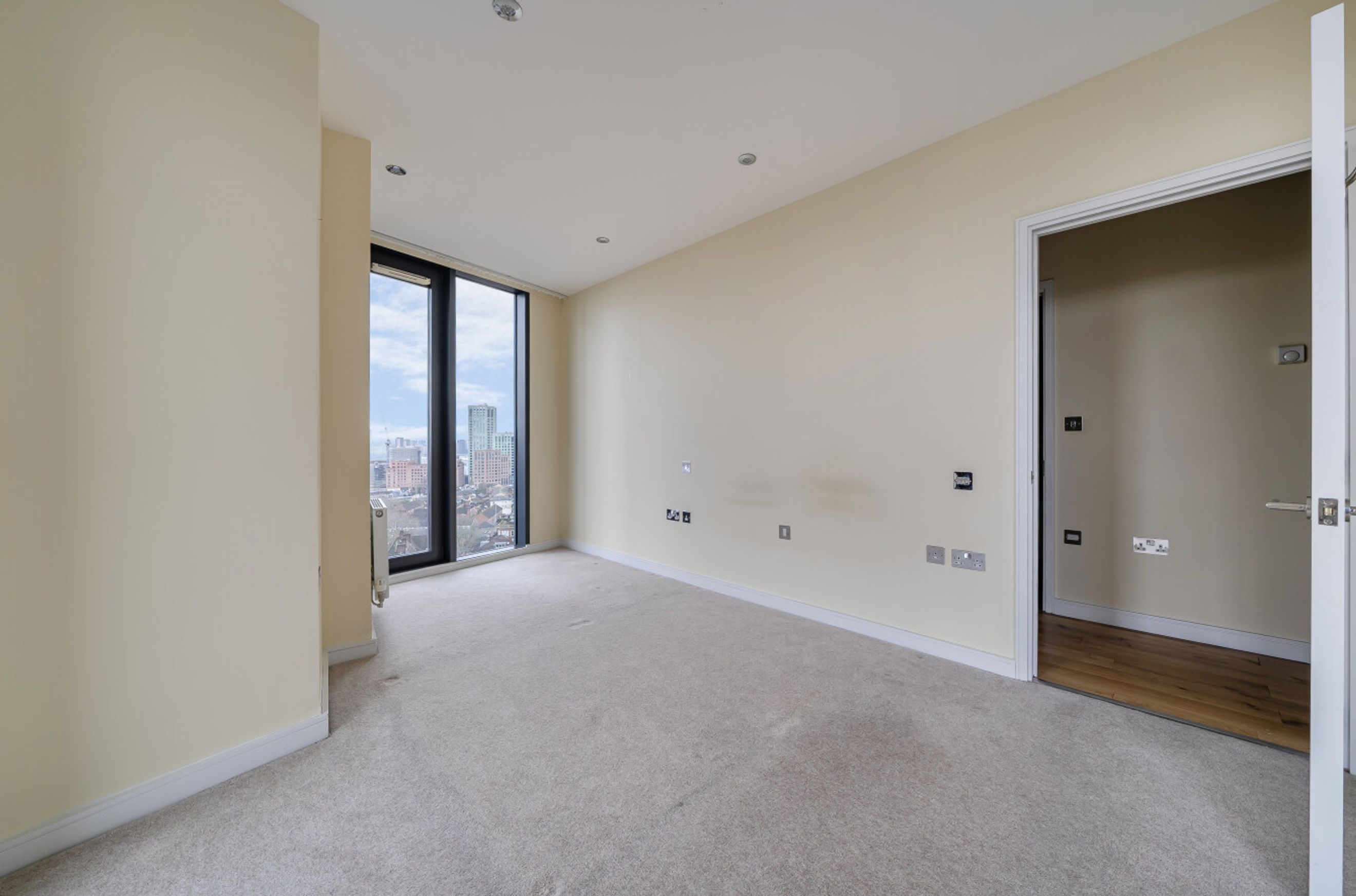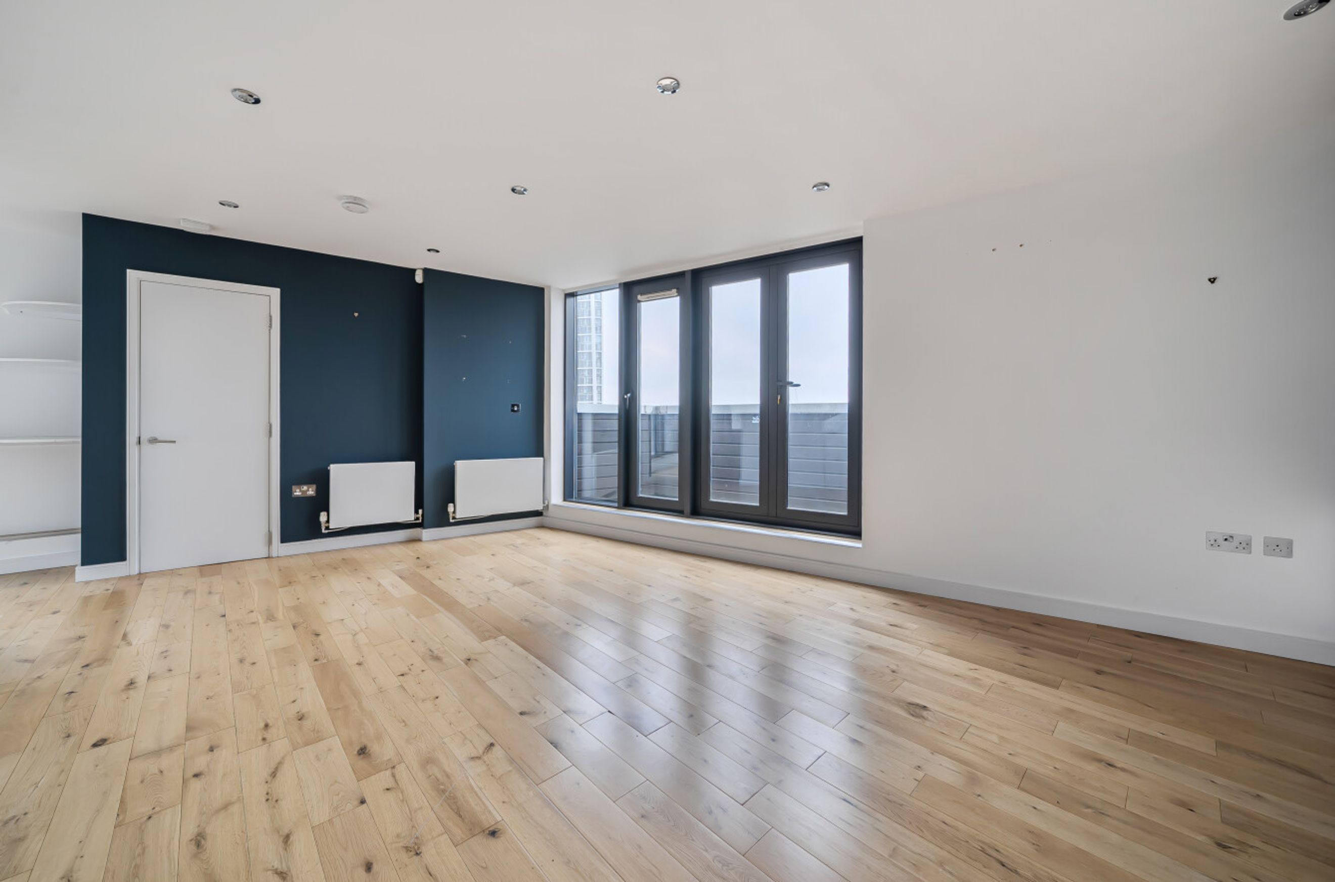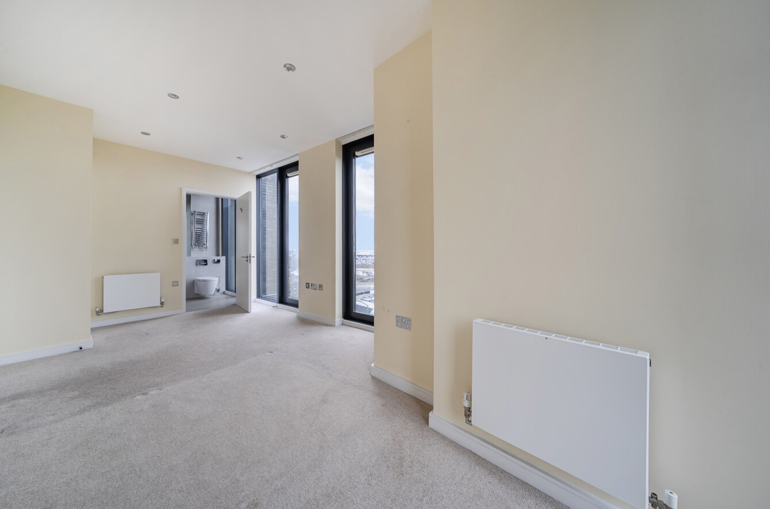 This split-level apartment at Taylor Place is arranged over two upper floors and offers a distinctive layout with strong separation between living and sleeping areas. Entry is on the lower level, where a central hall leads into a bright reception room positioned along the outer edge of the building. The room benefits from an angled exterior wall that helps maximise natural light and gives the space an open, airy feel. From here, doors open onto a private balcony, creating a natural extension of the living area and providing space for seating or plants.